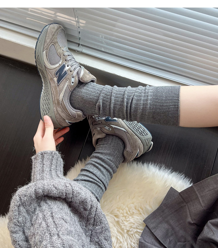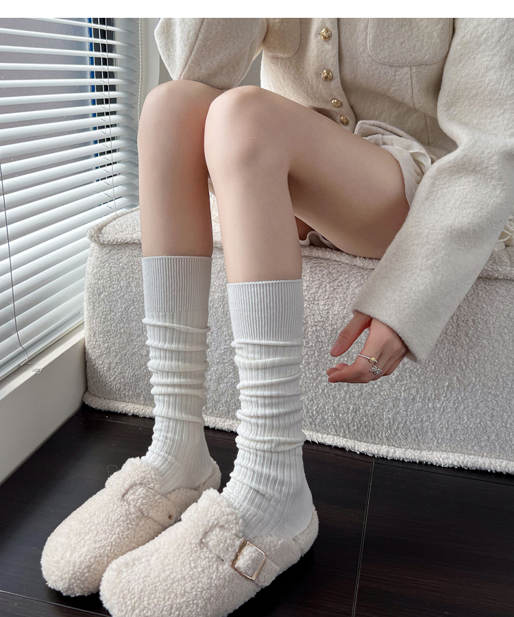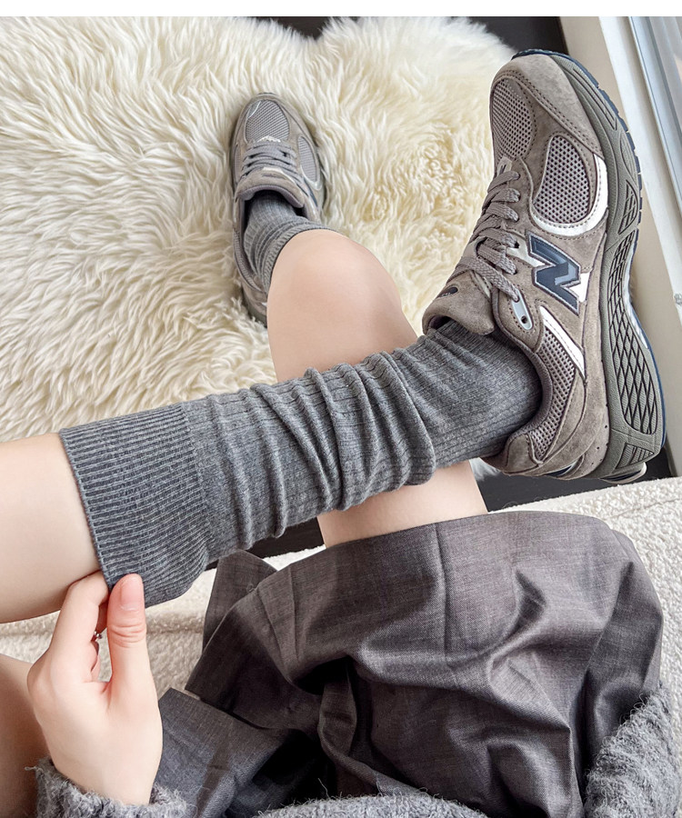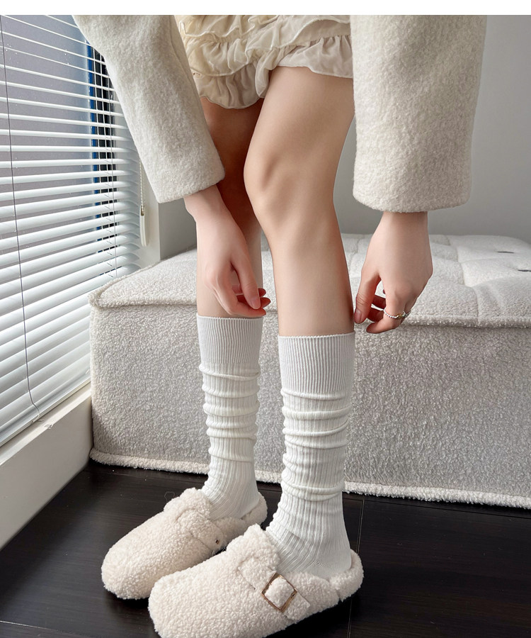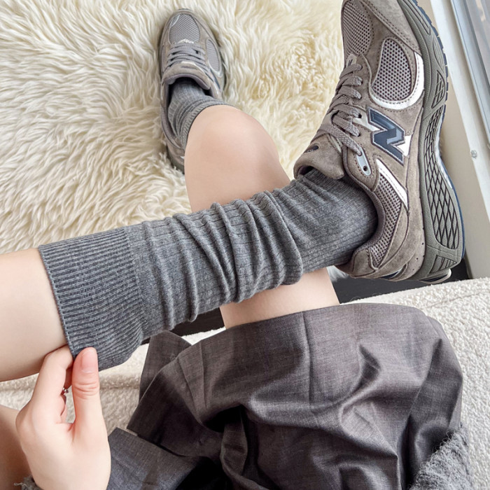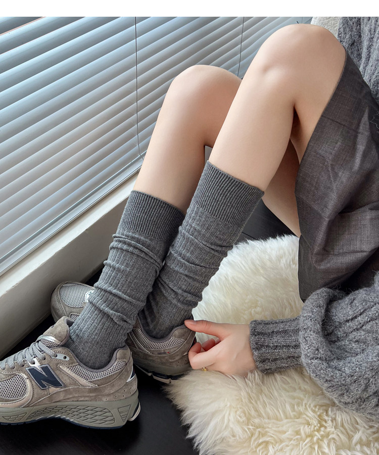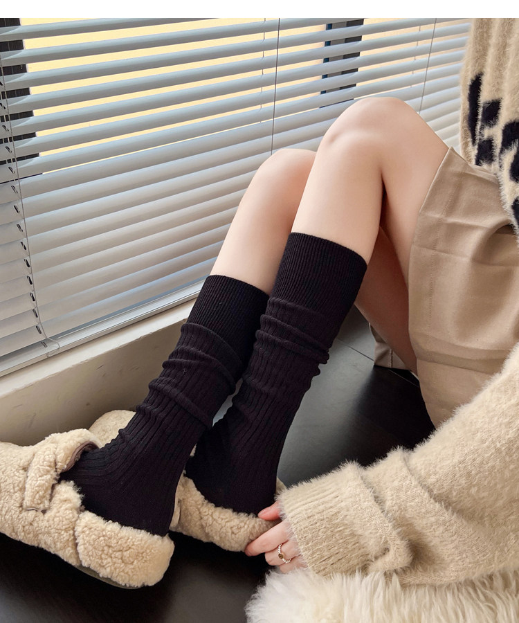 秋冬美拉德咖色系小腿襪女棉條紋米白色堆堆襪子及膝灰色中長筒襪