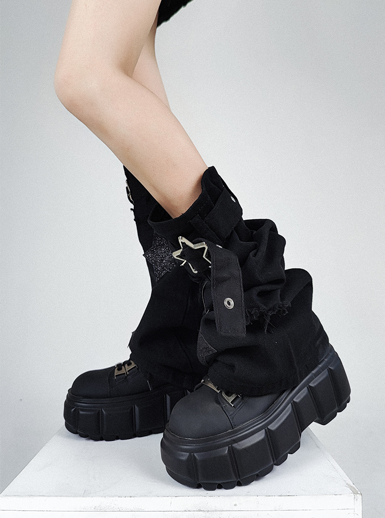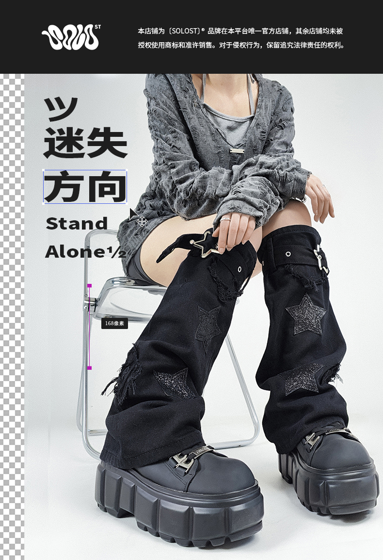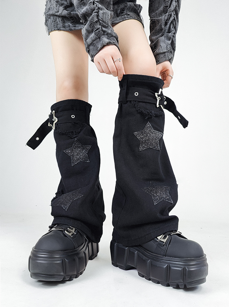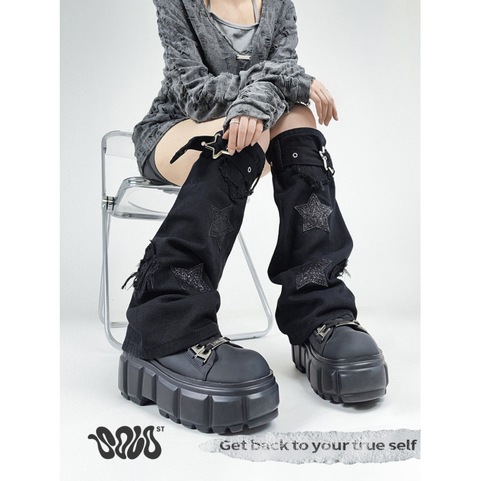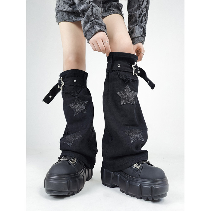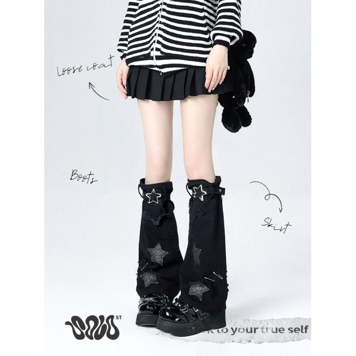 Solost 星星皮釦黑色牛仔腿套女款春夏亞文化y2k辣妹拖地堆堆襪套