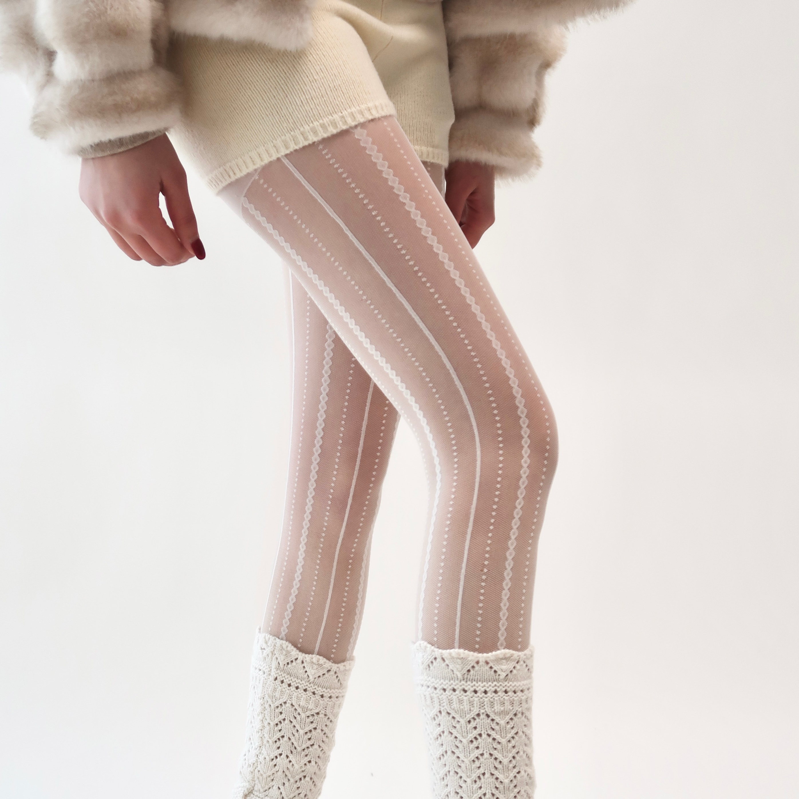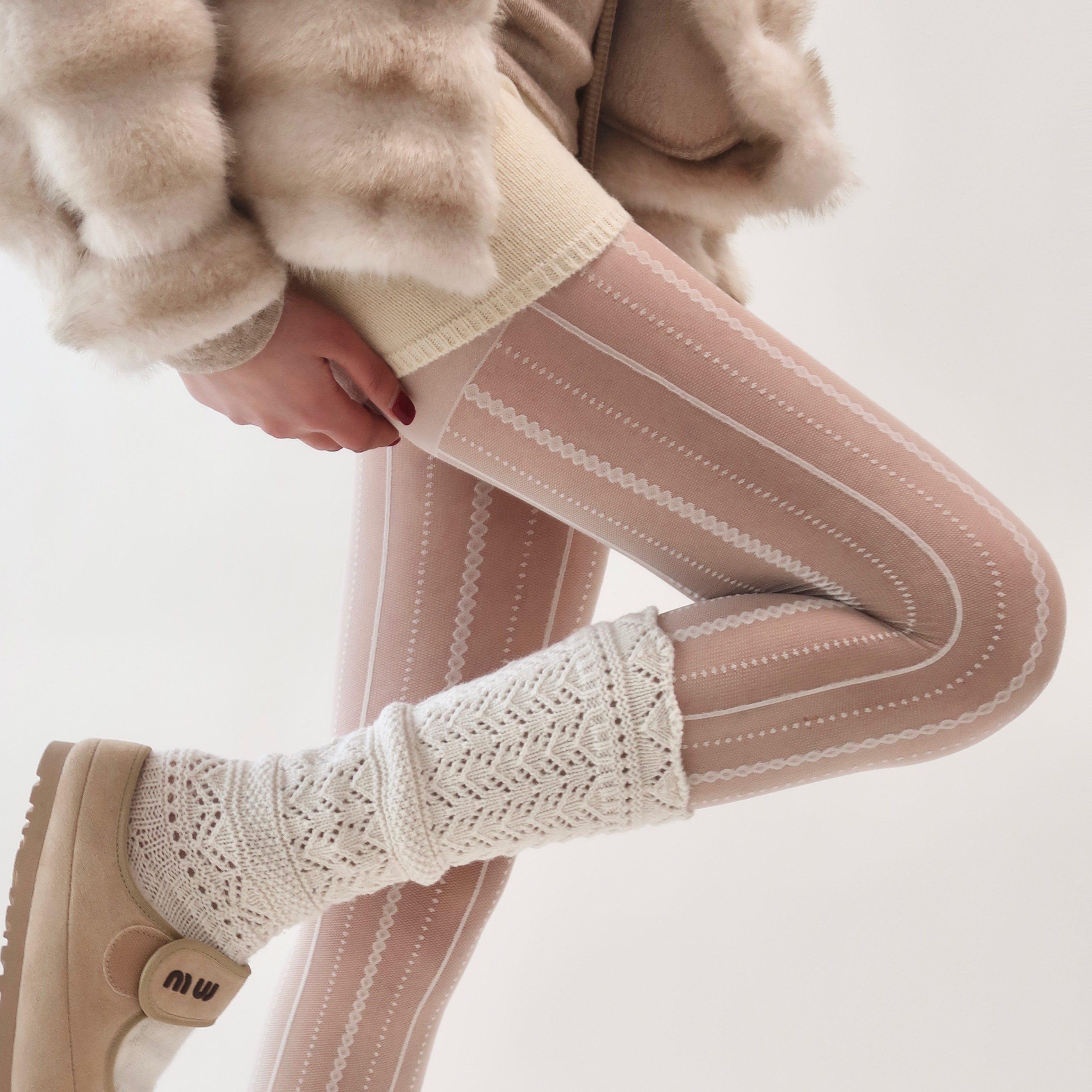 陸甜茶復古麻花條紋蕾絲白色女士絲襪春秋款天鵞絨防勾絲連褲襪