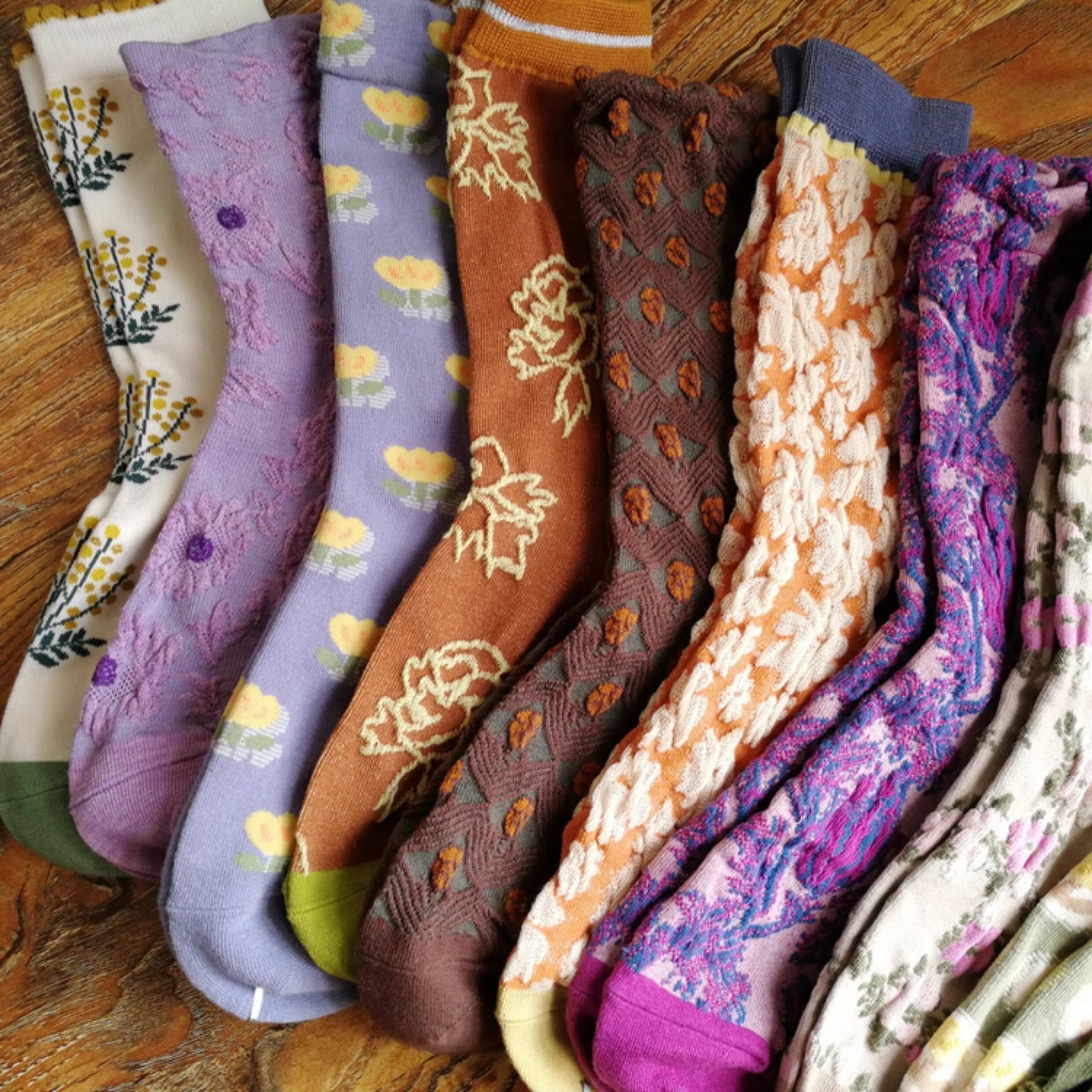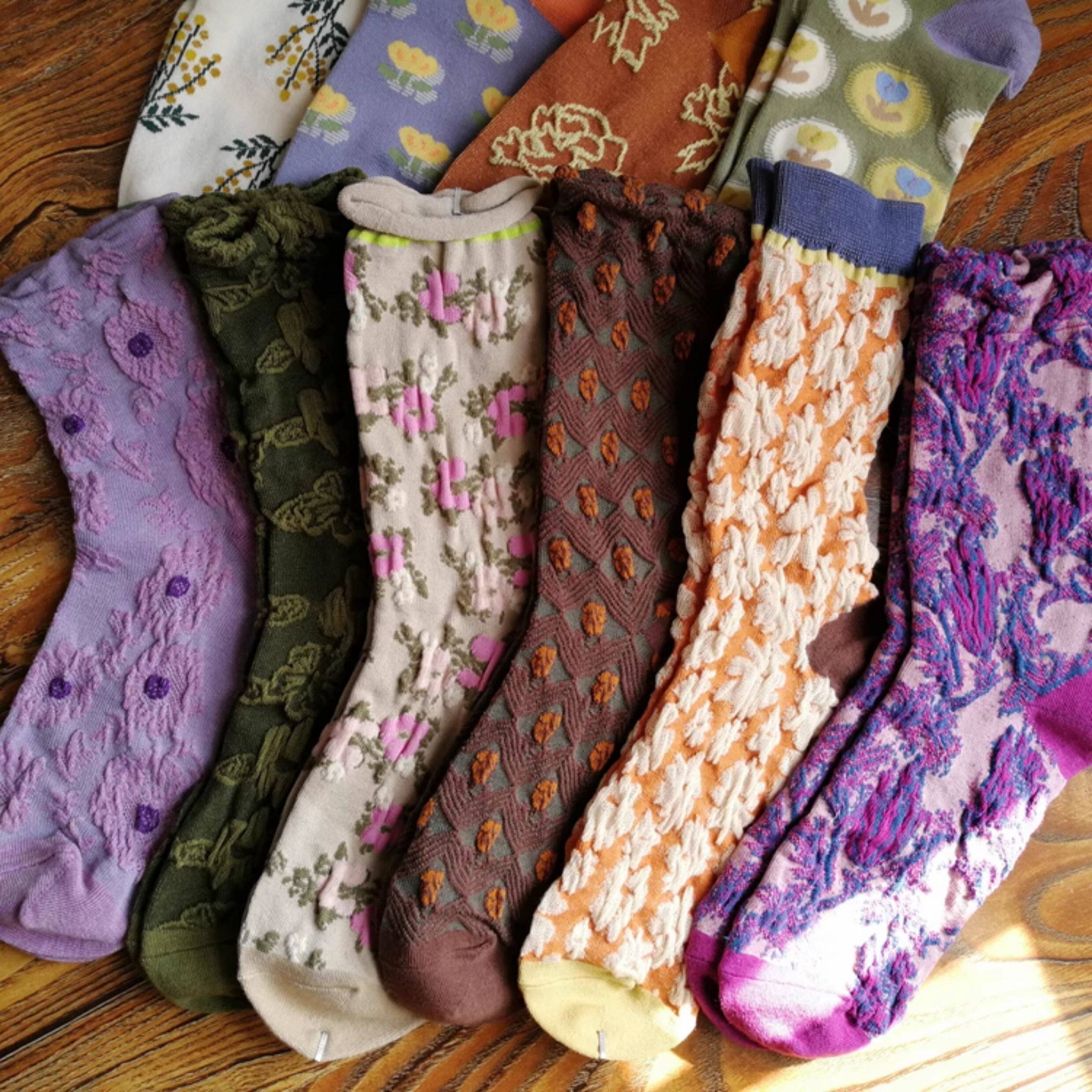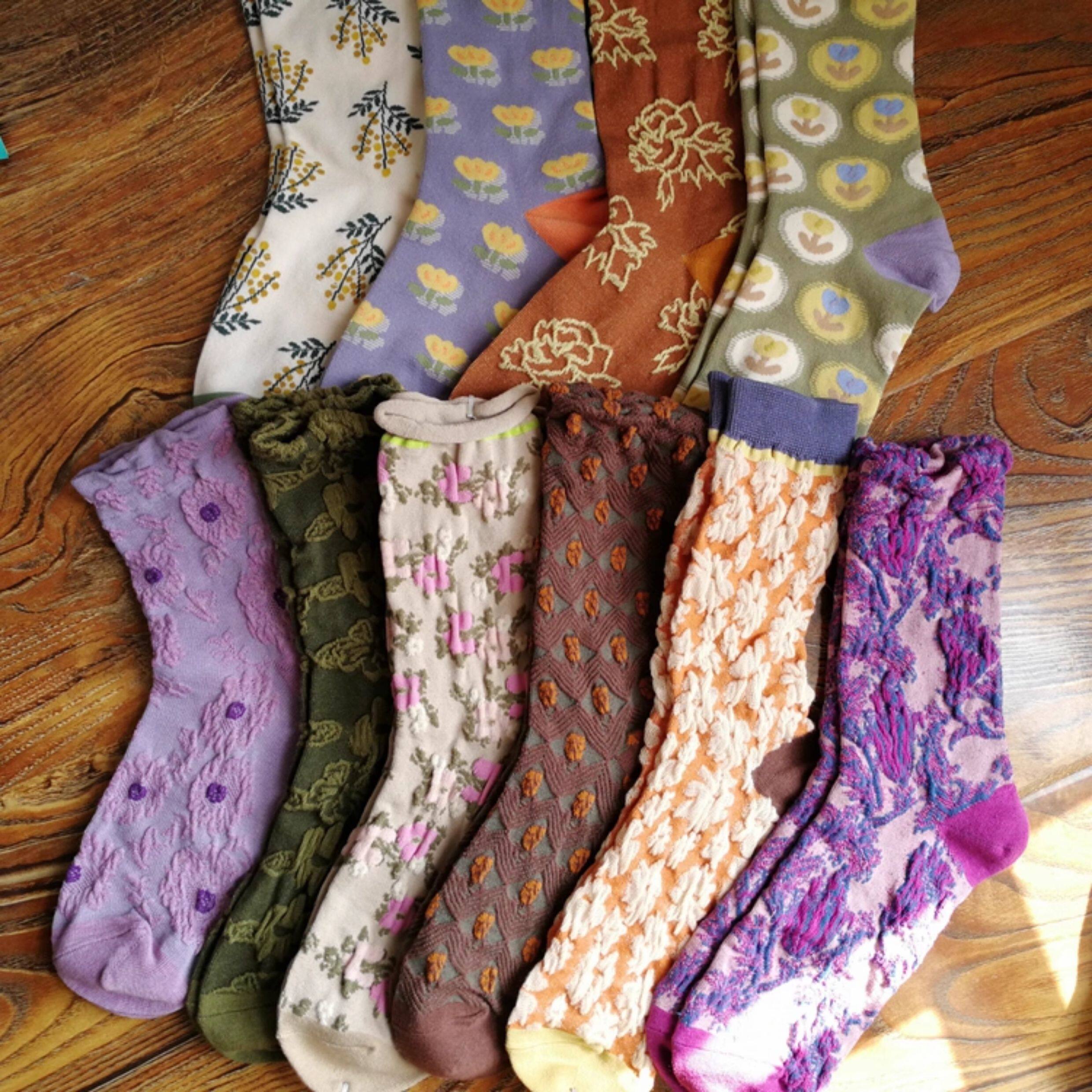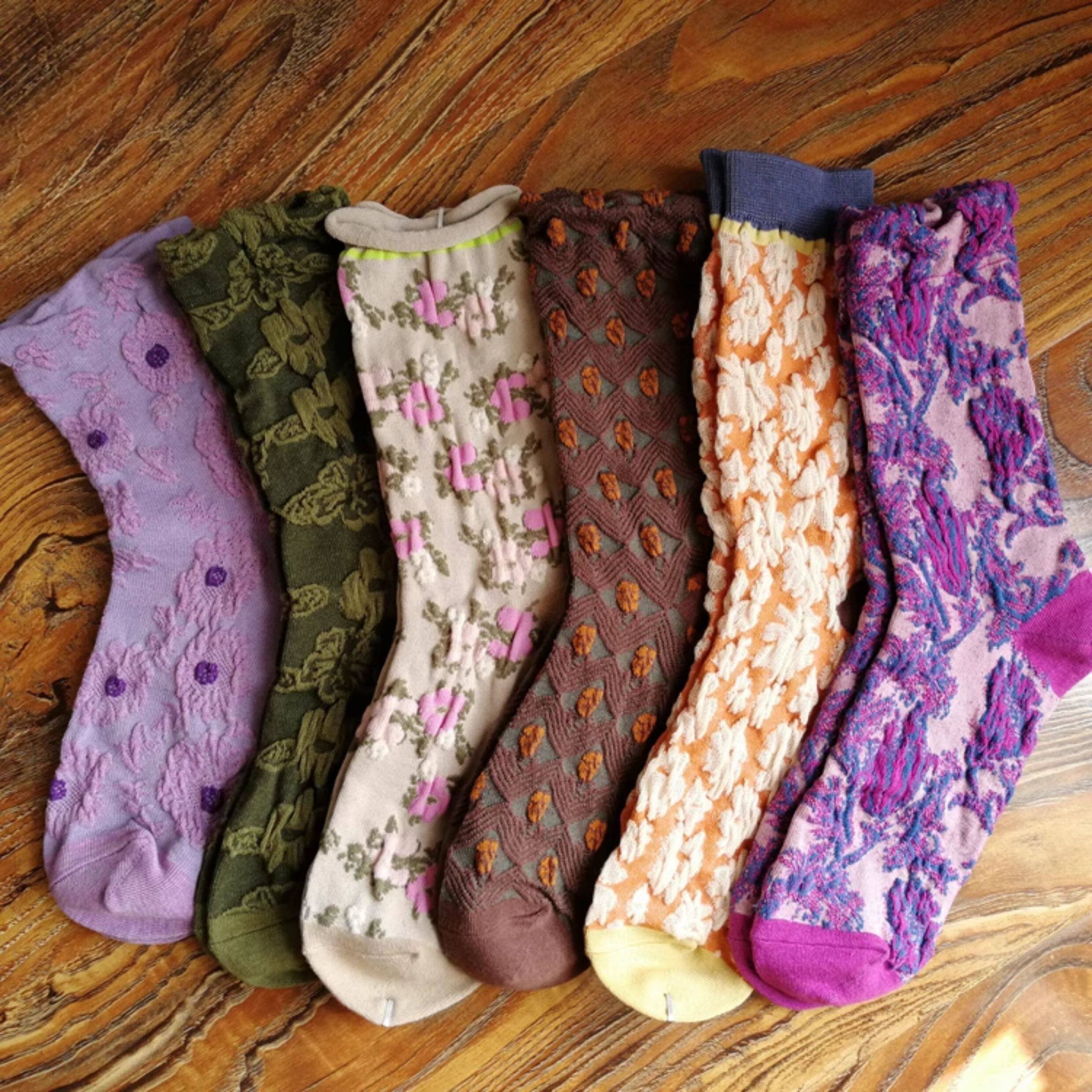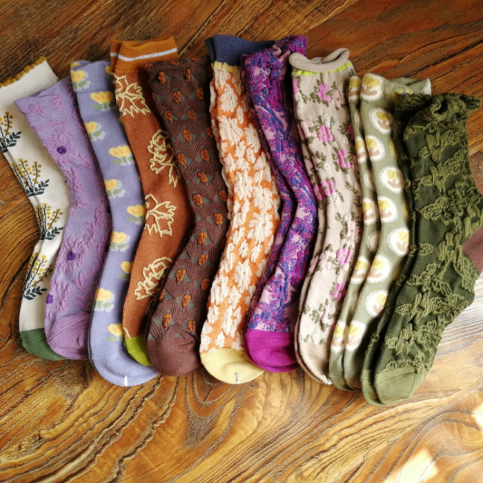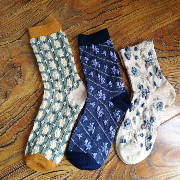 春秋棉襪田園風甜美漂亮花朵小花女襪浮雕女中筒襪子個性ins