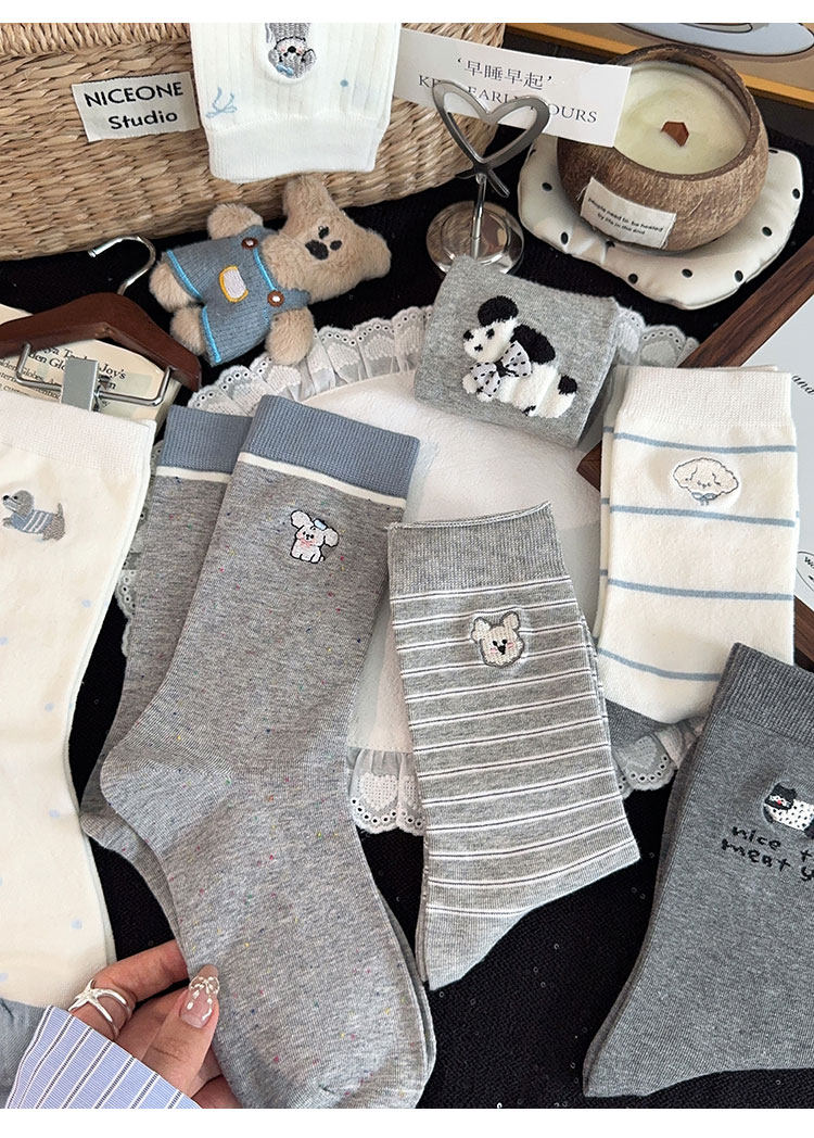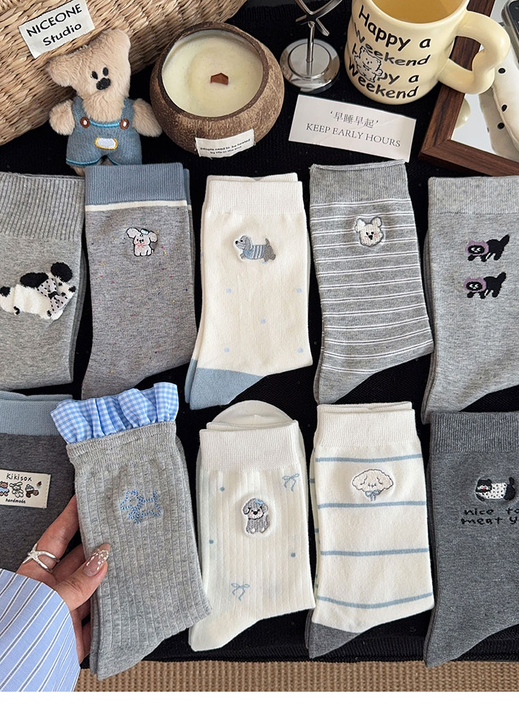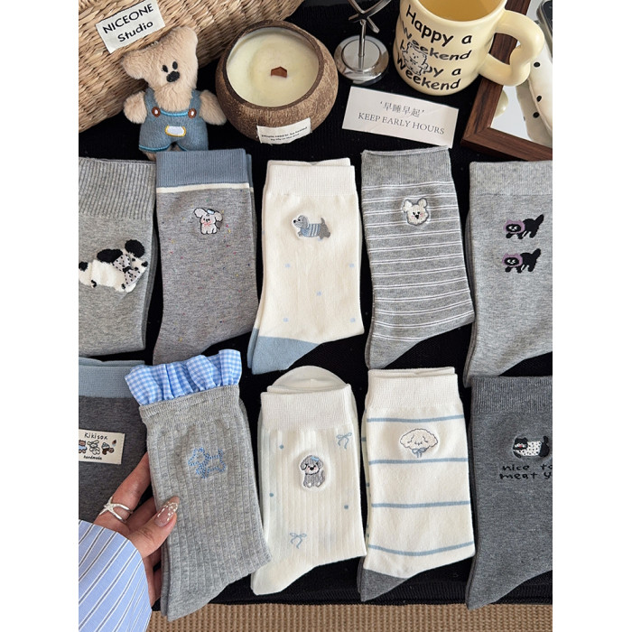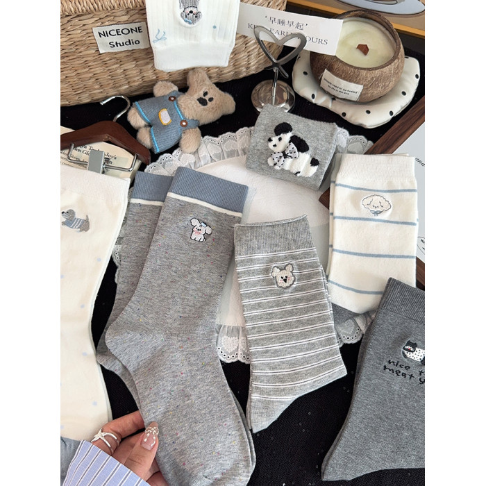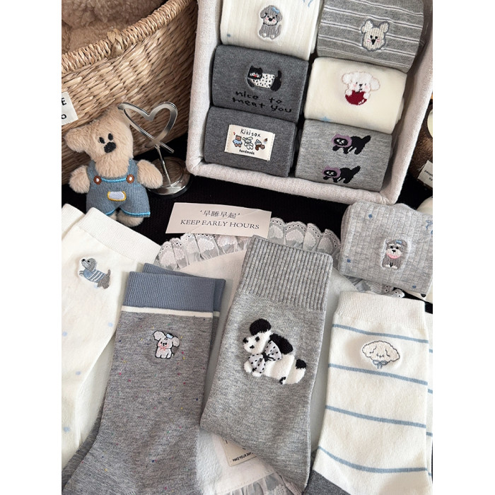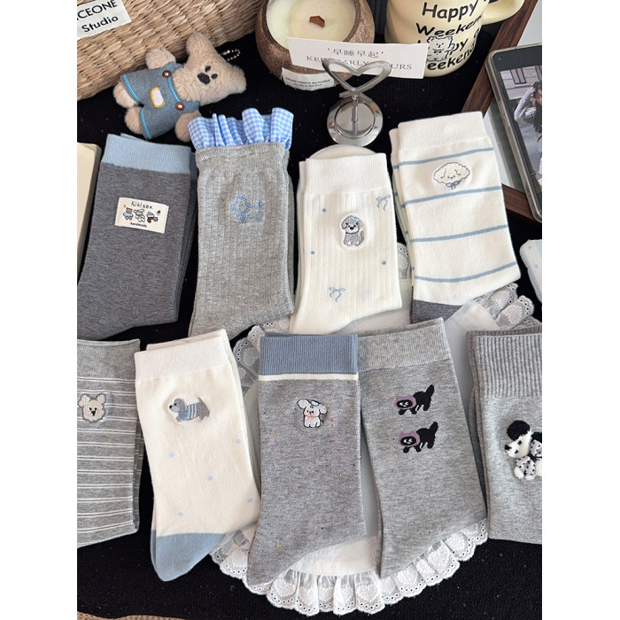 新款刺綉小狗襪子女中筒襪ins潮棉襪春秋灰色可愛卡通蝴蝶結長襪