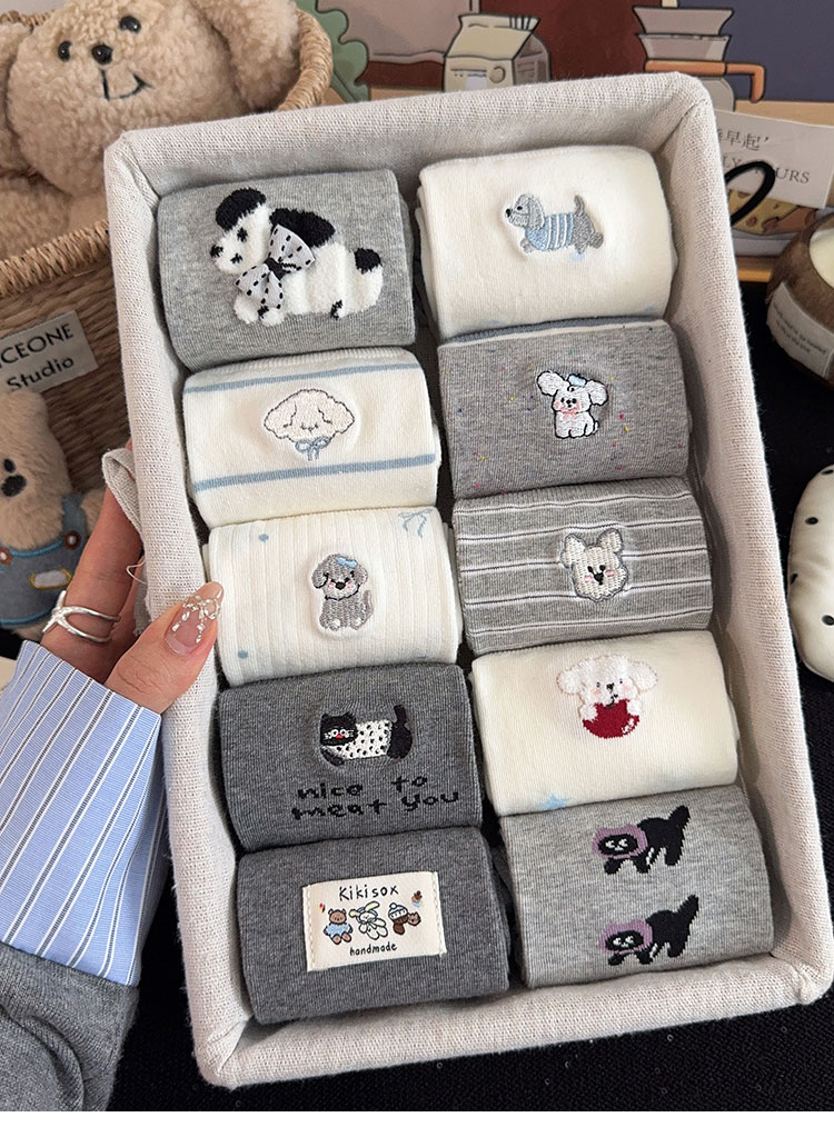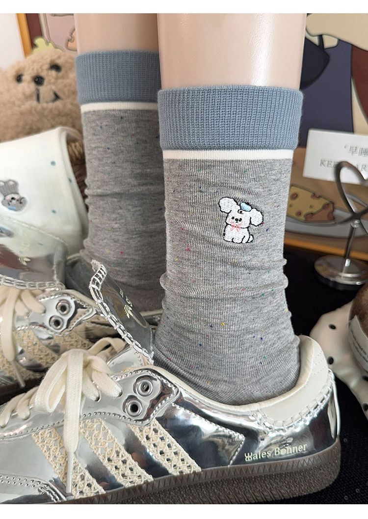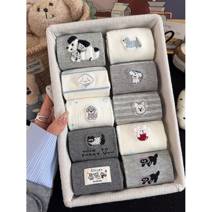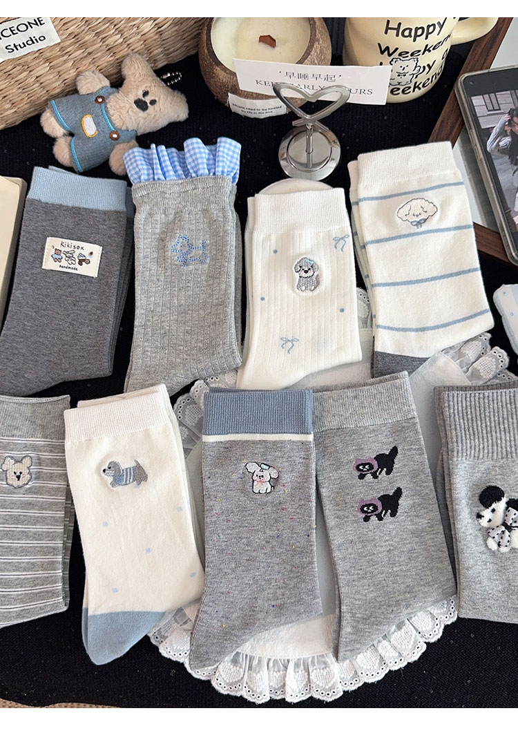 新款刺綉小狗襪子女中筒襪ins潮棉襪春秋灰色可愛卡通蝴蝶結長襪