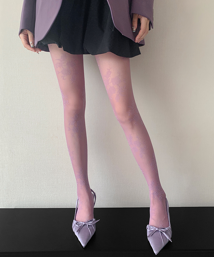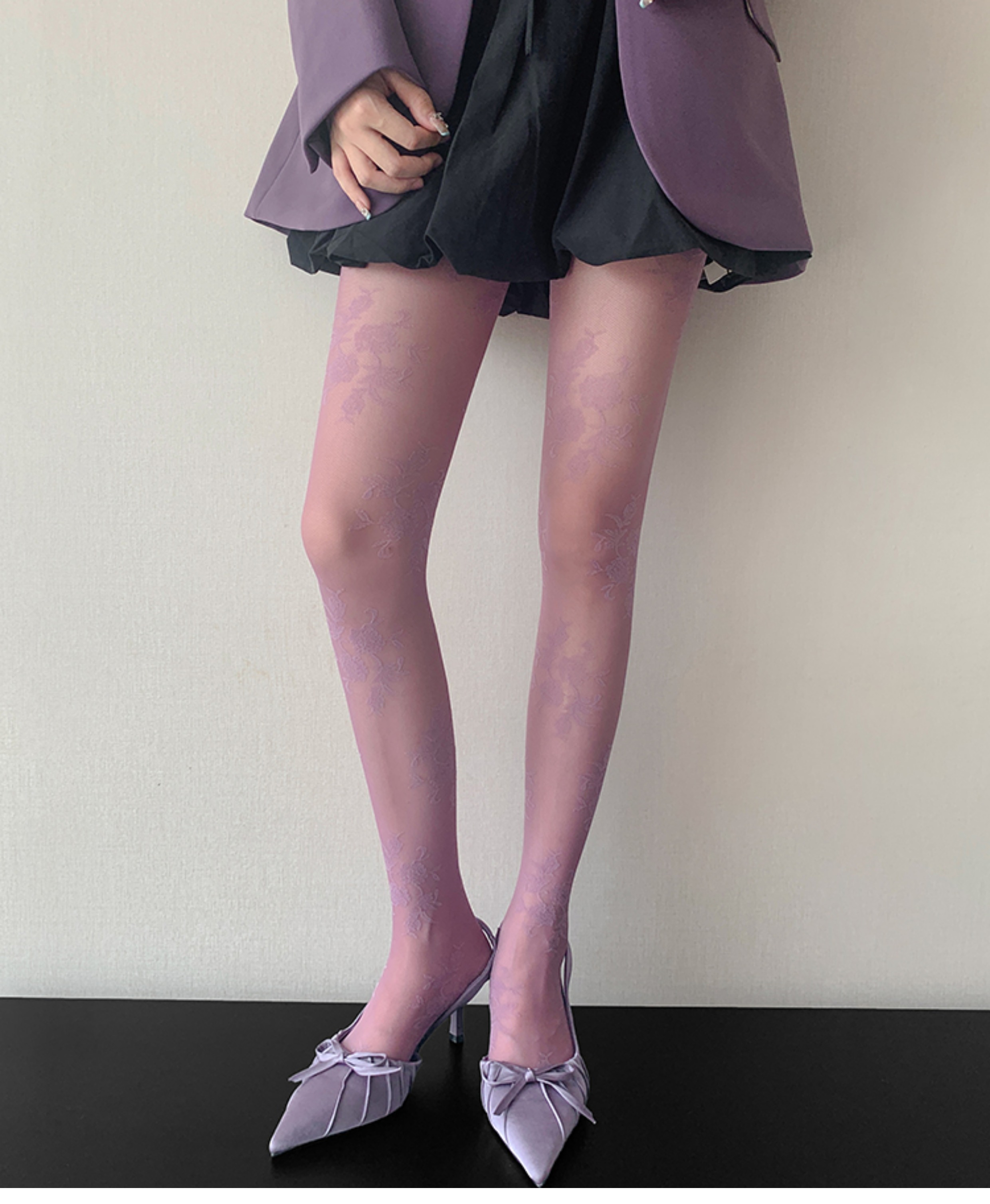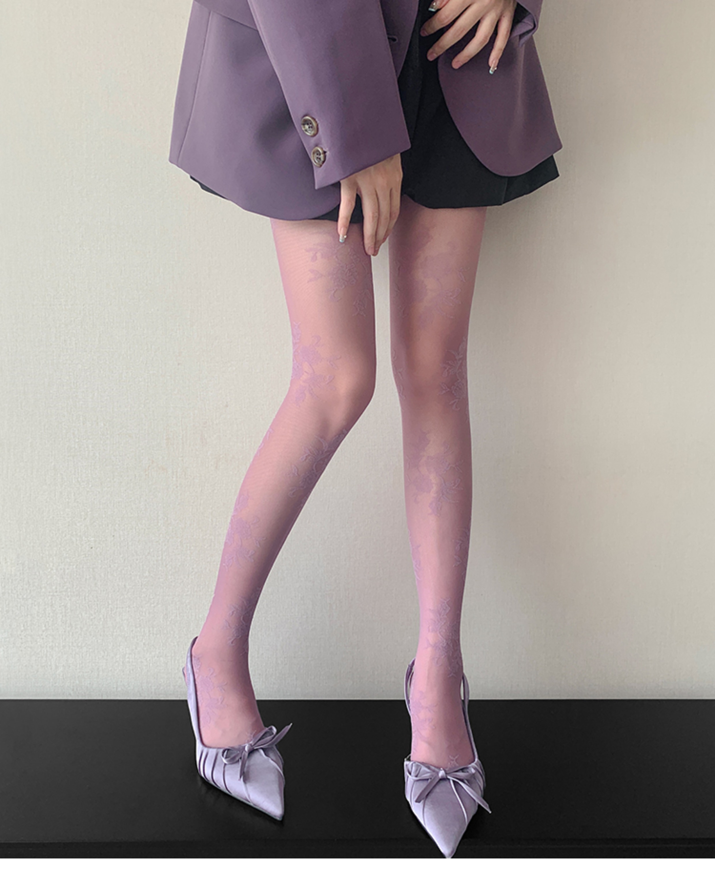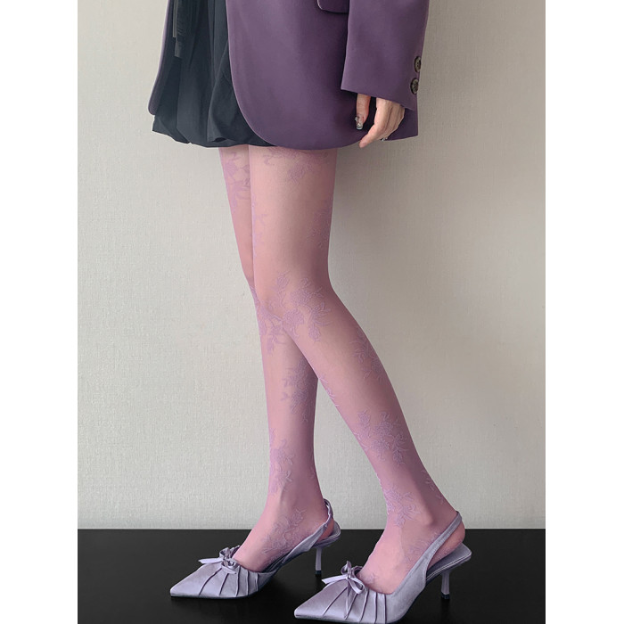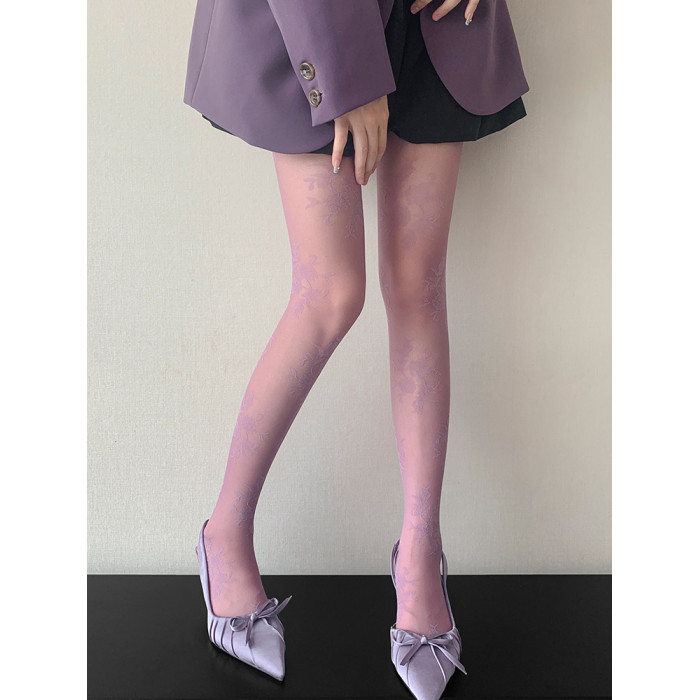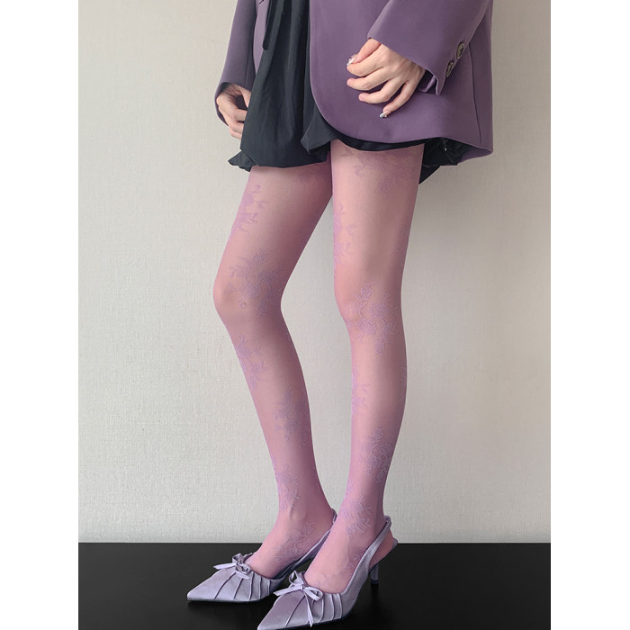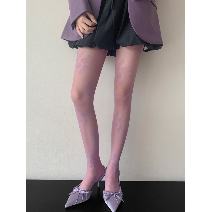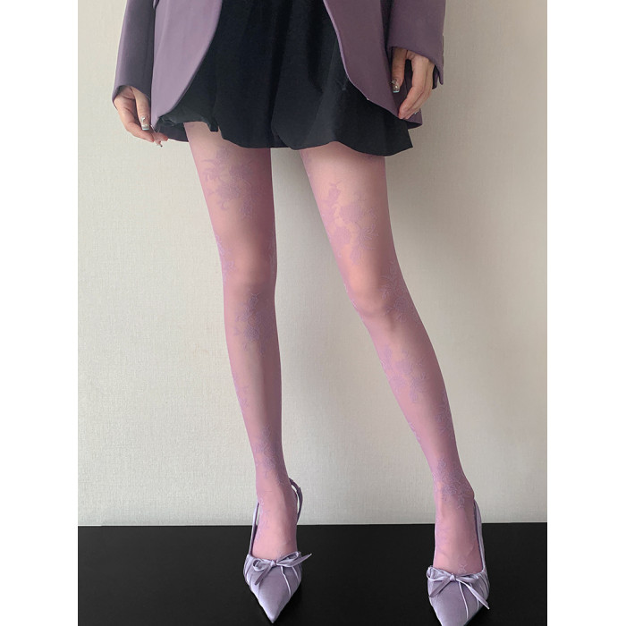 復古薔薇玫瑰花朵紫色連褲襪春秋款超薄性感辣妹提花絲襪女打底襪