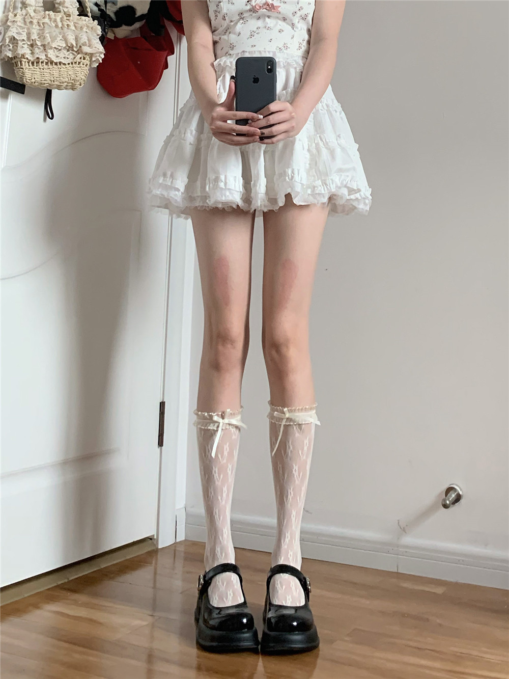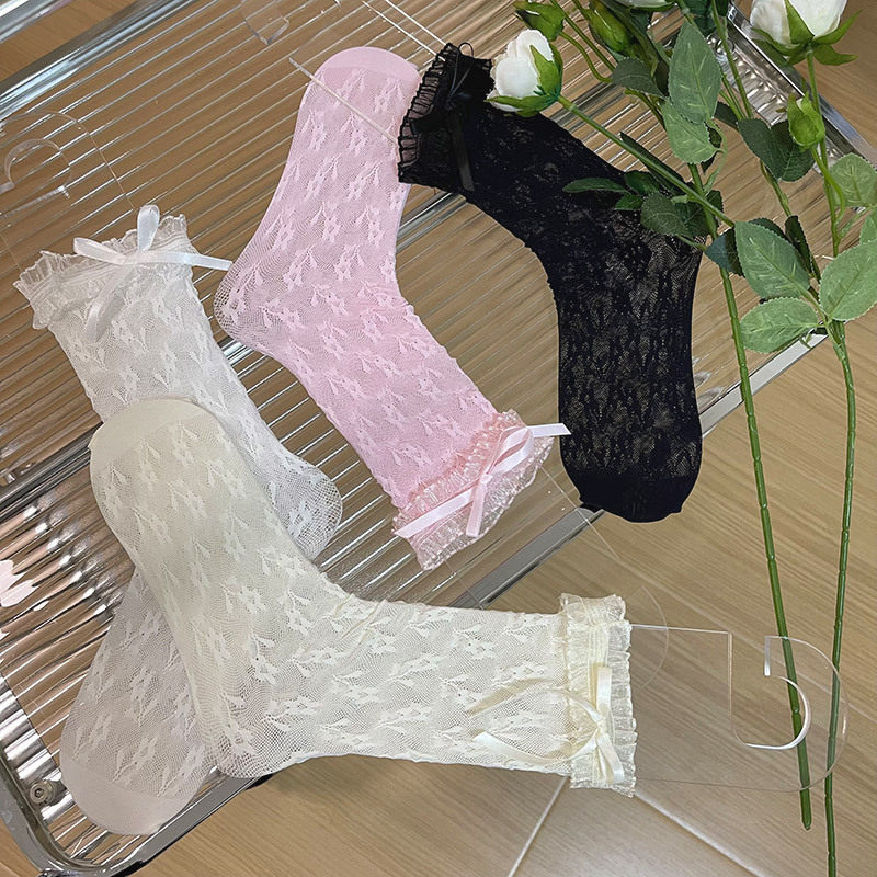 AY To films 夏季超薄少女蕾絲小腿襪可愛歐根紗中筒小花邊堆堆襪
