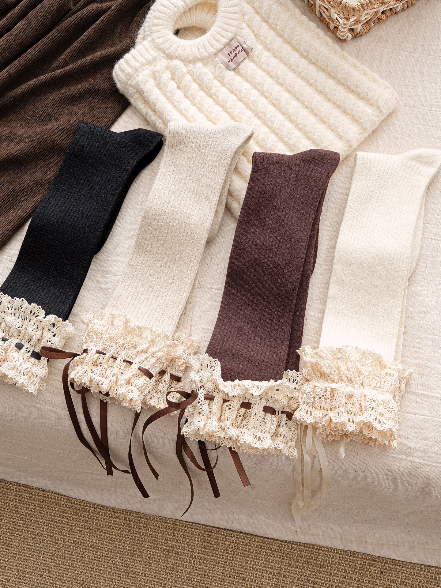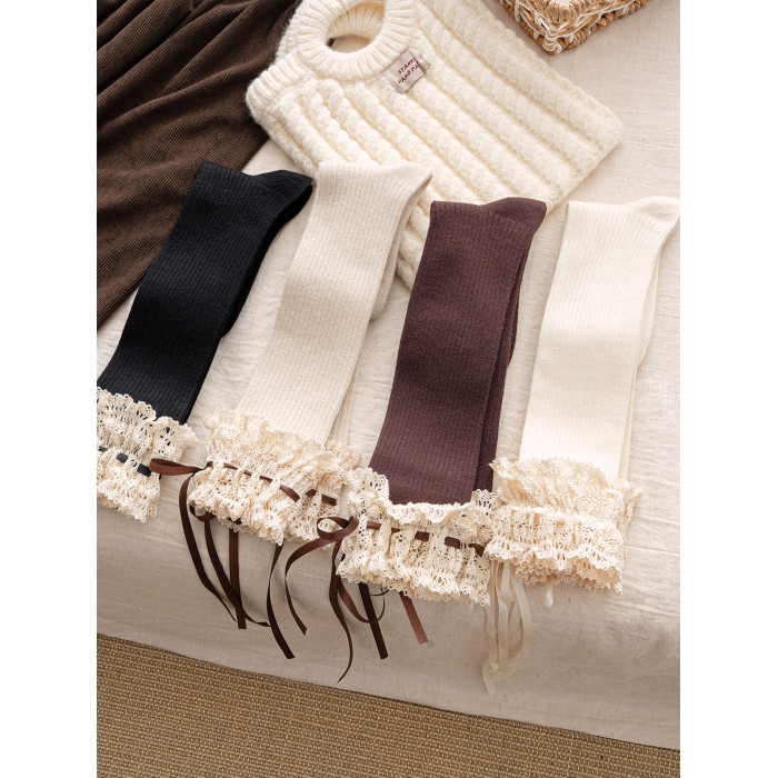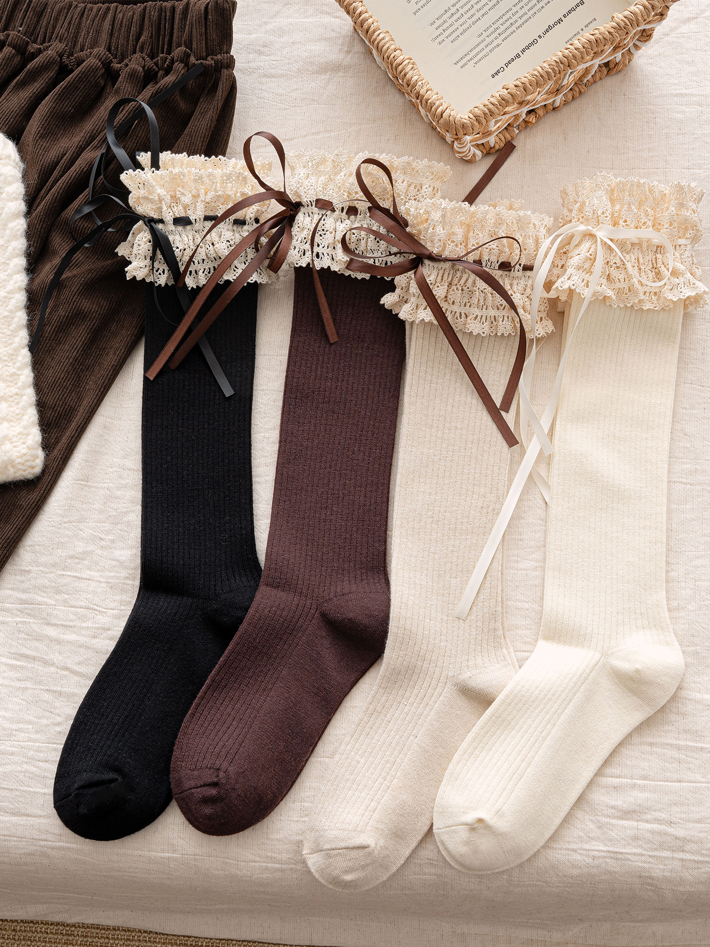 秋冬咖色蕾絲花邊中筒襪女奶白色竪紋顯瘦加厚保暖lolita小腿襪子