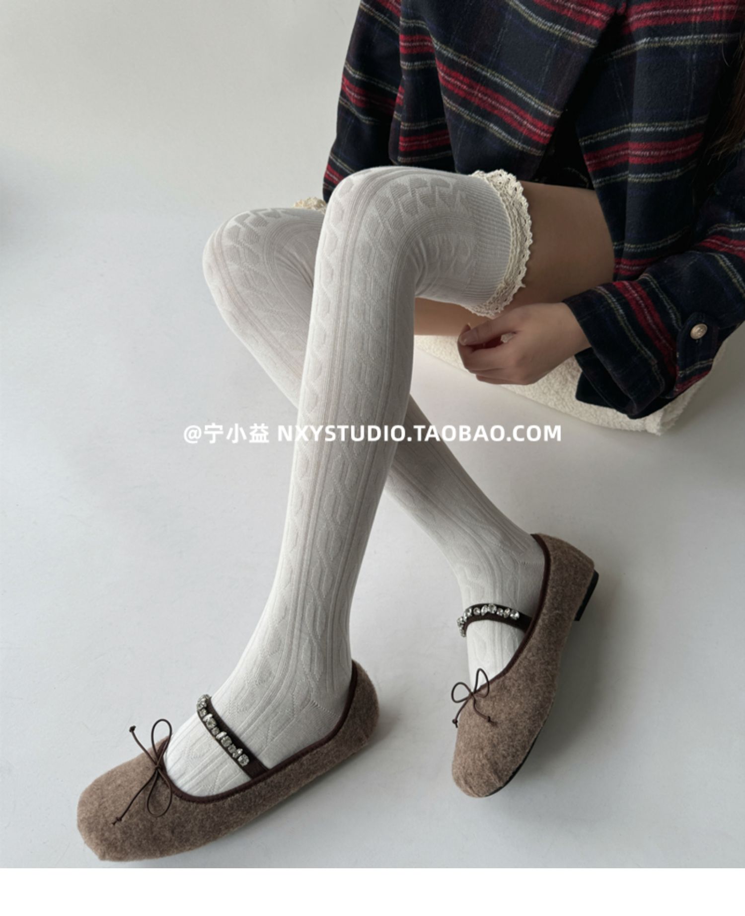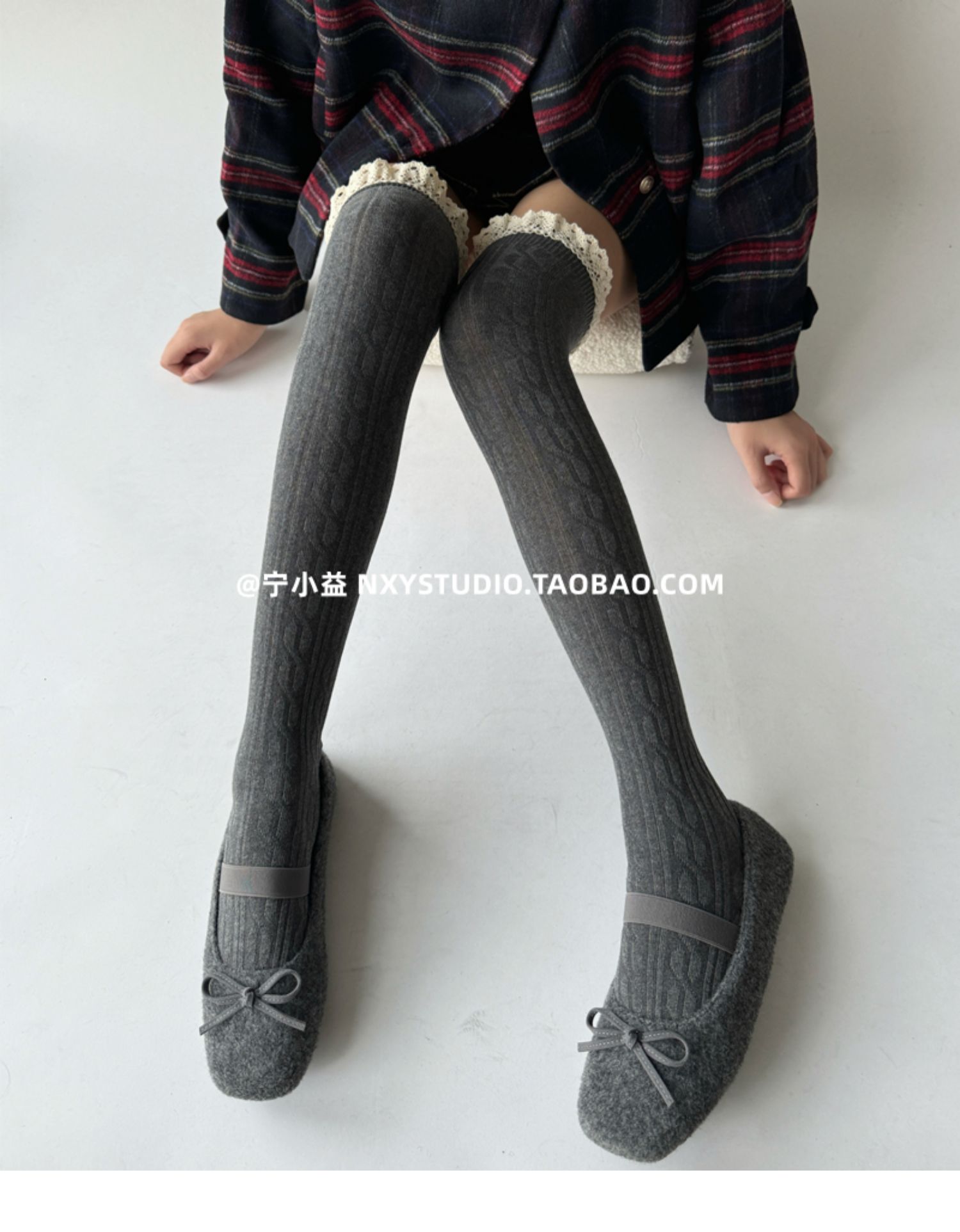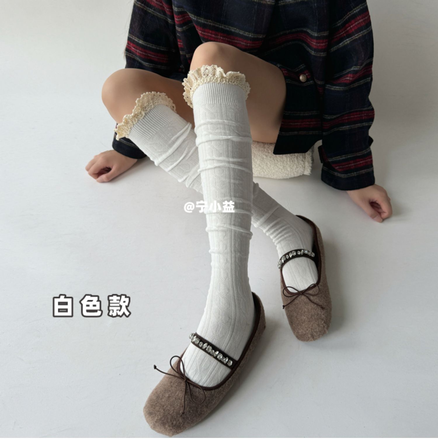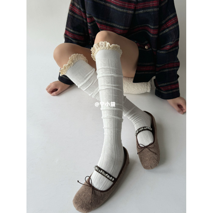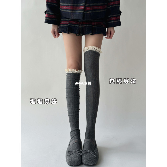 甯小益花邊過膝襪子女秋冬法式甜美lolita高筒堆堆棉襪竪條長筒襪