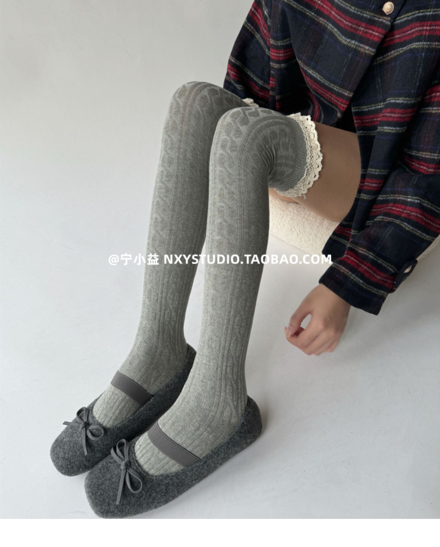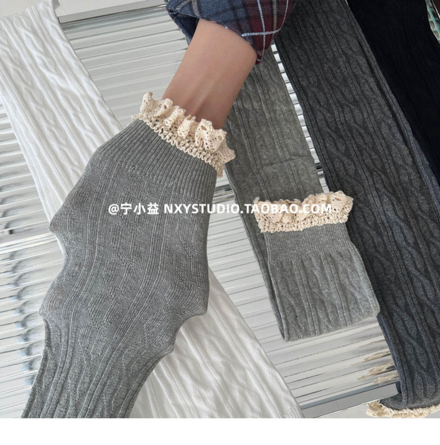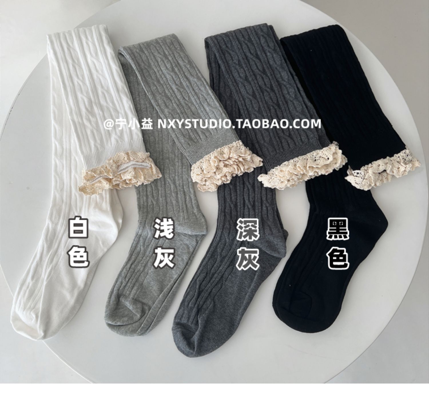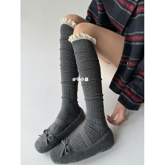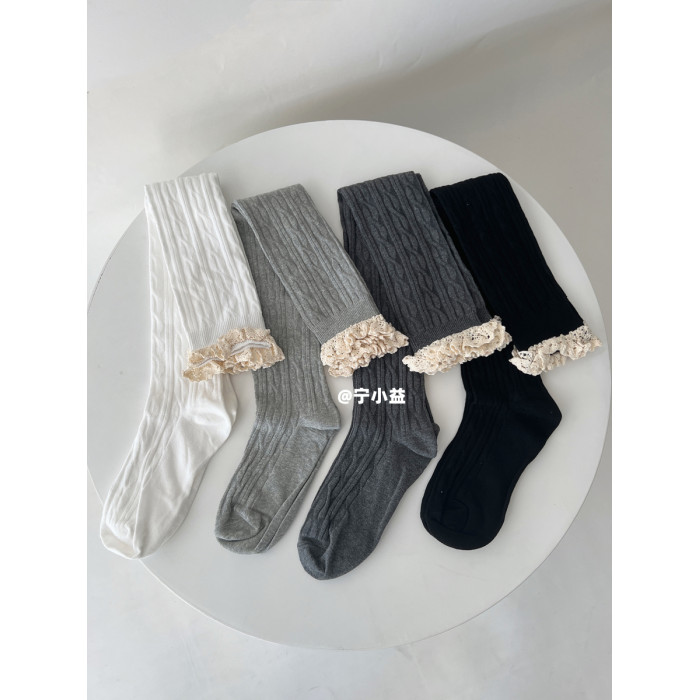 甯小益花邊過膝襪子女秋冬法式甜美lolita高筒堆堆棉襪竪條長筒襪