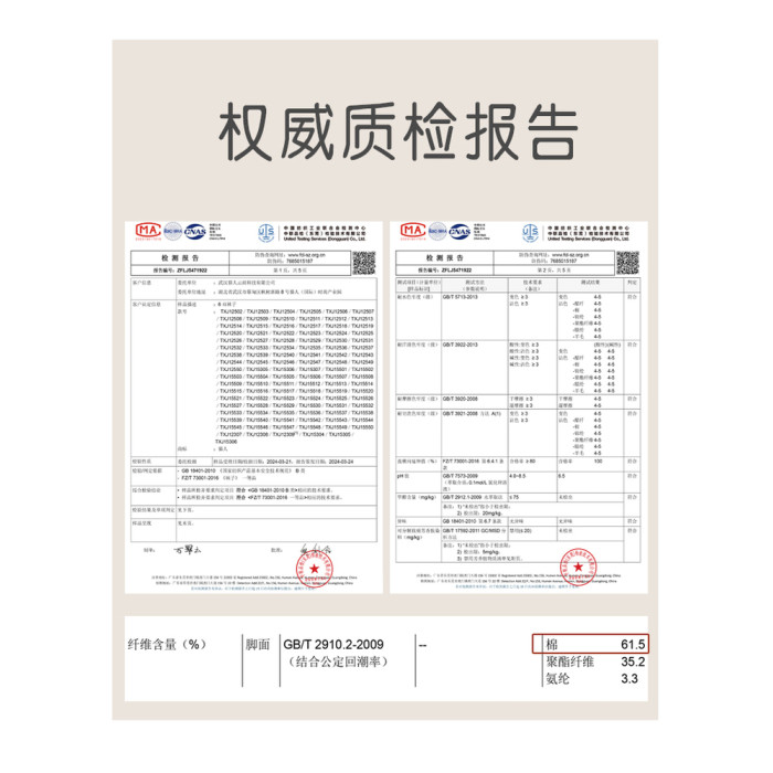 | 面料材質成分 | 棉61.5% 聚酯纖維35.2% 聚氨酯彈性纖維(氨綸)3.3% |