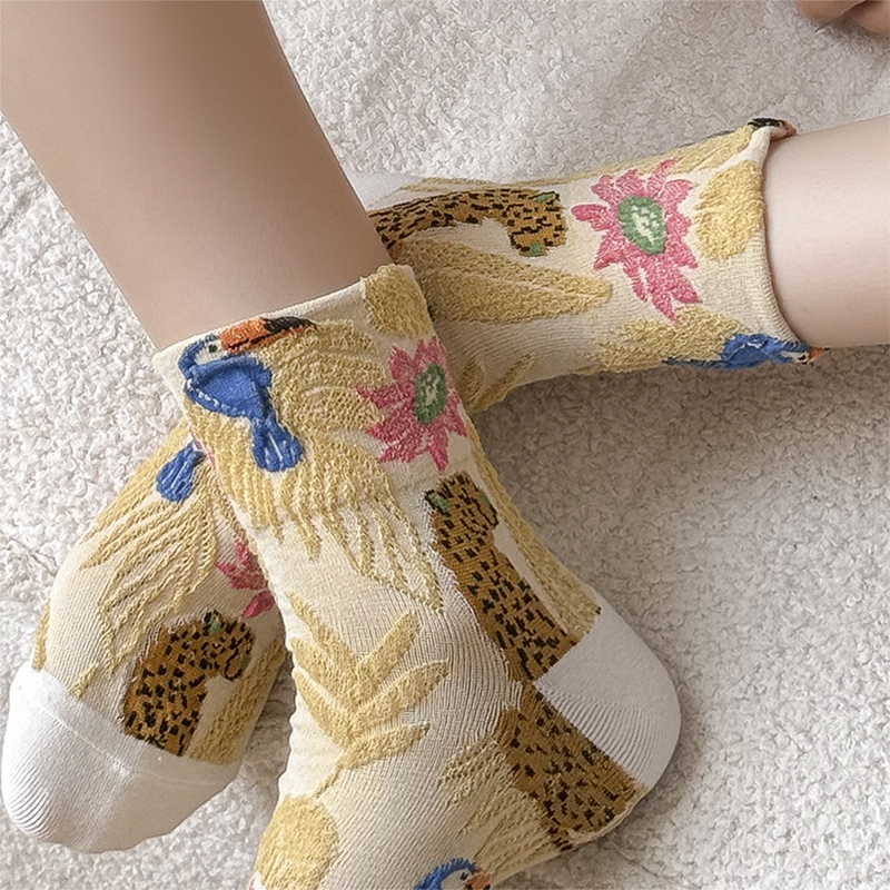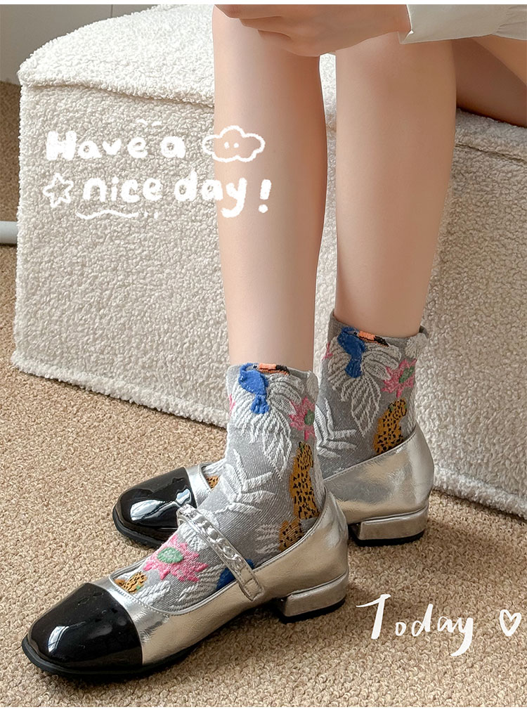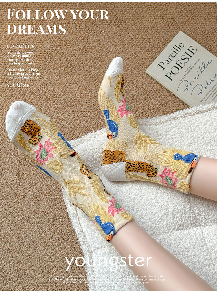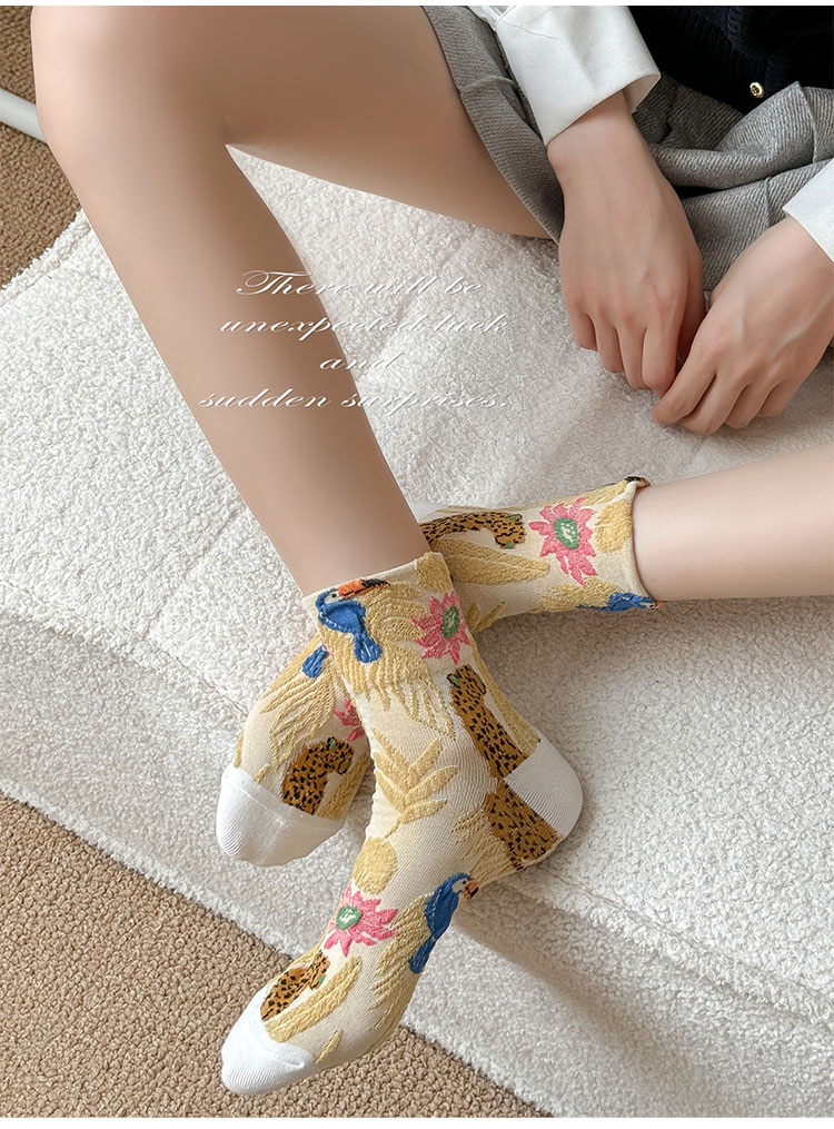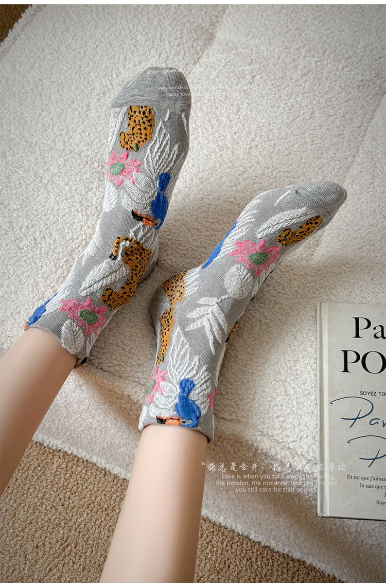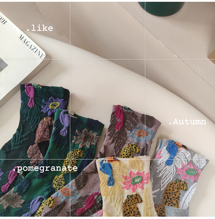 日系金錢豹動物花朵創意圖案中筒襪子女秋冬復古文藝立體浮雕女襪