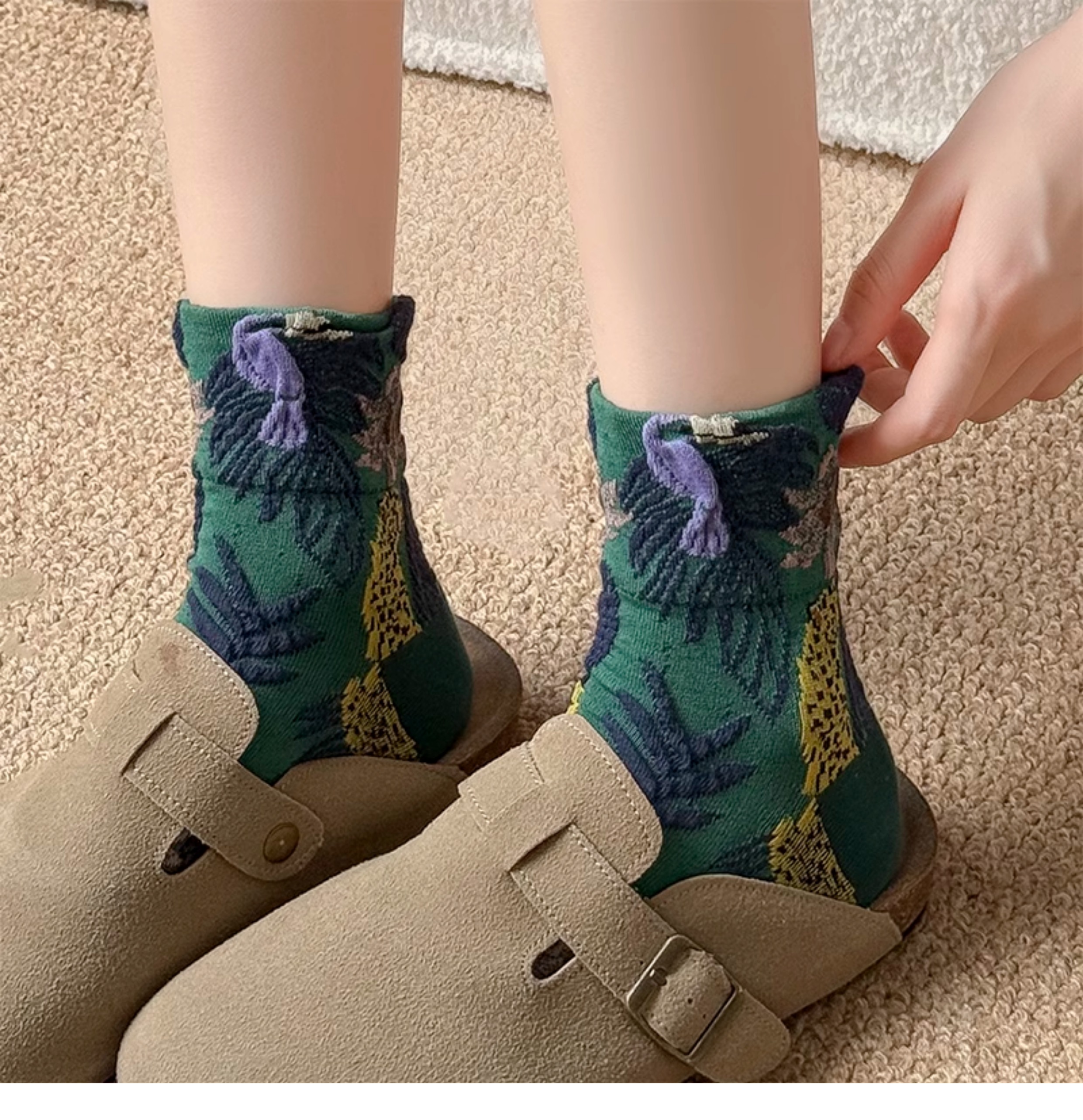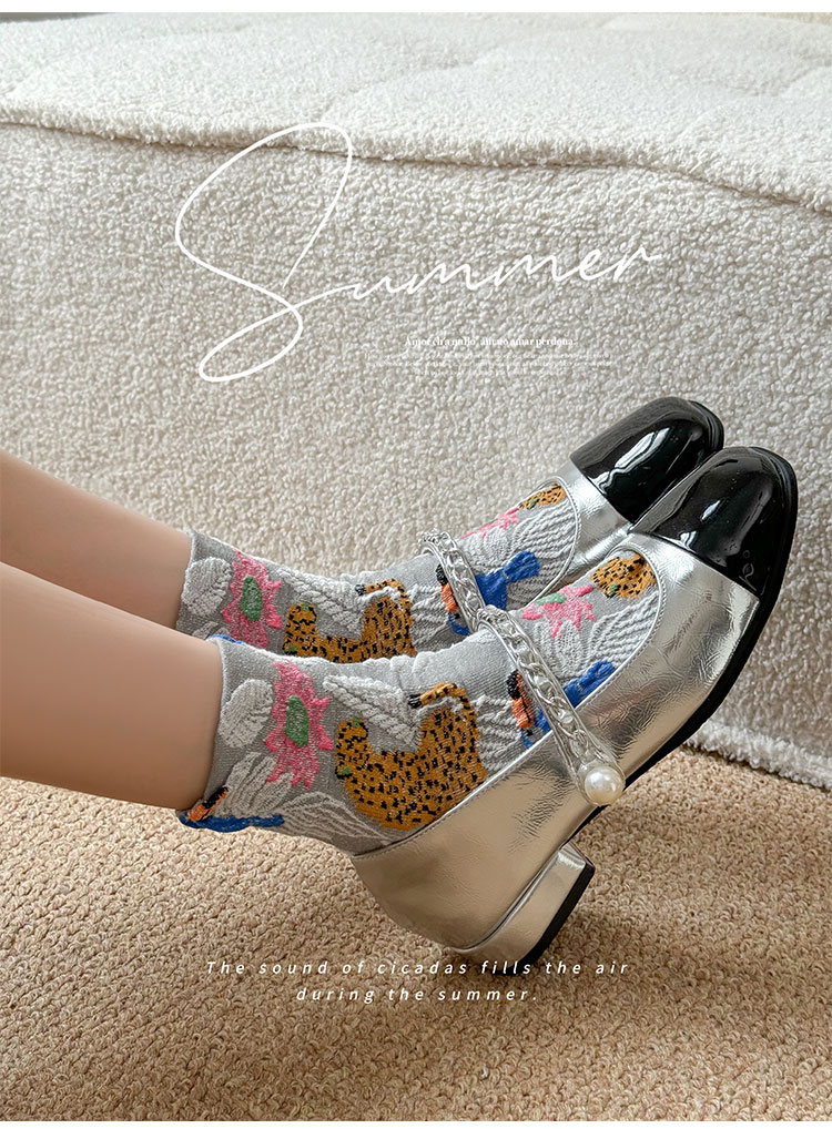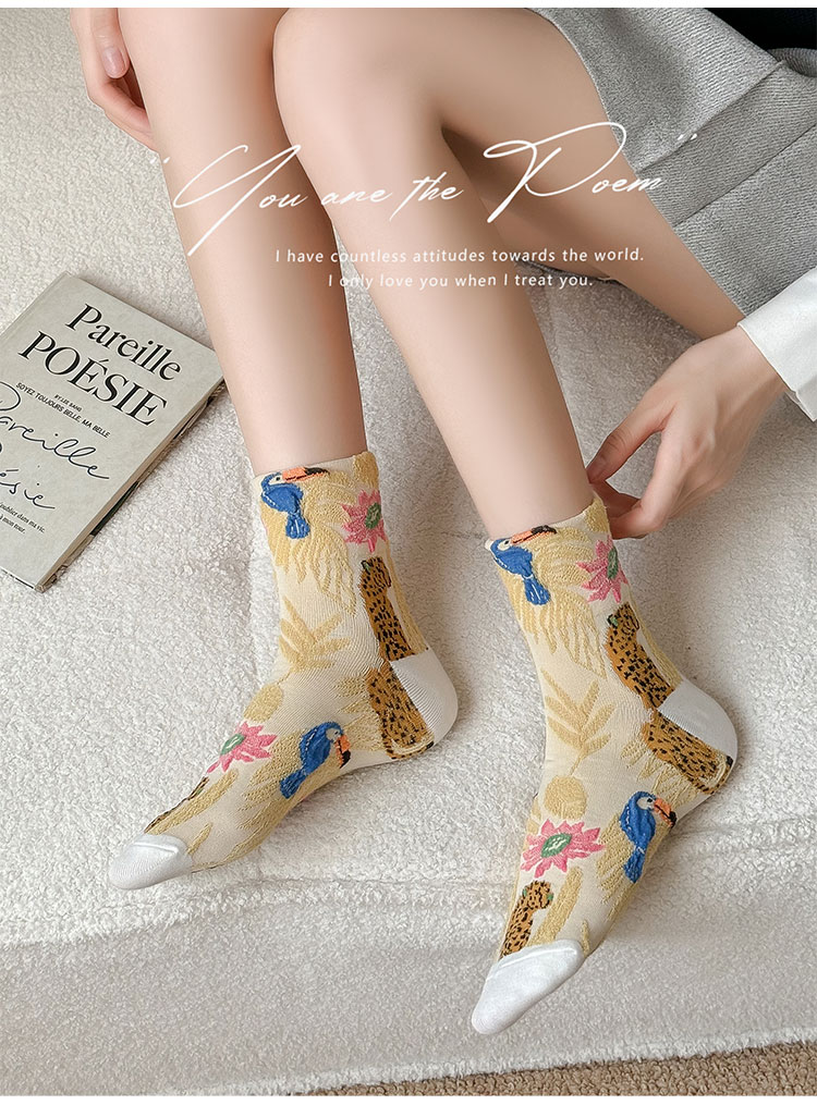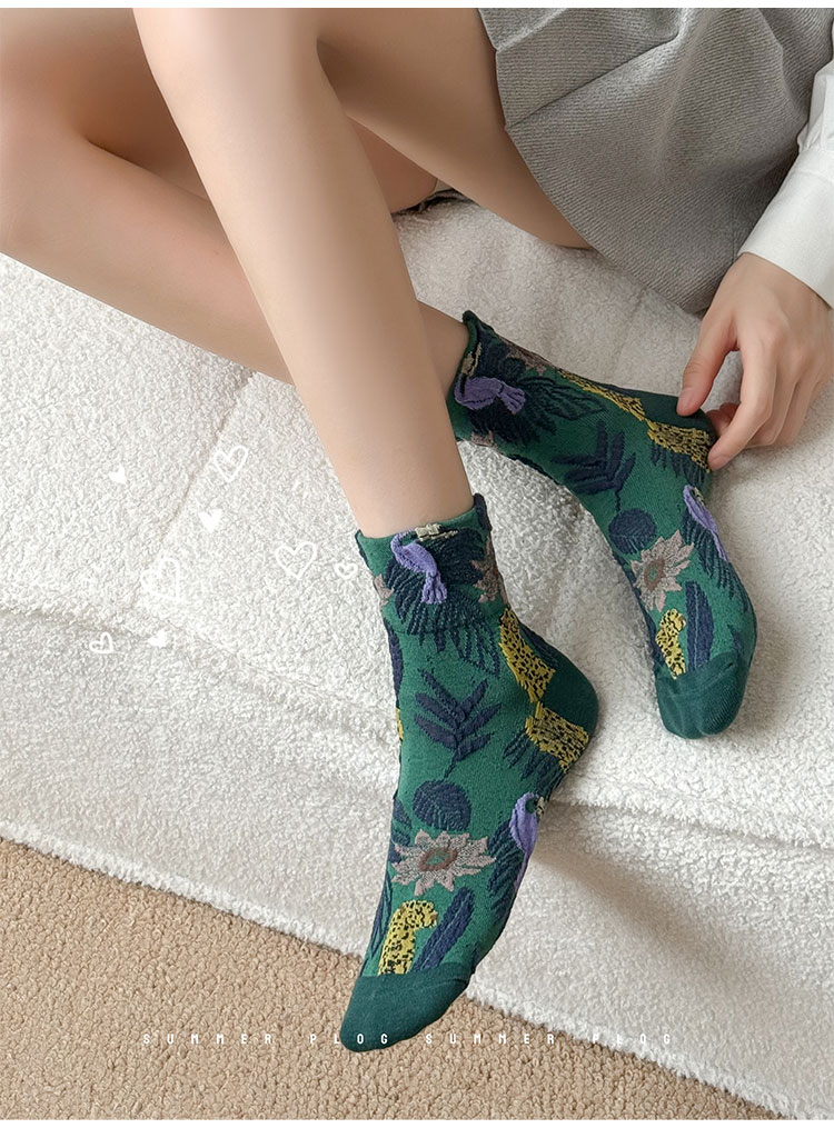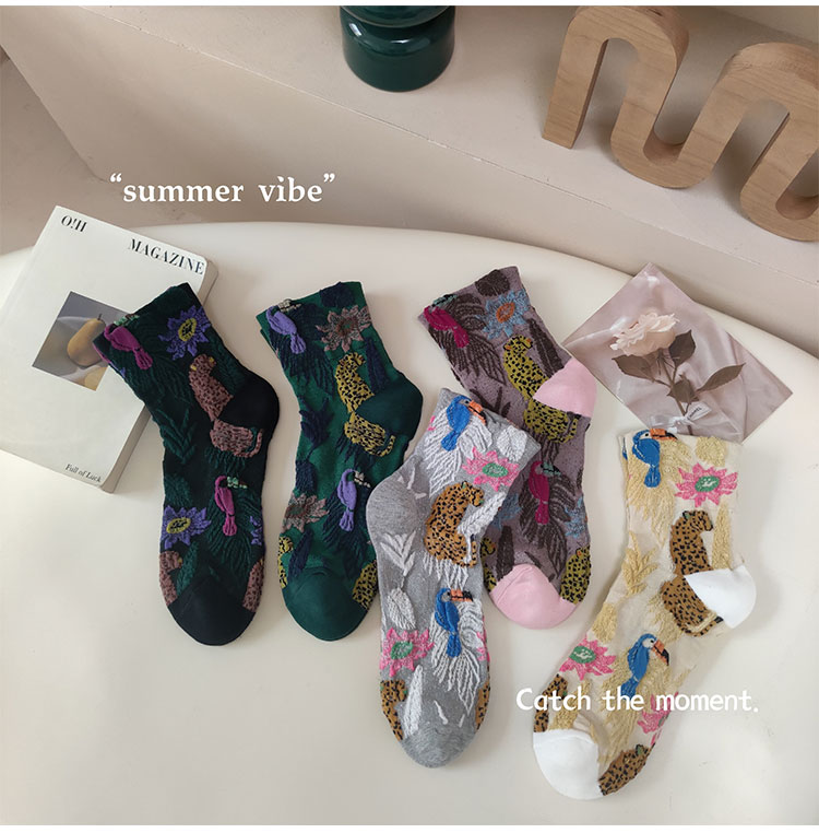 日系金錢豹動物花朵創意圖案中筒襪子女秋冬復古文藝立體浮雕女襪