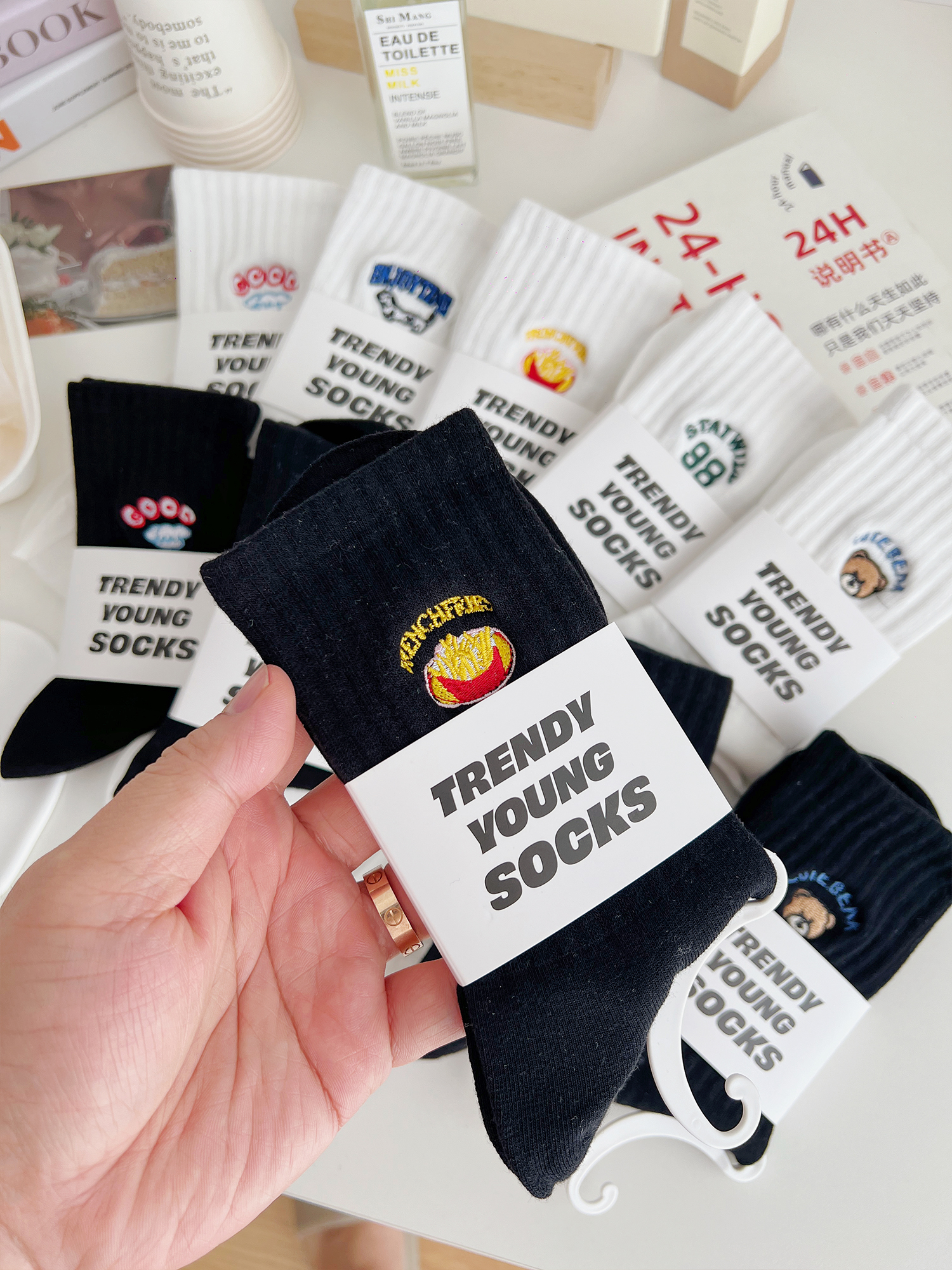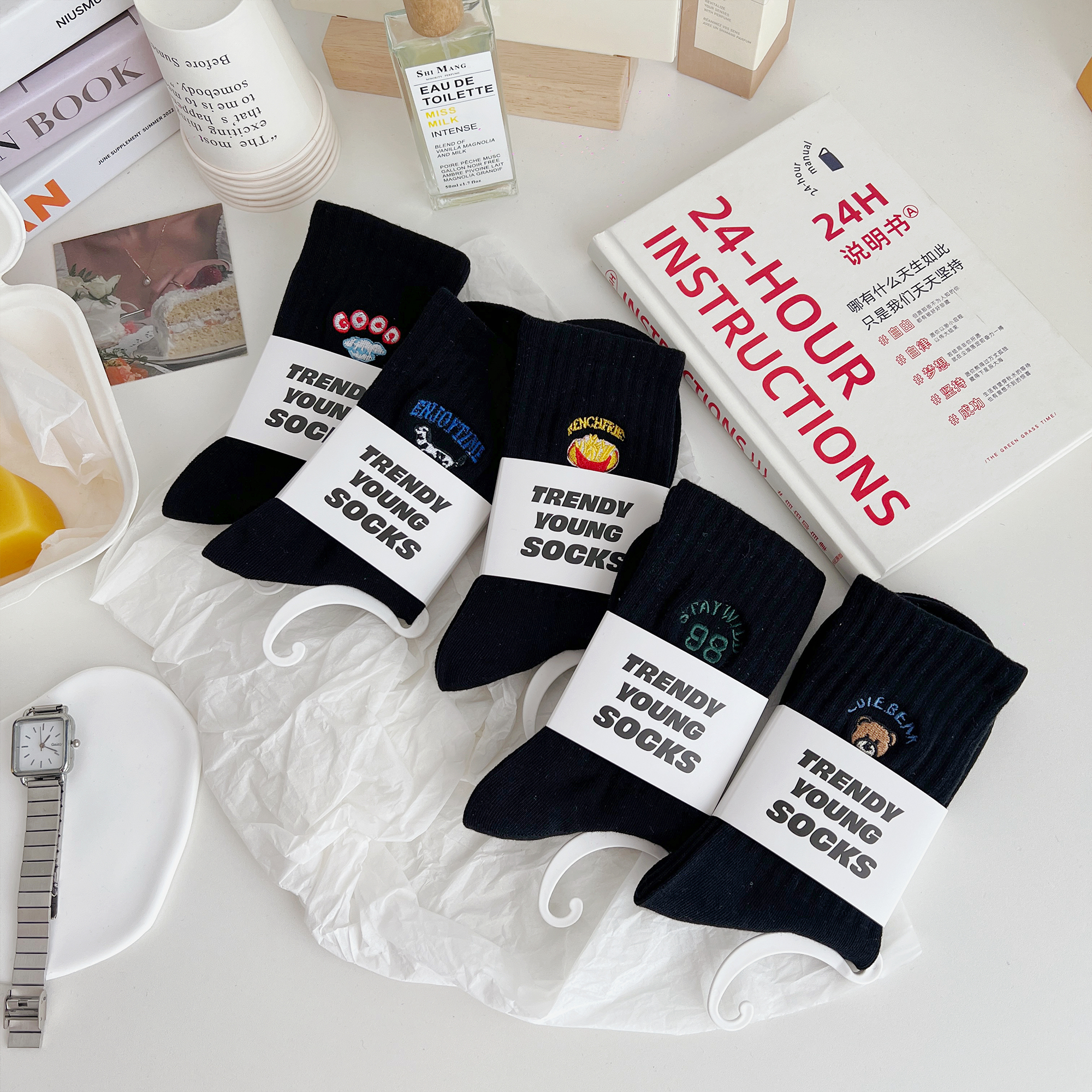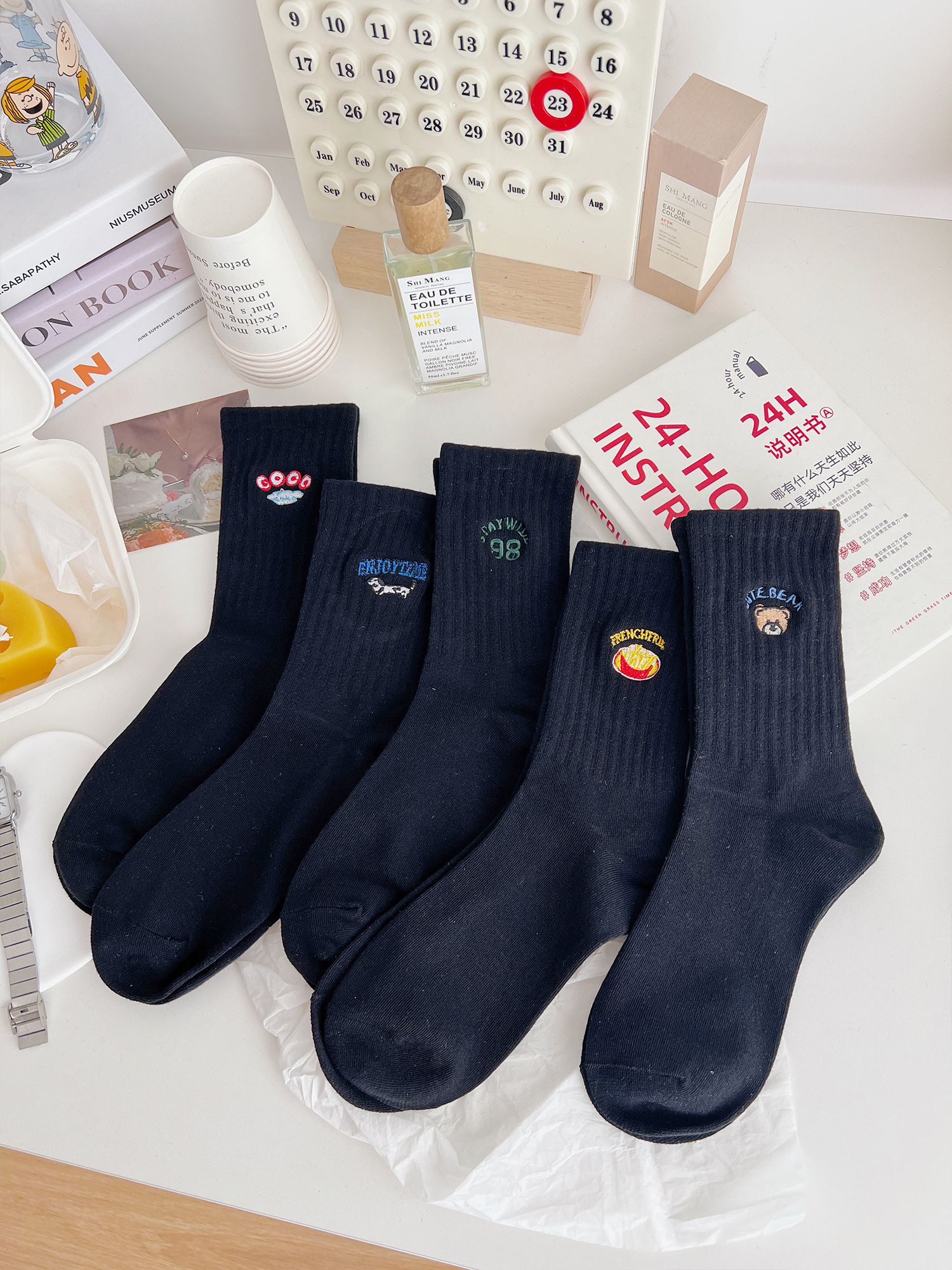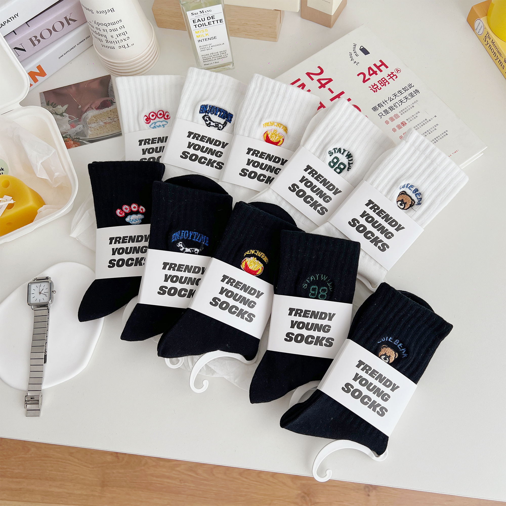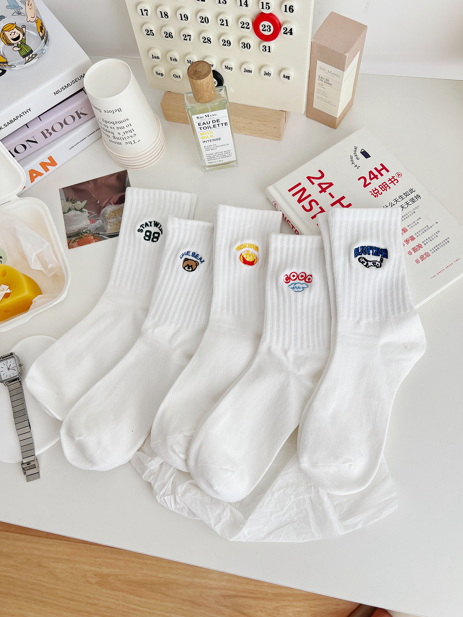 白色運動襪子女純棉中筒襪簡約日系卡通刺綉百搭黑色長襪ins春夏