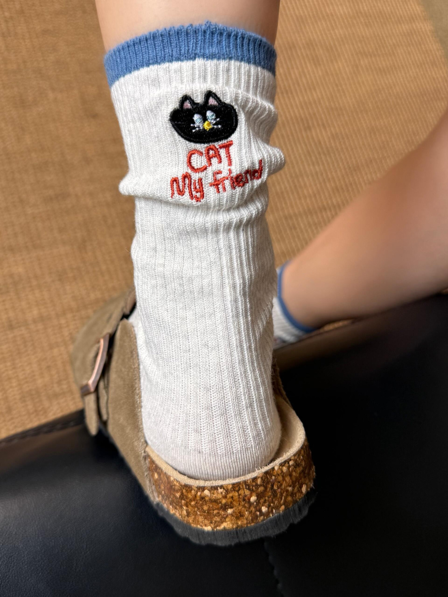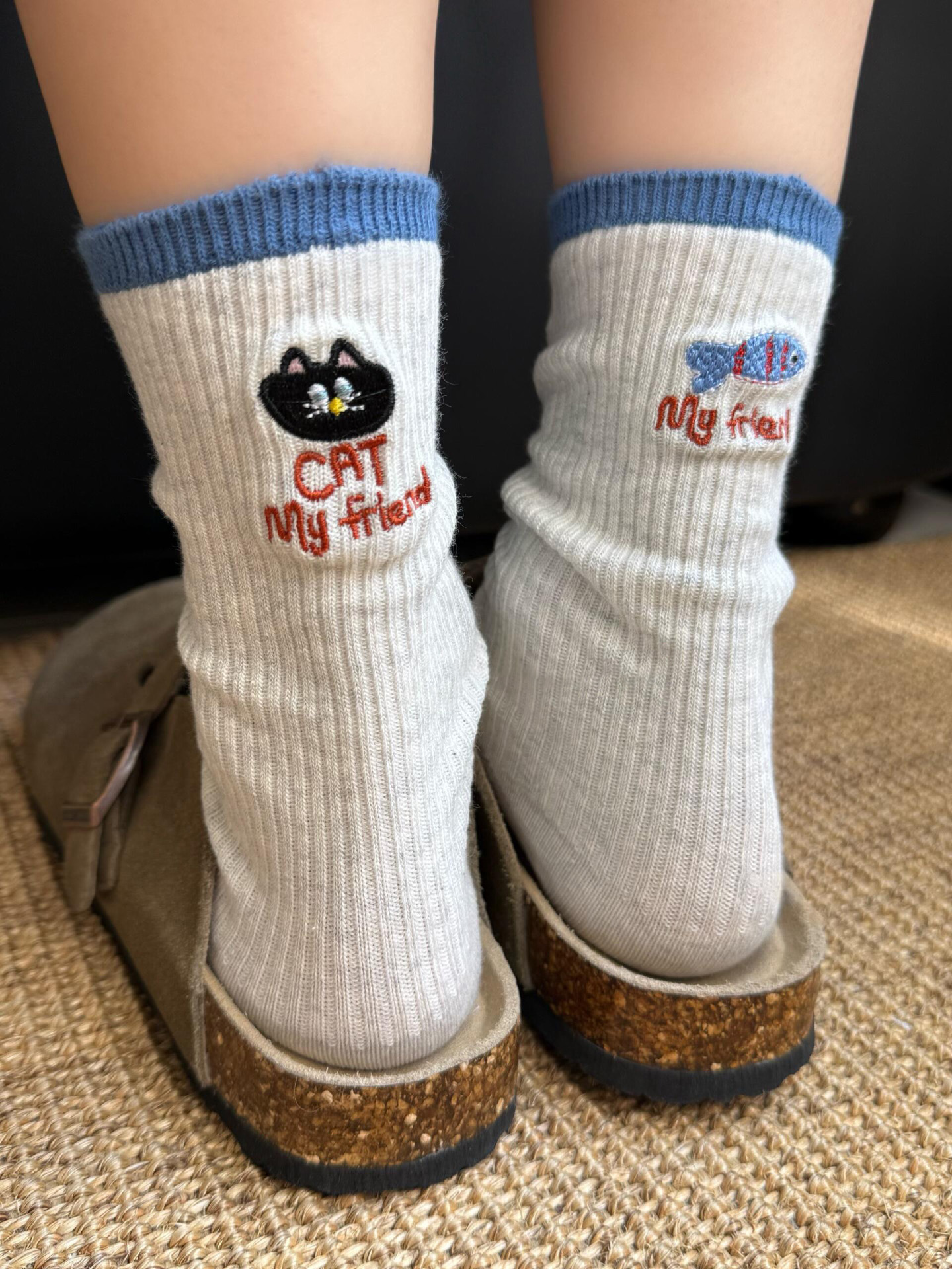 小貓與魚~左右兩衹腳都是不一樣的圖案~好可愛~襪子女AB中筒堆堆