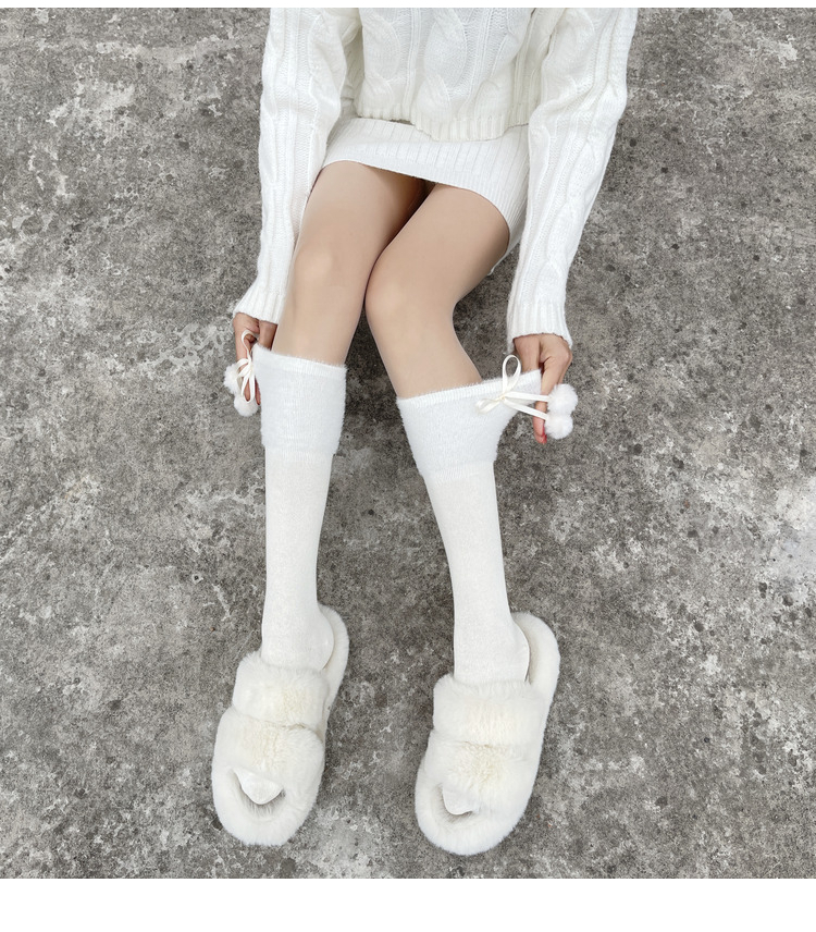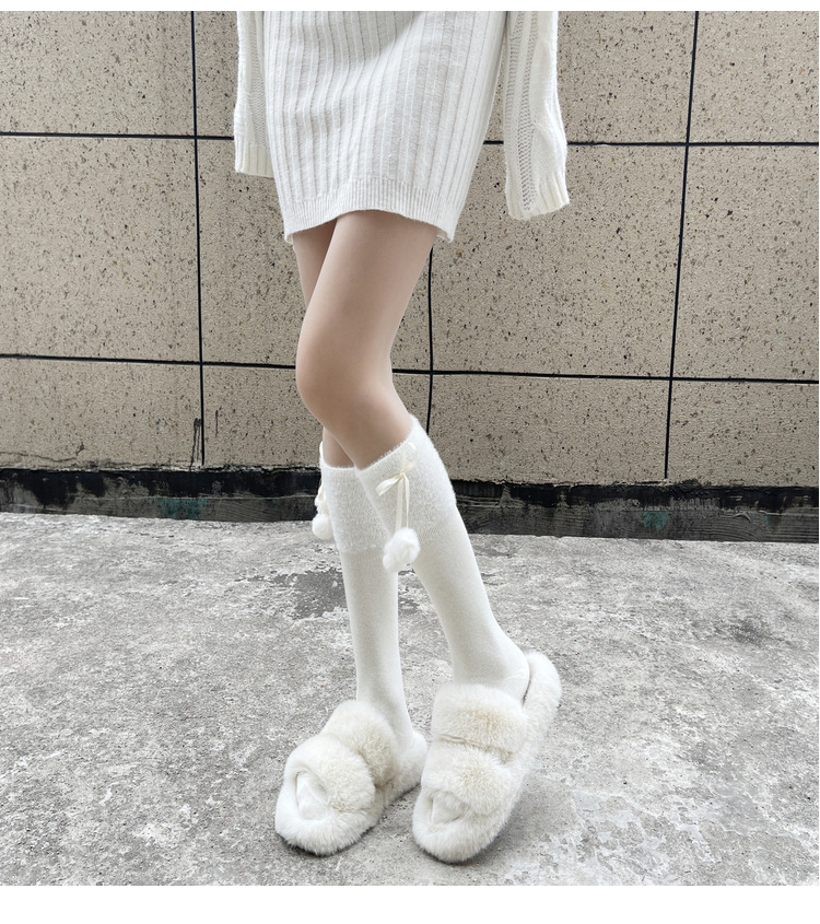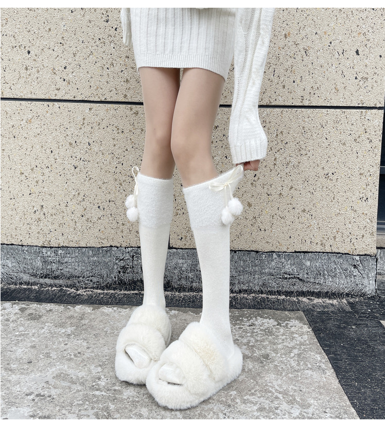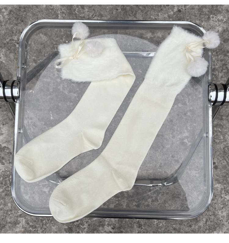 純欲奶白色小腿襪子JK過膝長筒襪套女秋冬加絨可愛毛球中筒堆堆襪
