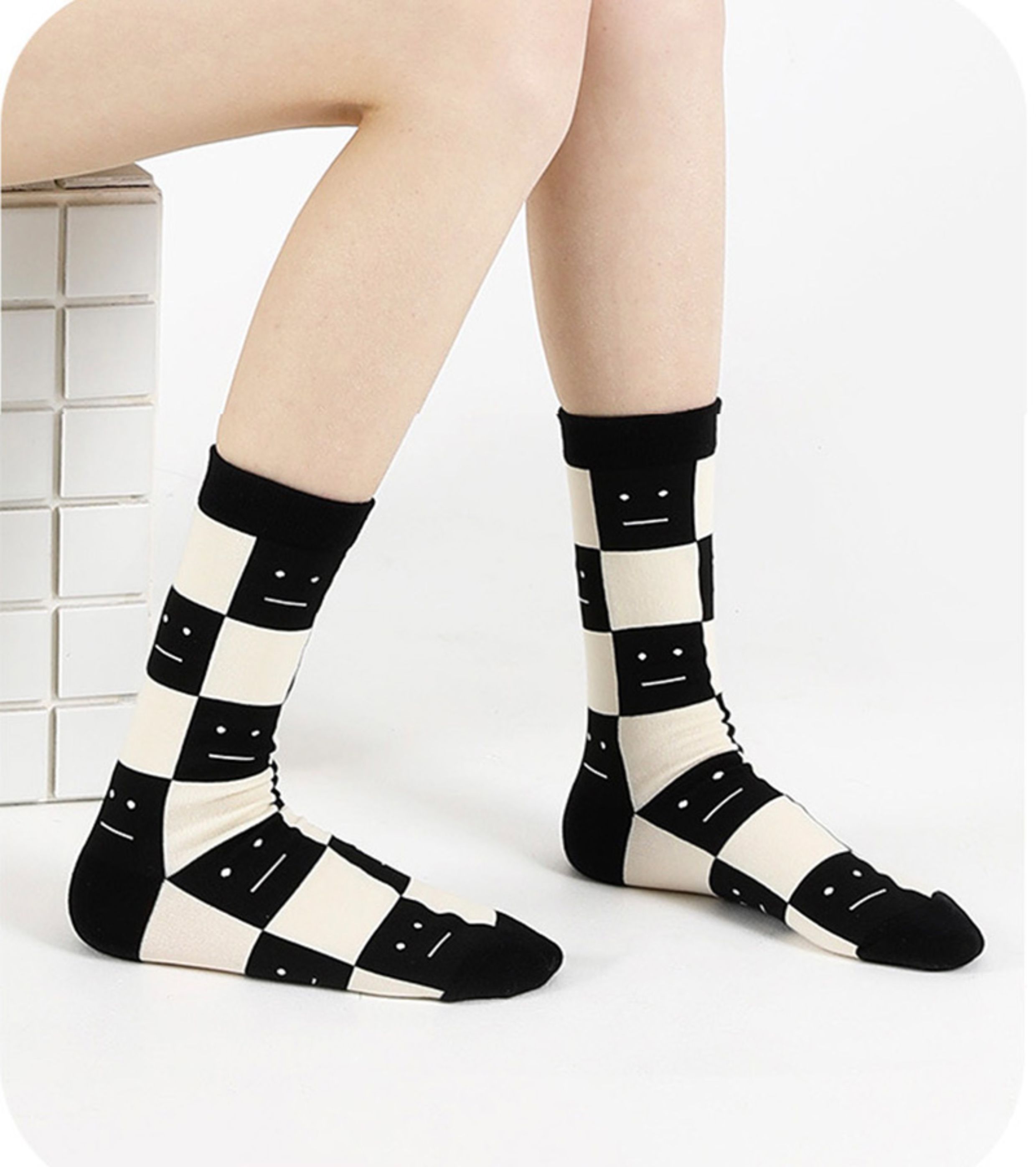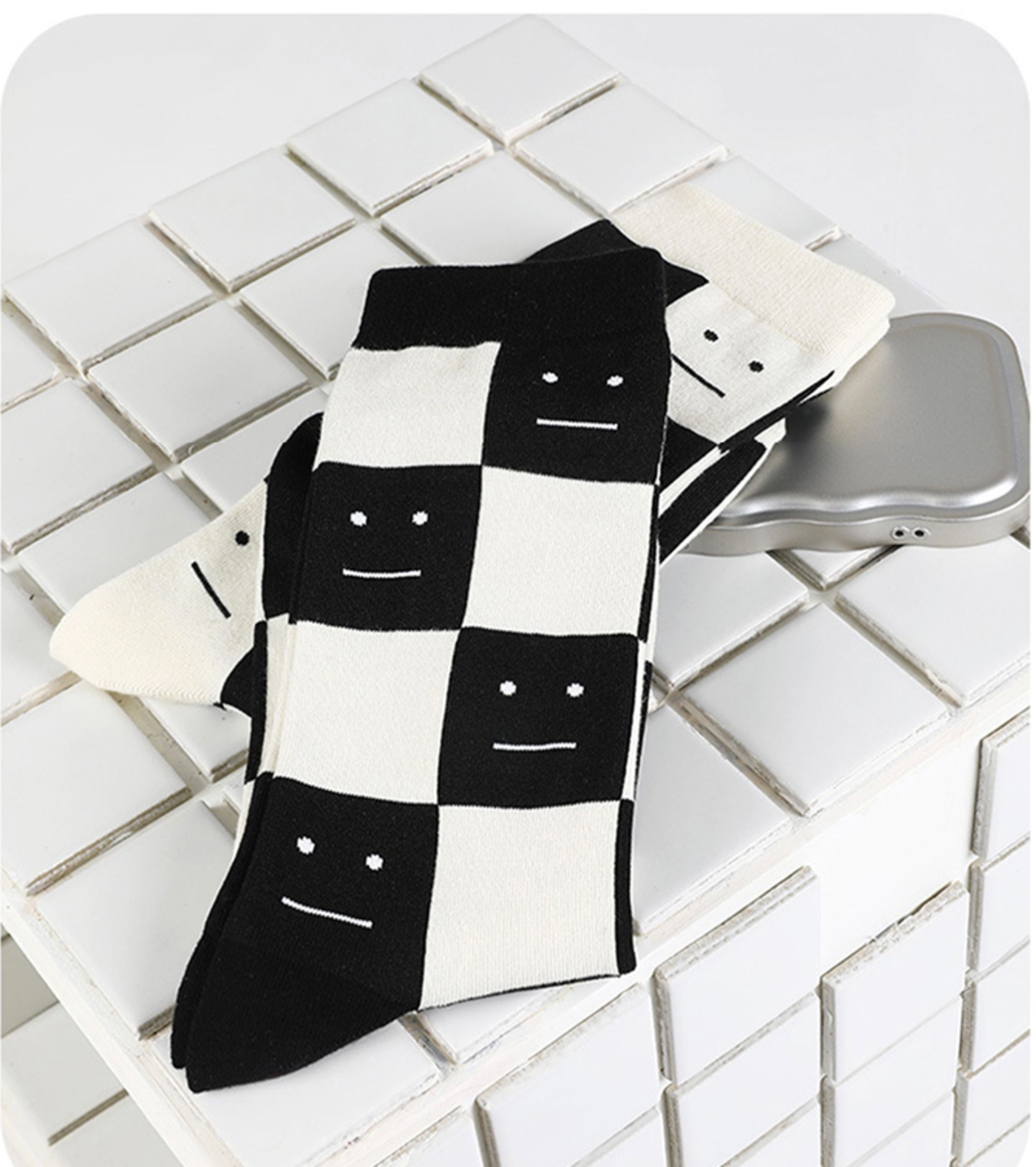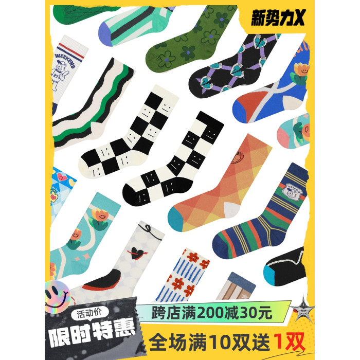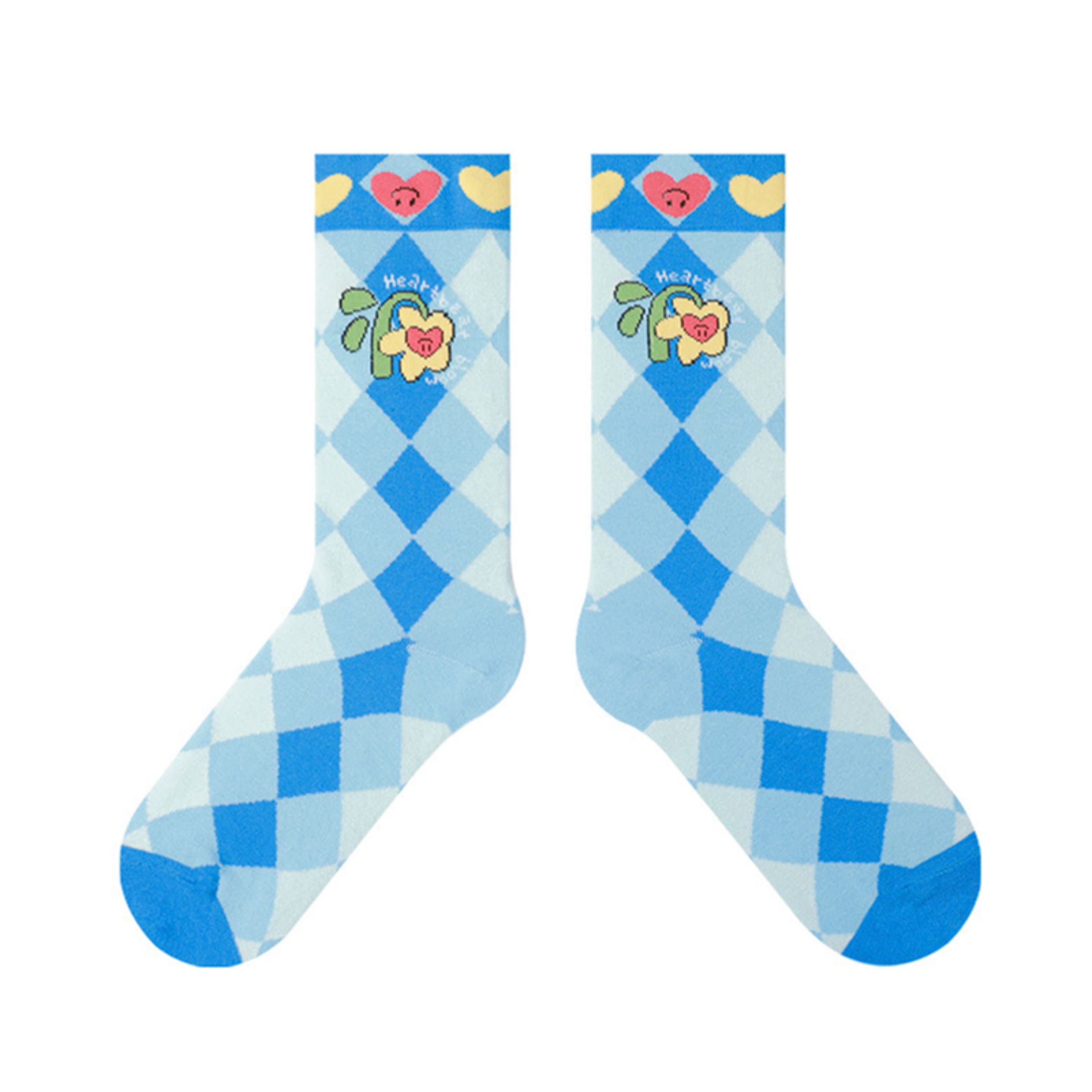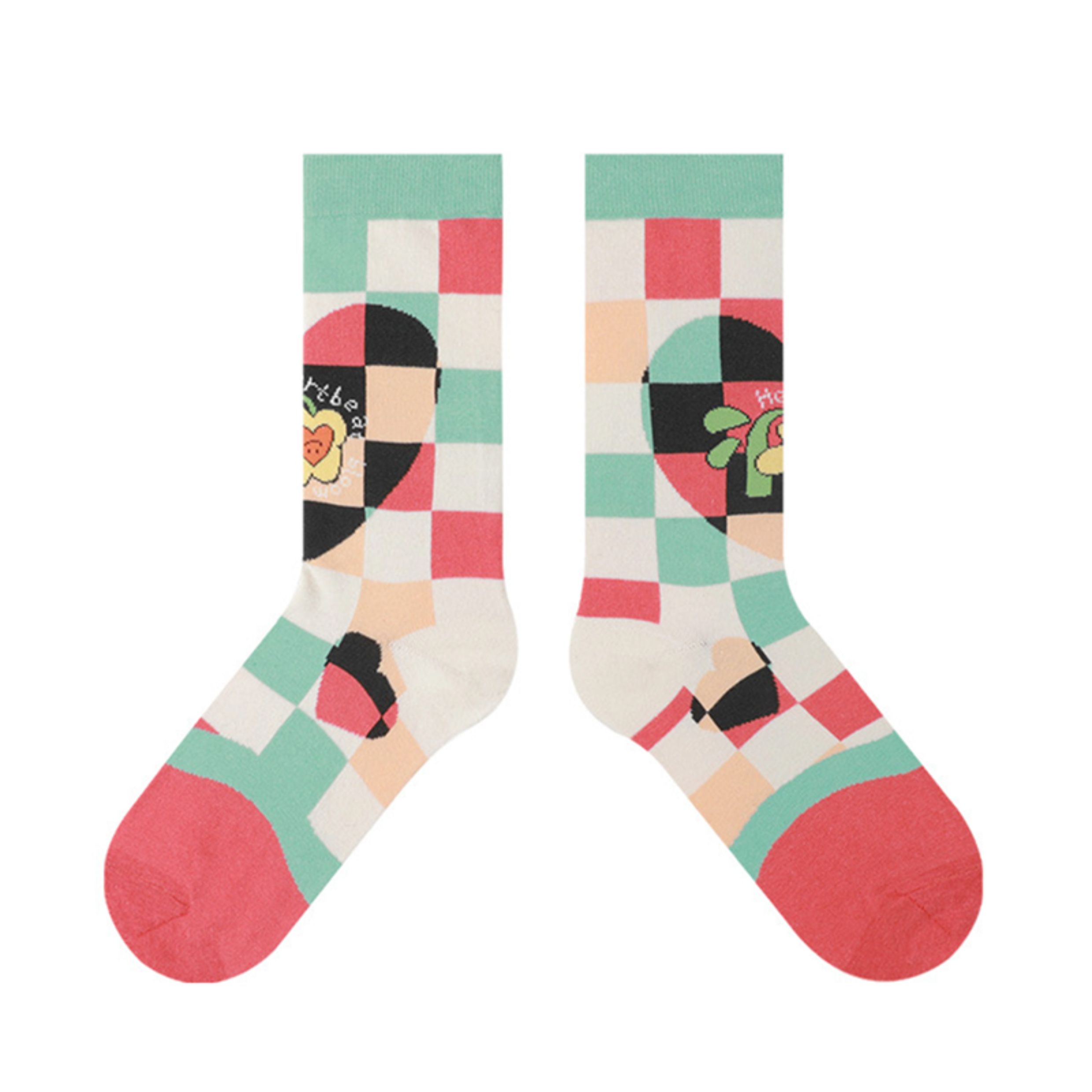 春秋男女卡通彩色中長筒襪子綠色波浪破碎之心黑白格子高幫純棉潮