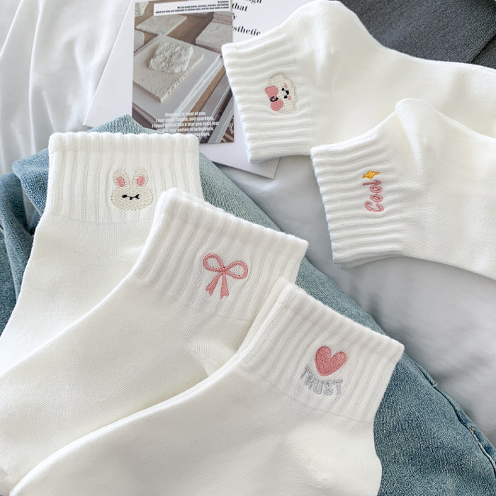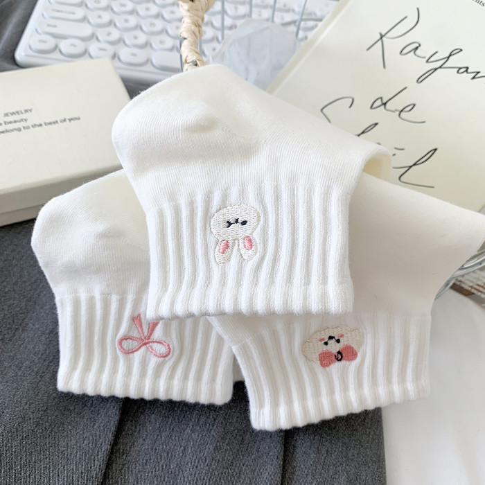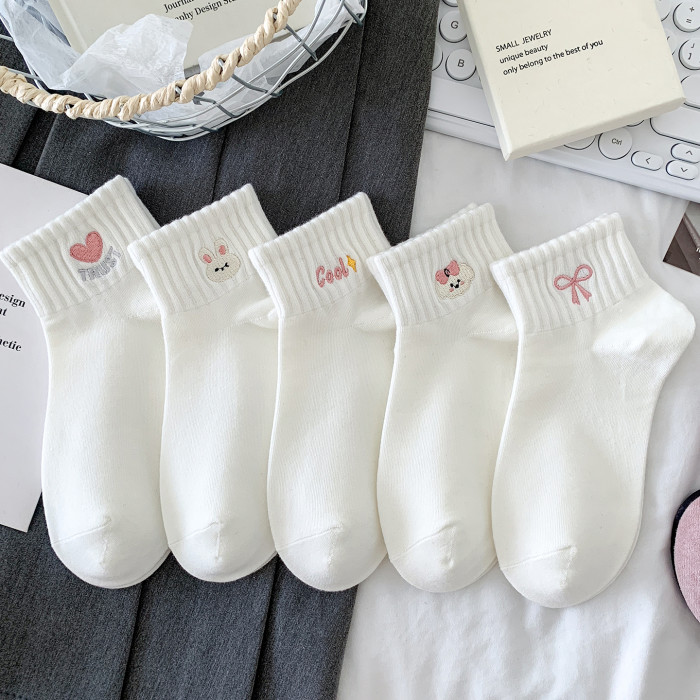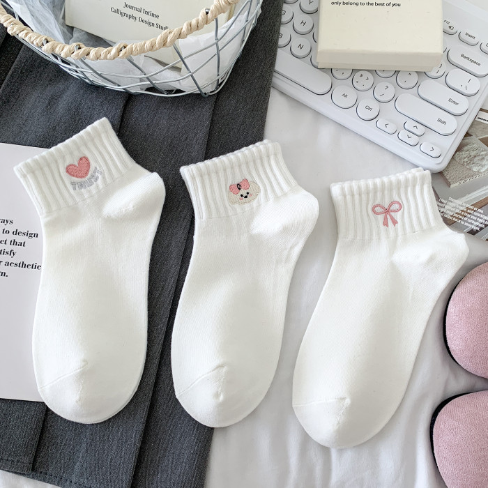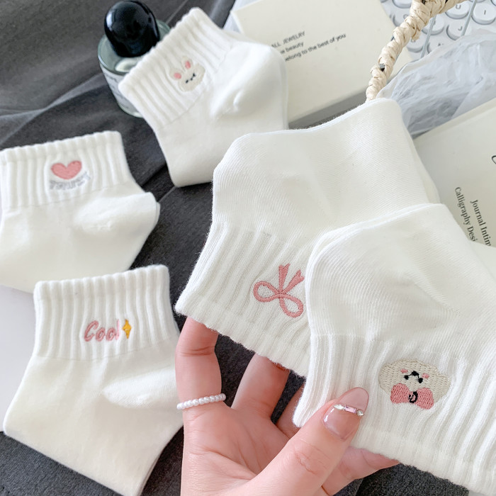 可愛粉色刺綉襪子女純棉短襪春秋夏季低幫短筒運動風奶白卡通透氣