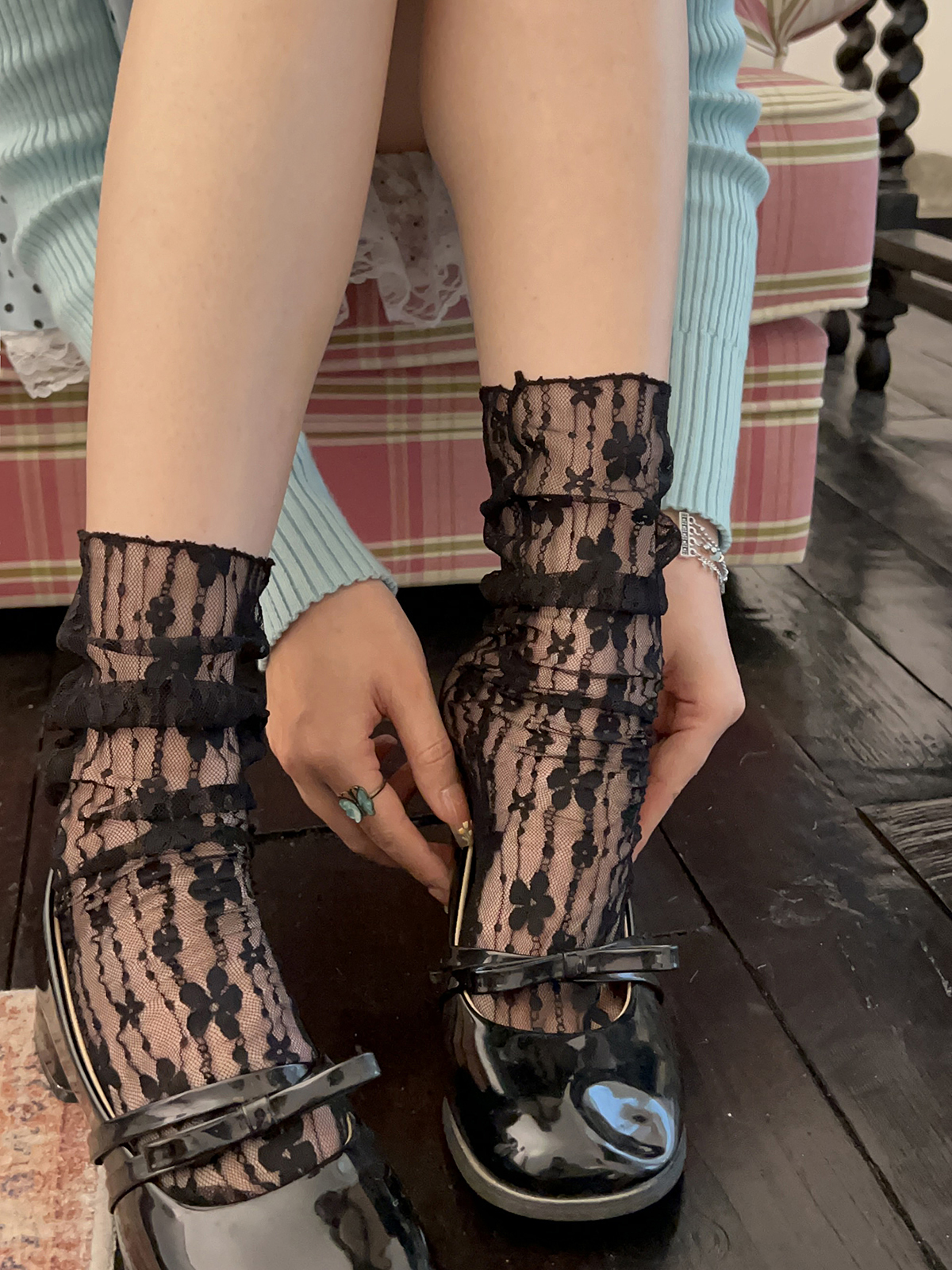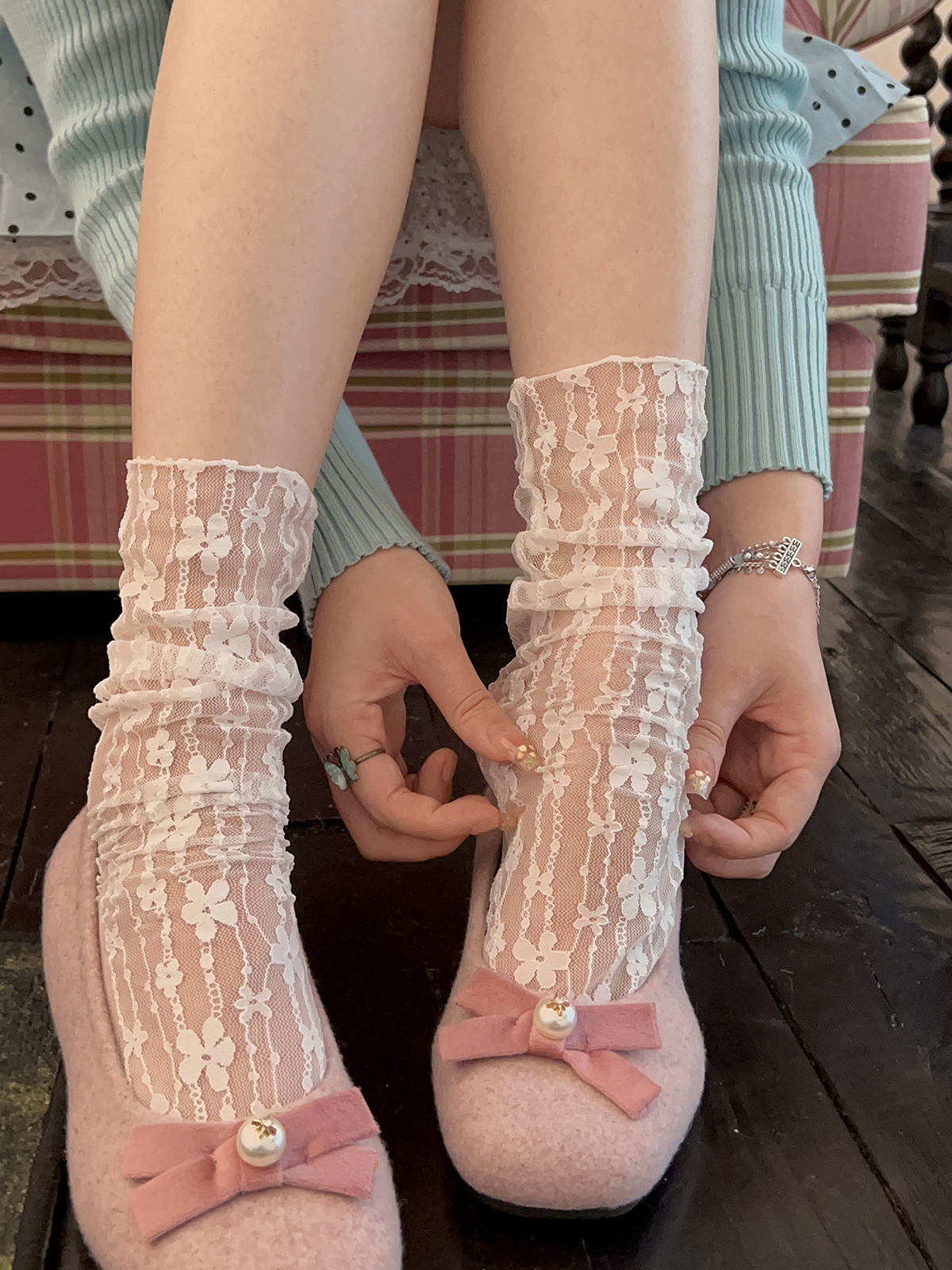 "撩心小蕾絲!"芭蕾風襪子女中筒春夏薄款透明網紗堆堆襪配瑪麗珍