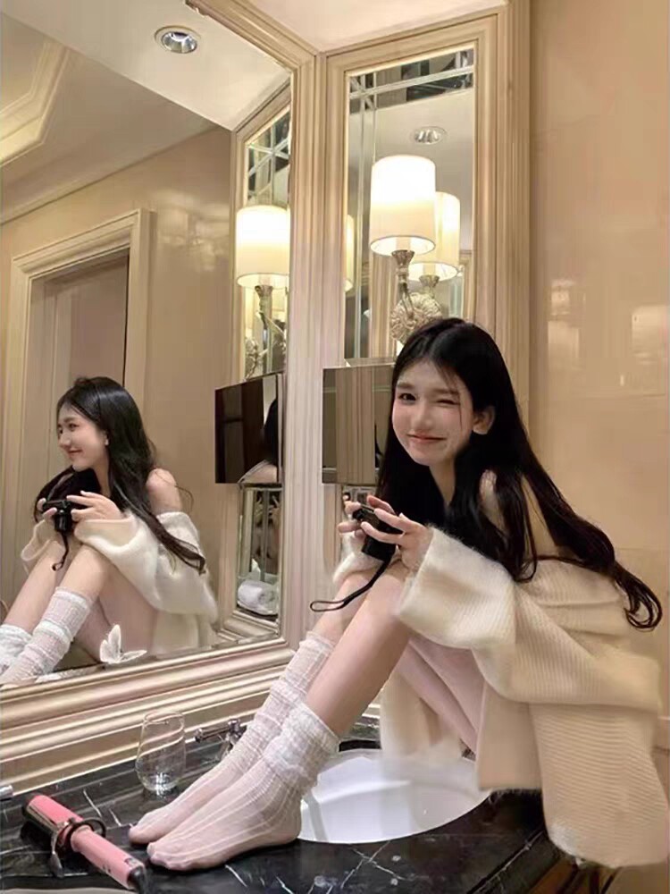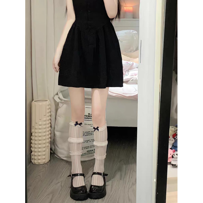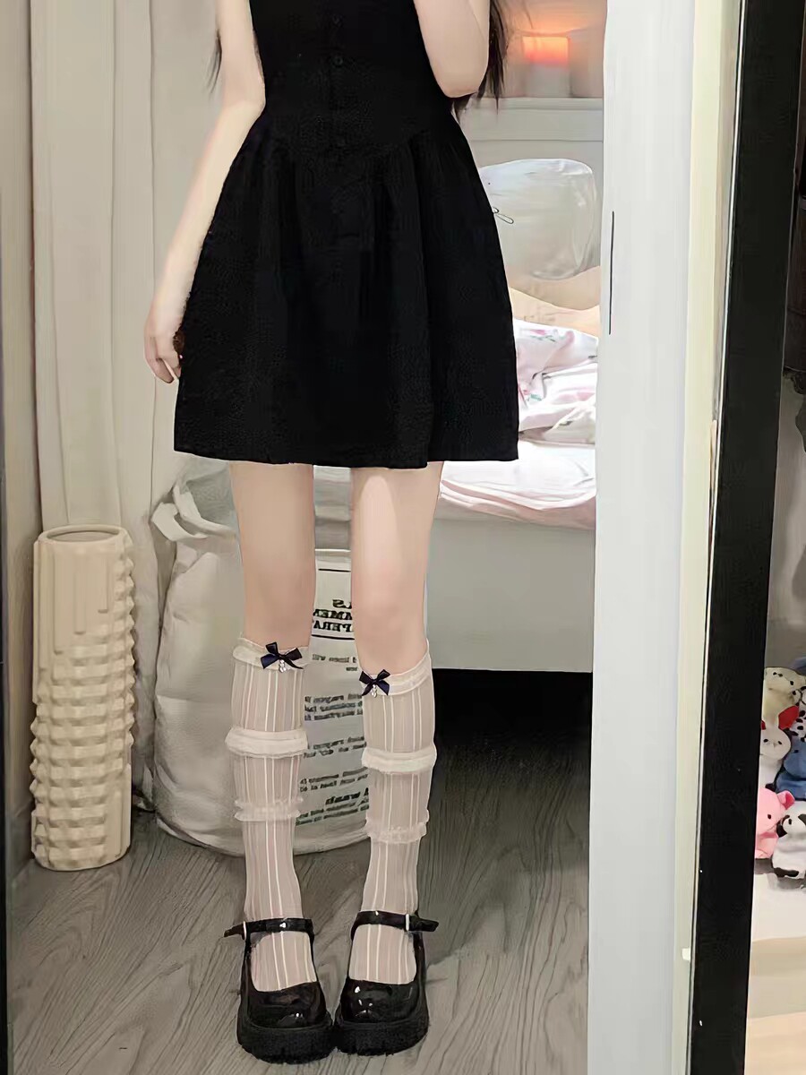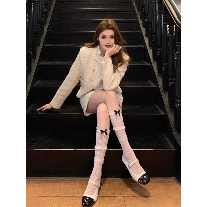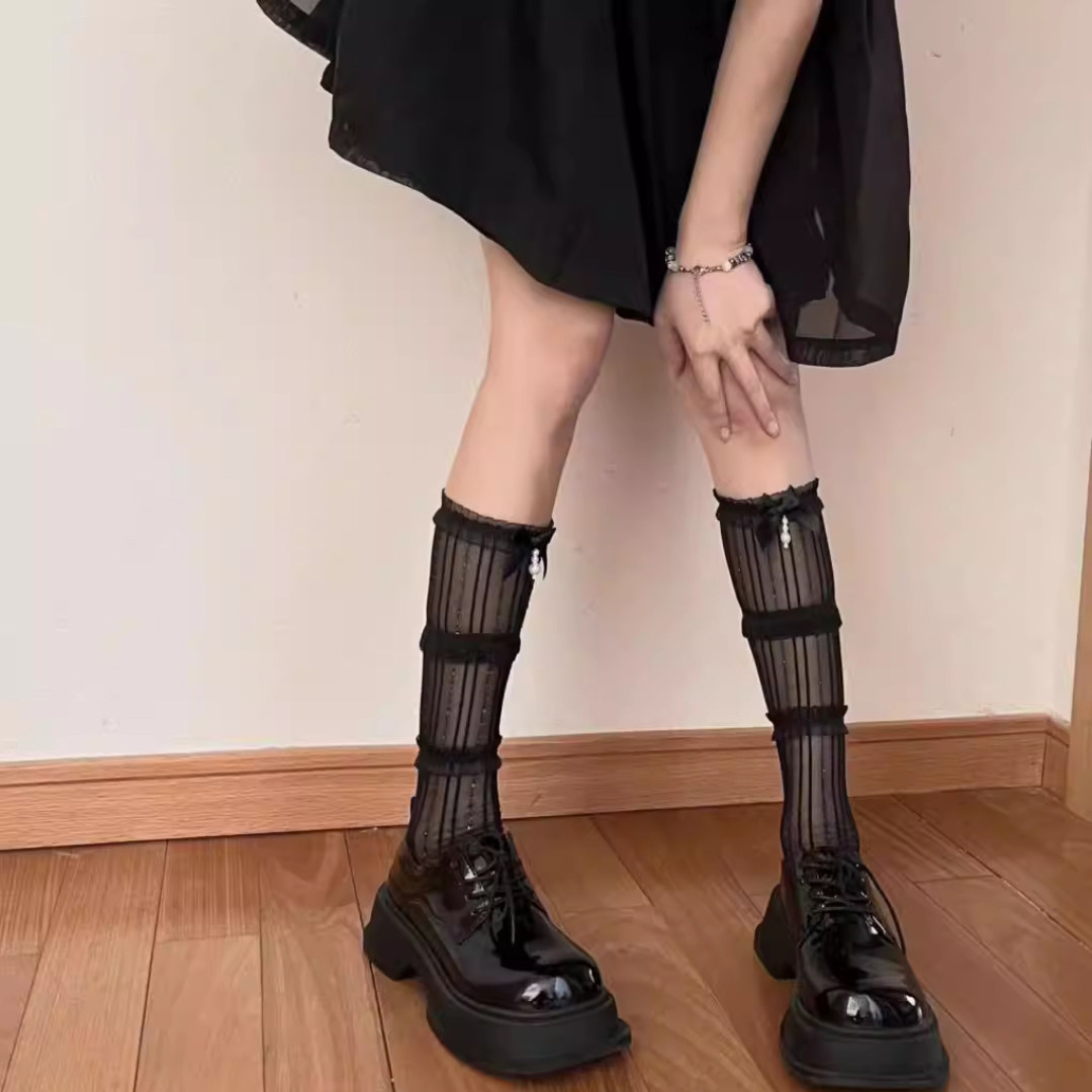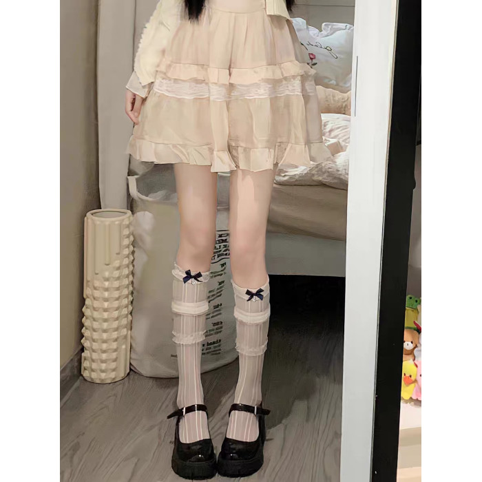 純欲白色蕾絲襪子女春秋中筒花邊薄款長筒蝴蝶結珍珠小腿襪絲襪