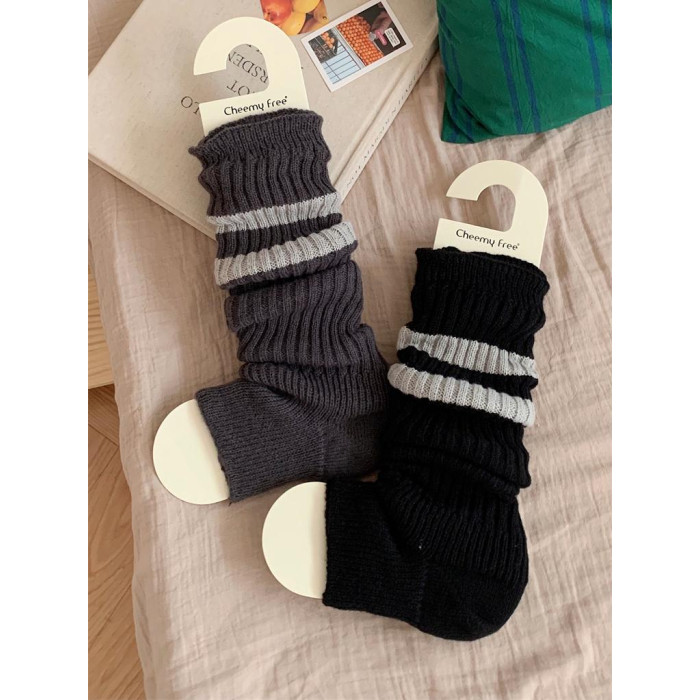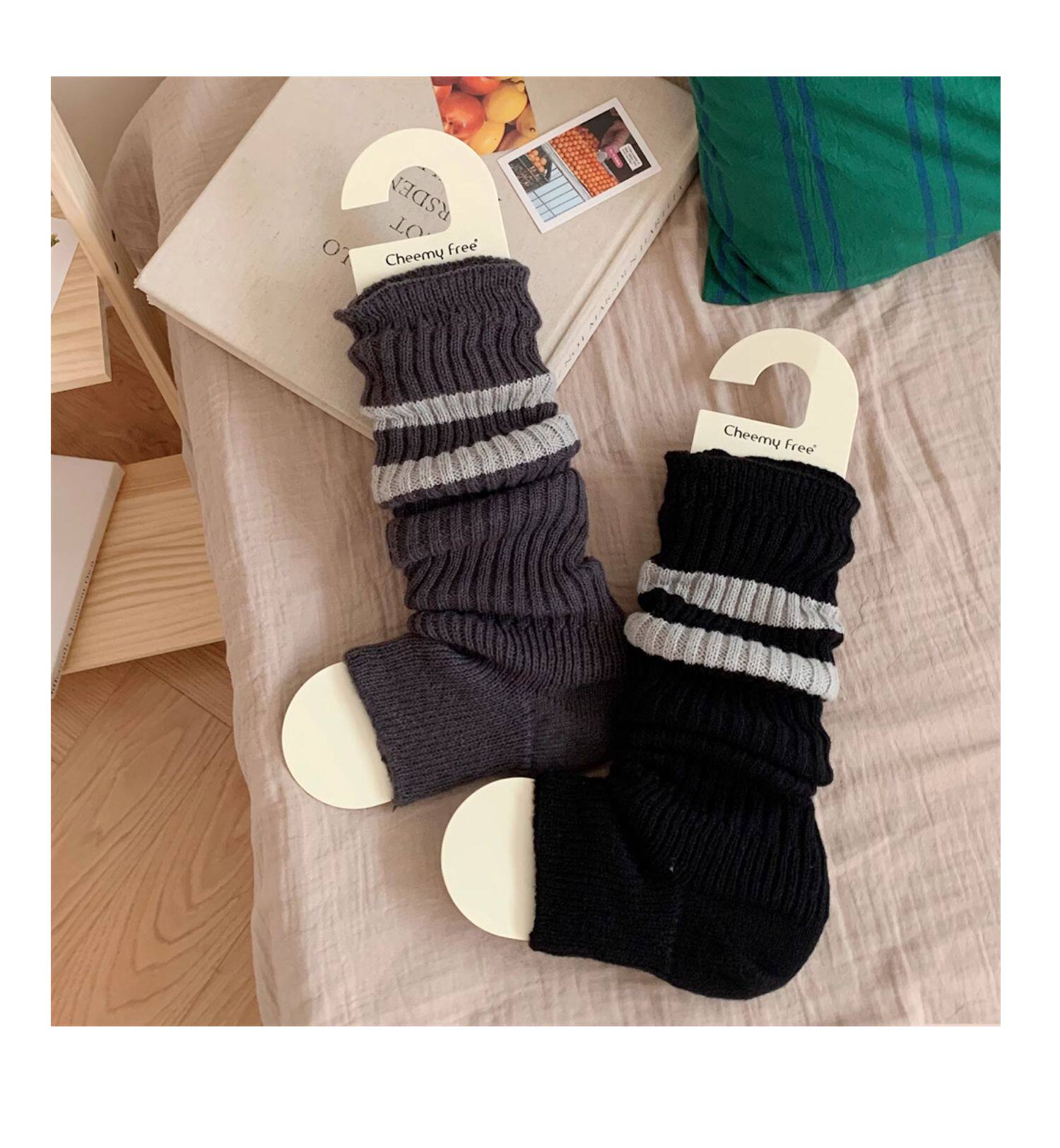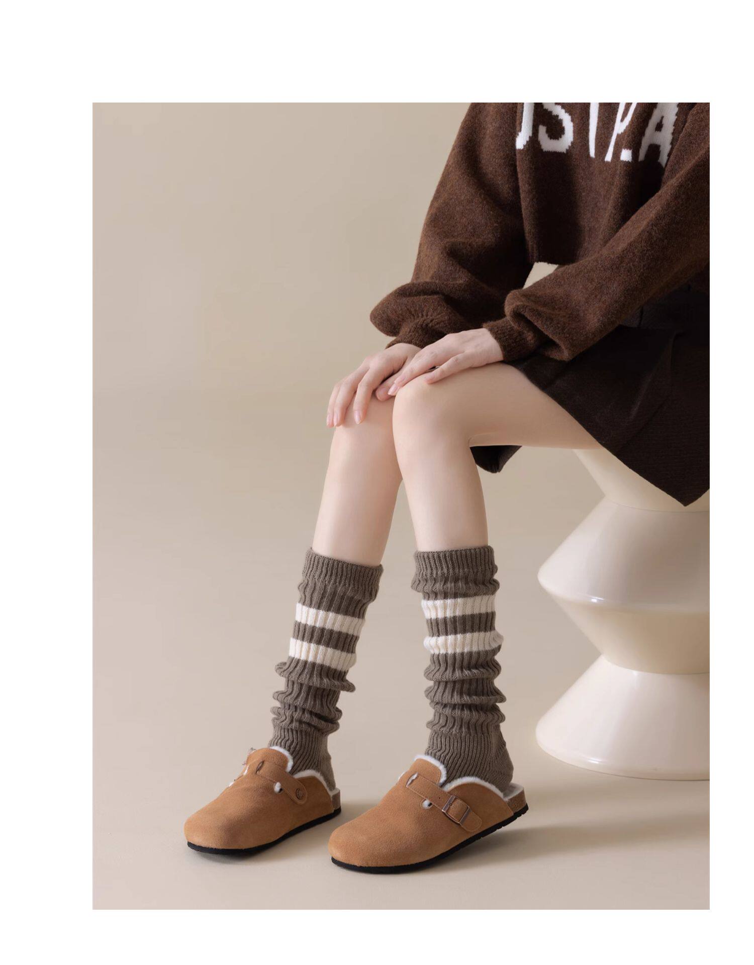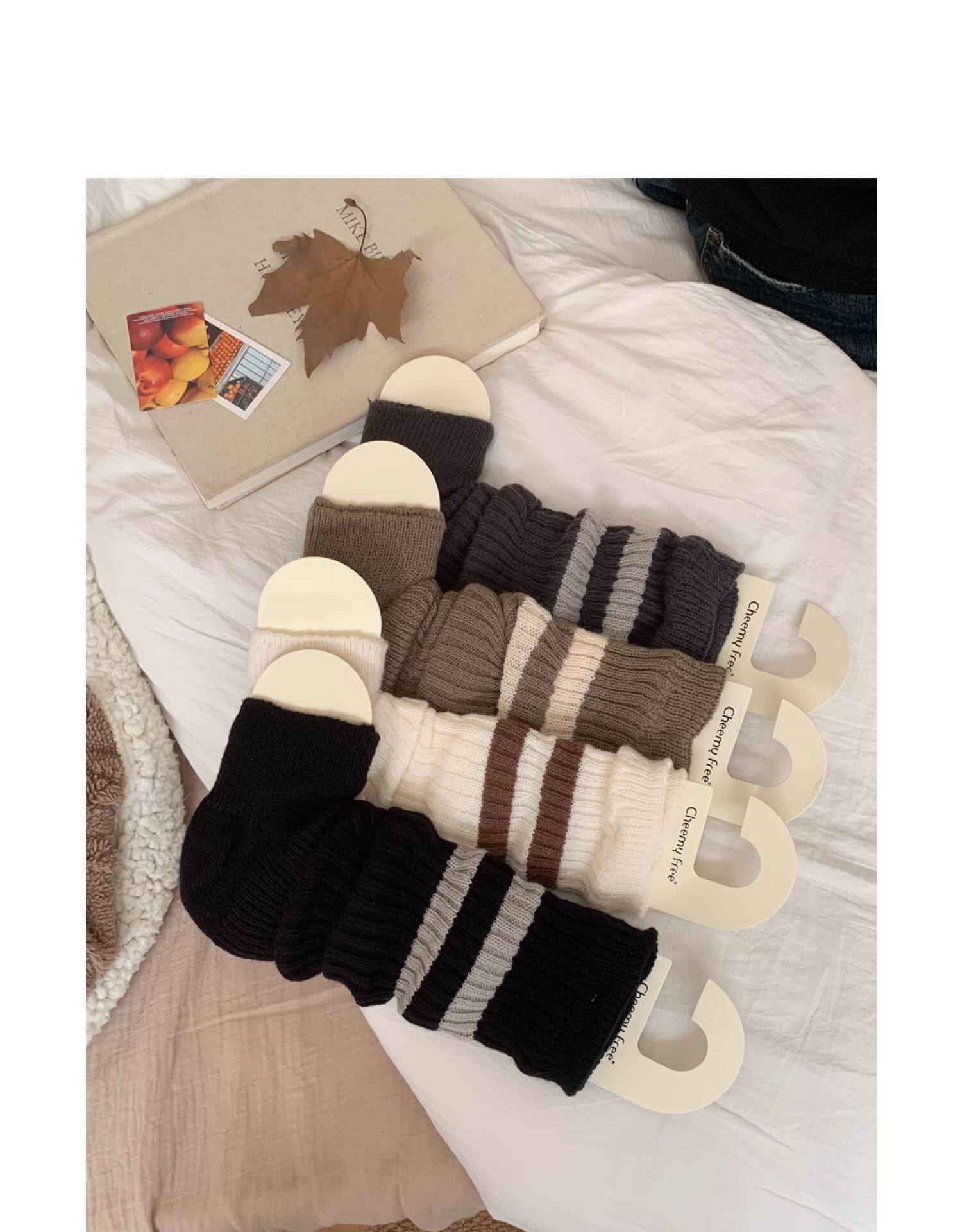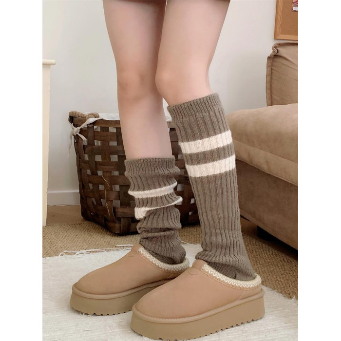 細細條 踩腳款針織襪套日系百搭條紋堆堆襪秋冬雪地靴長筒小腿襪