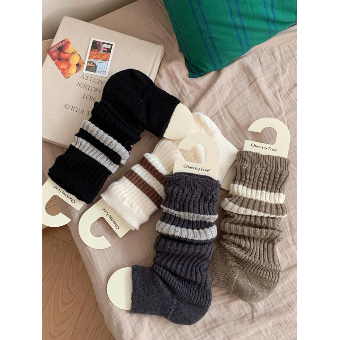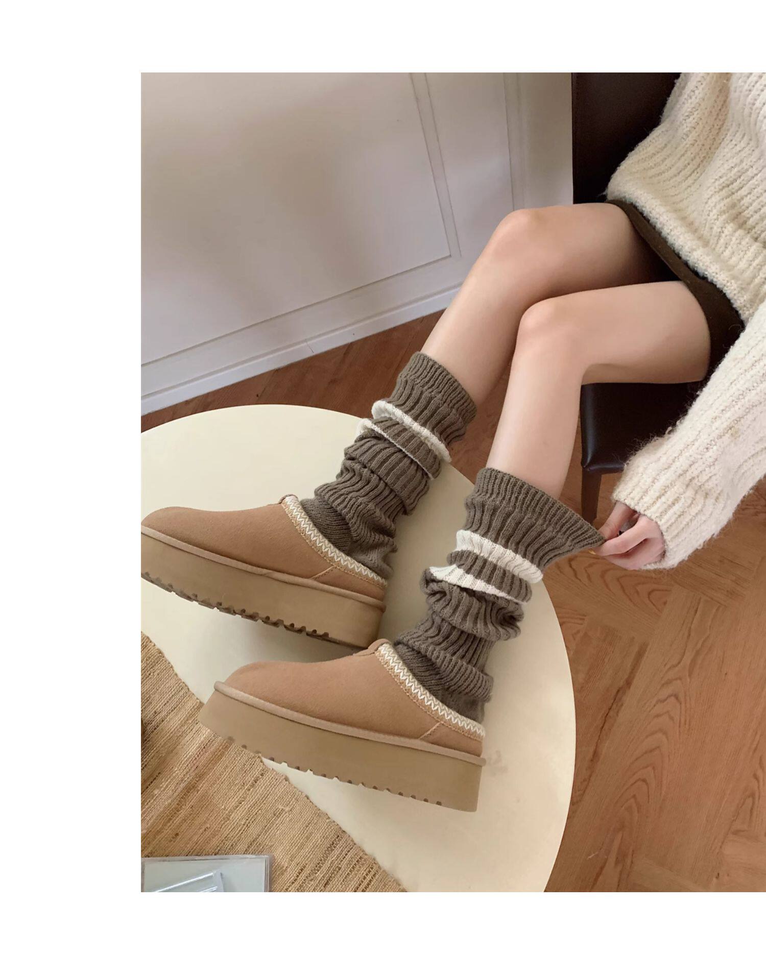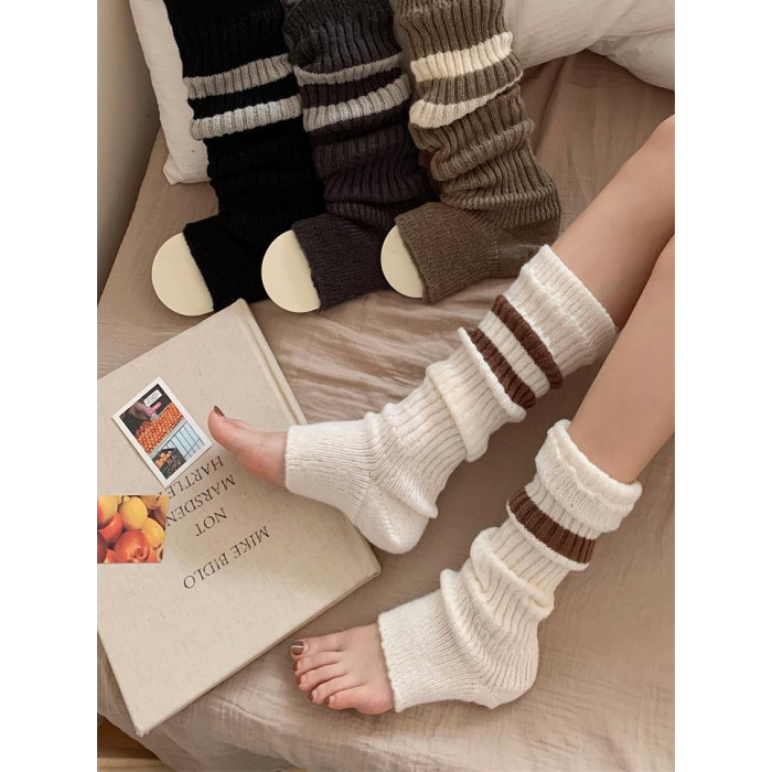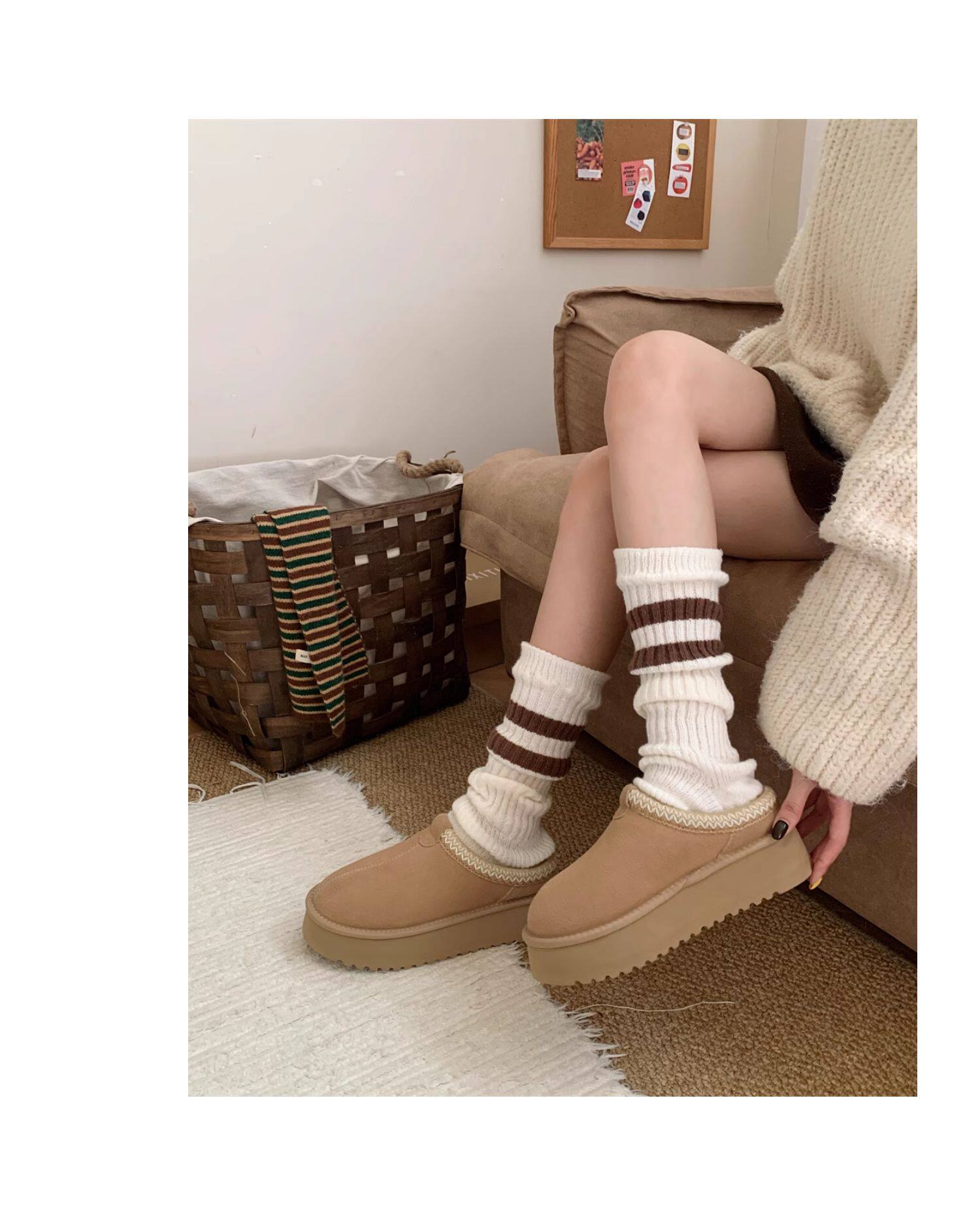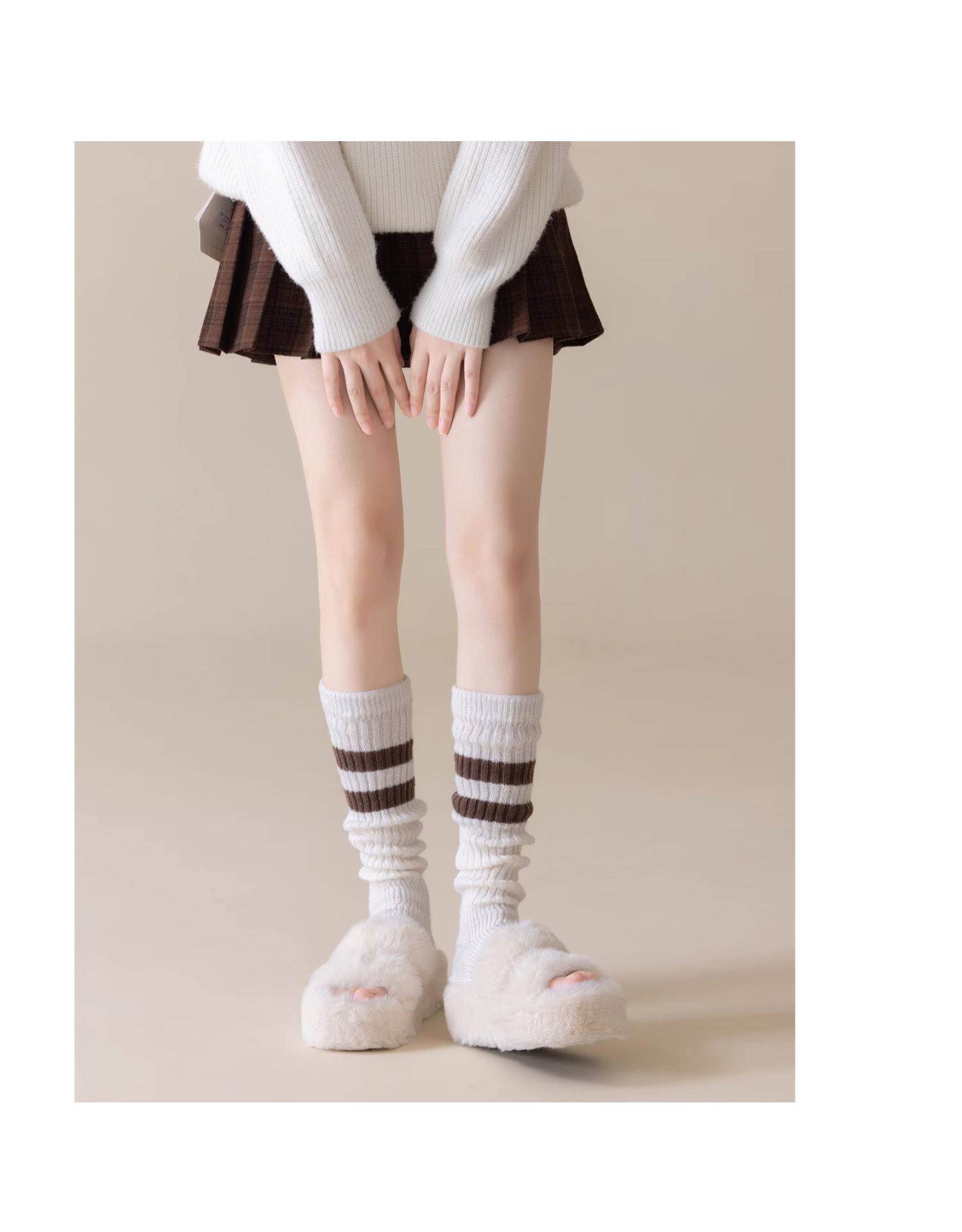 細細條 踩腳款針織襪套日系百搭條紋堆堆襪秋冬雪地靴長筒小腿襪