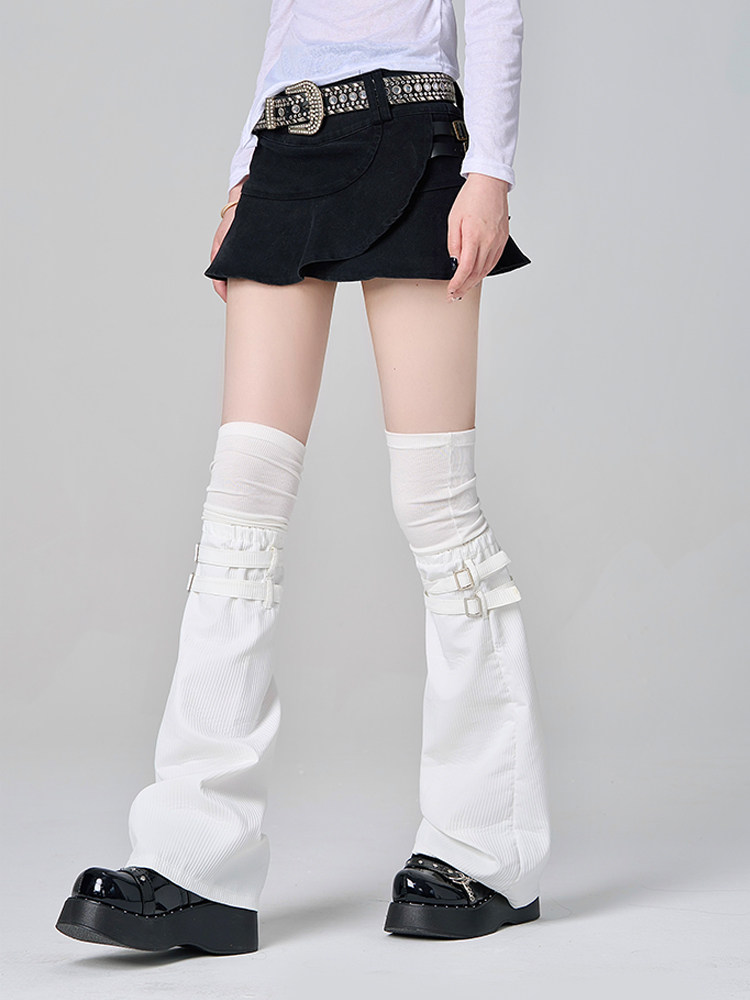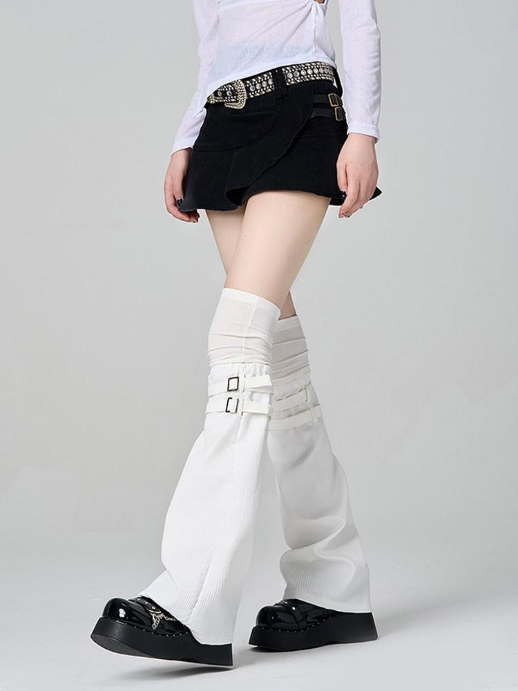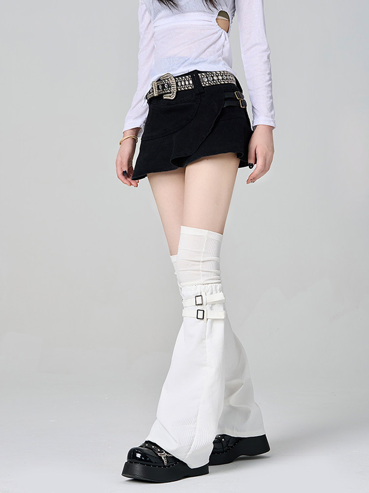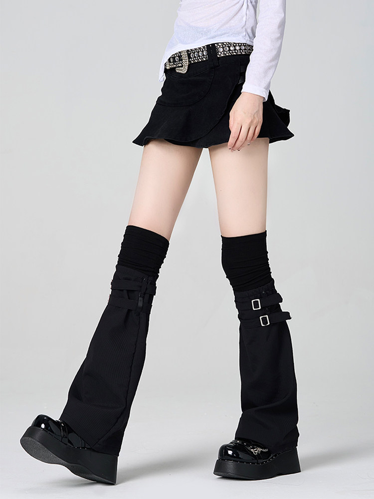 黑色高級拼接假兩件過膝腿套個性堆堆大腿襪亞文化皮釦濶腿襪套薄