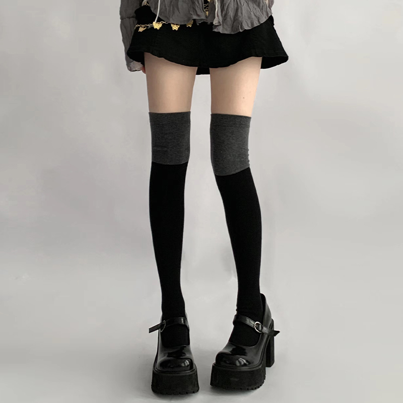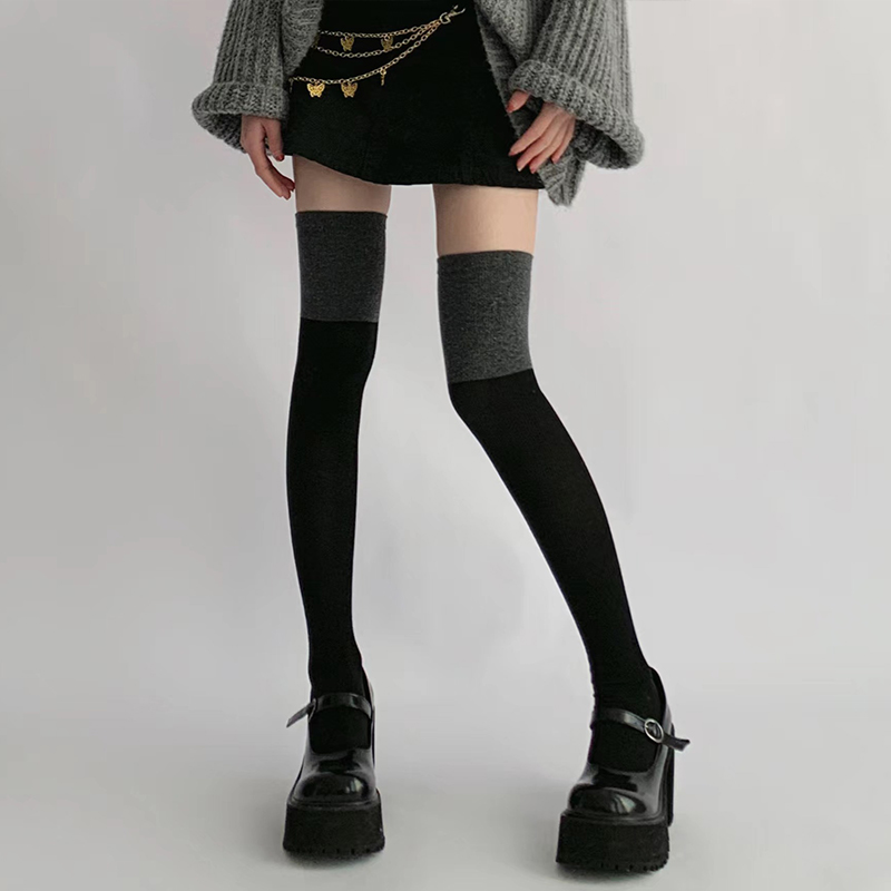 夜間教習室jk小腿襪女春秋壓力瘦腿黑灰拼接襪子半筒拼色過膝長筒