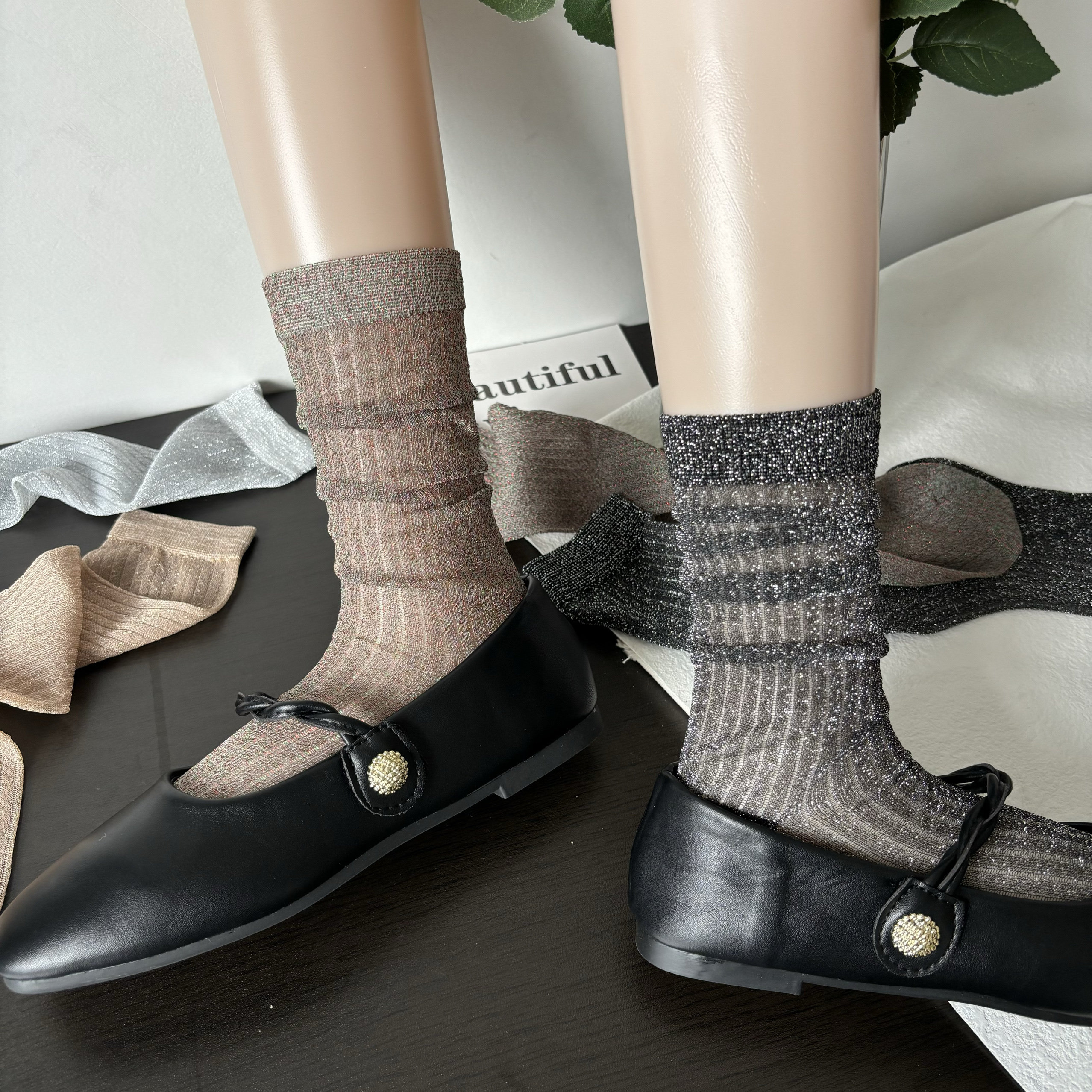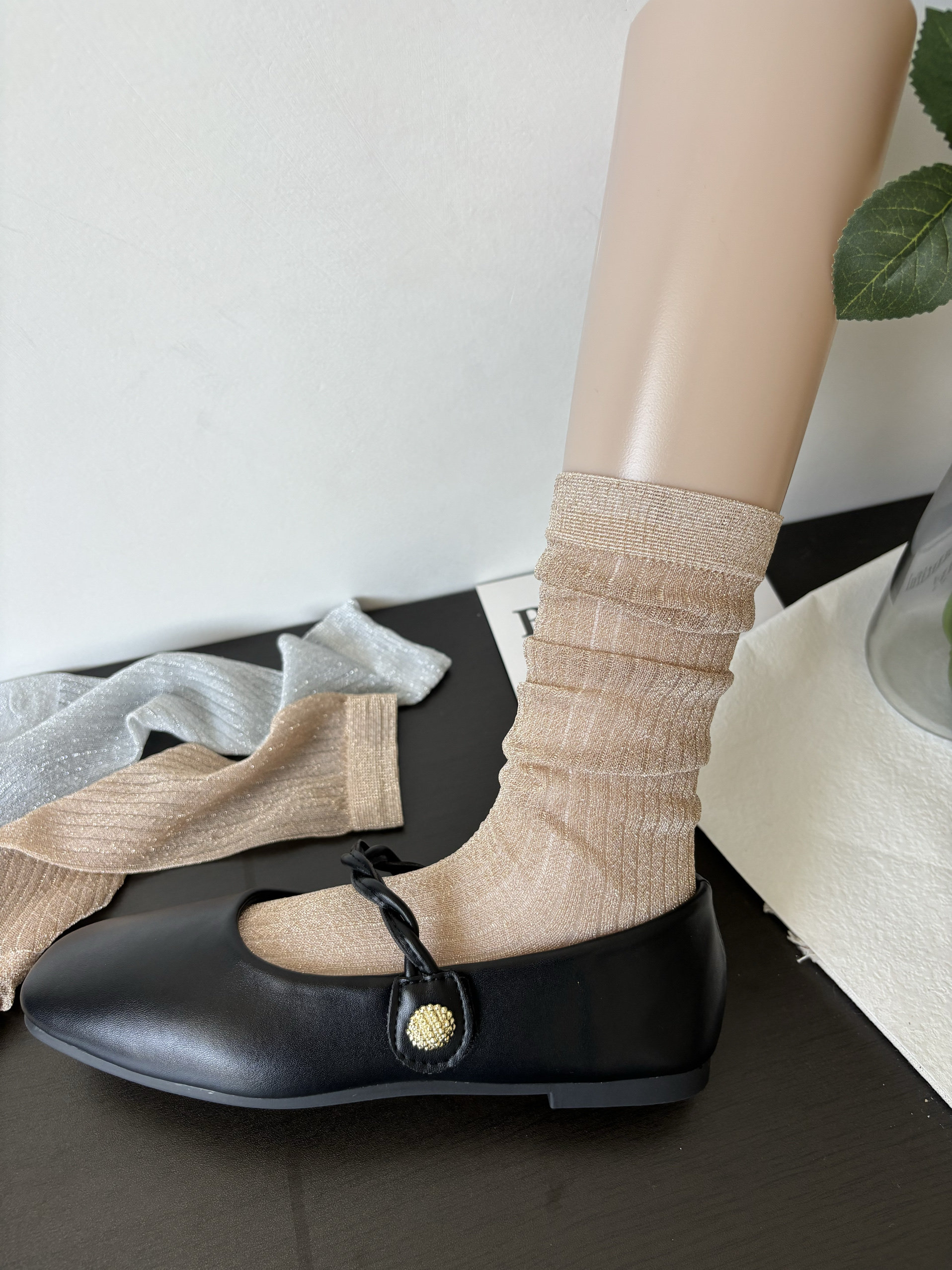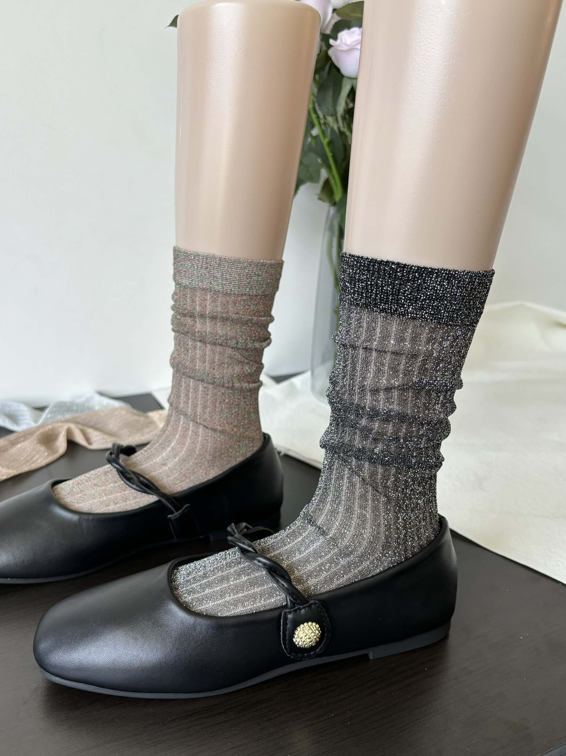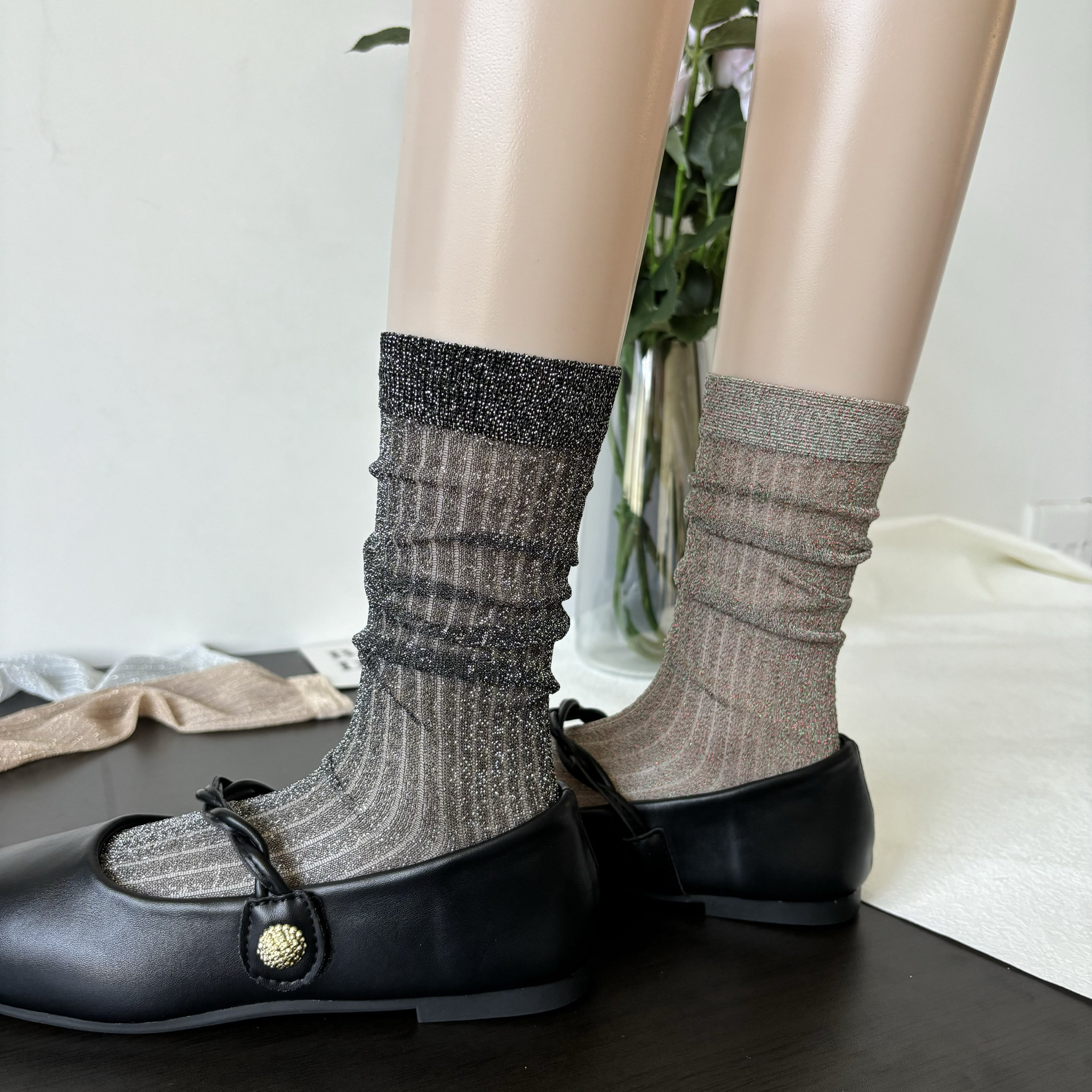夏季薄款微閃亮絲襪子女中筒襪ins潮復古時髦竪條紋走秀款堆堆襪