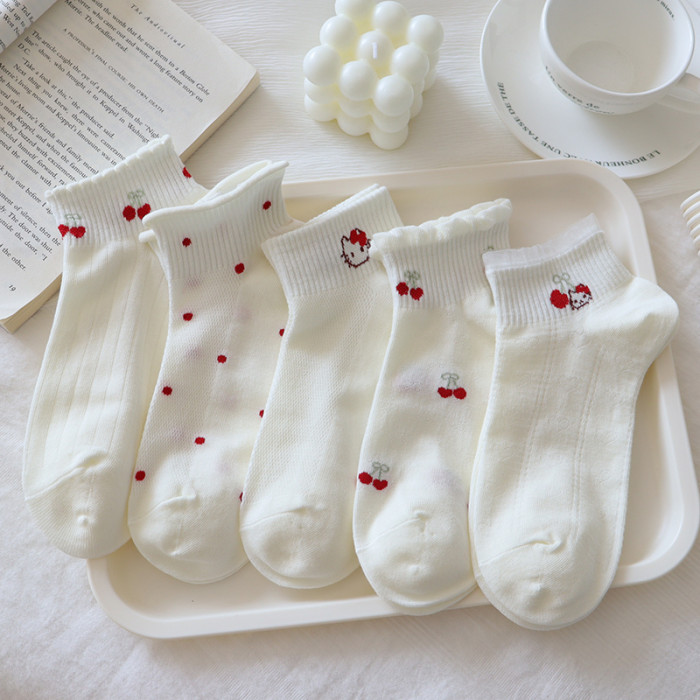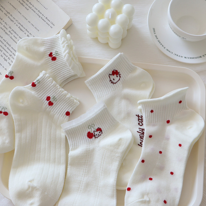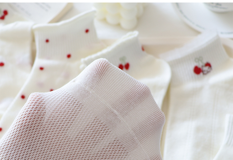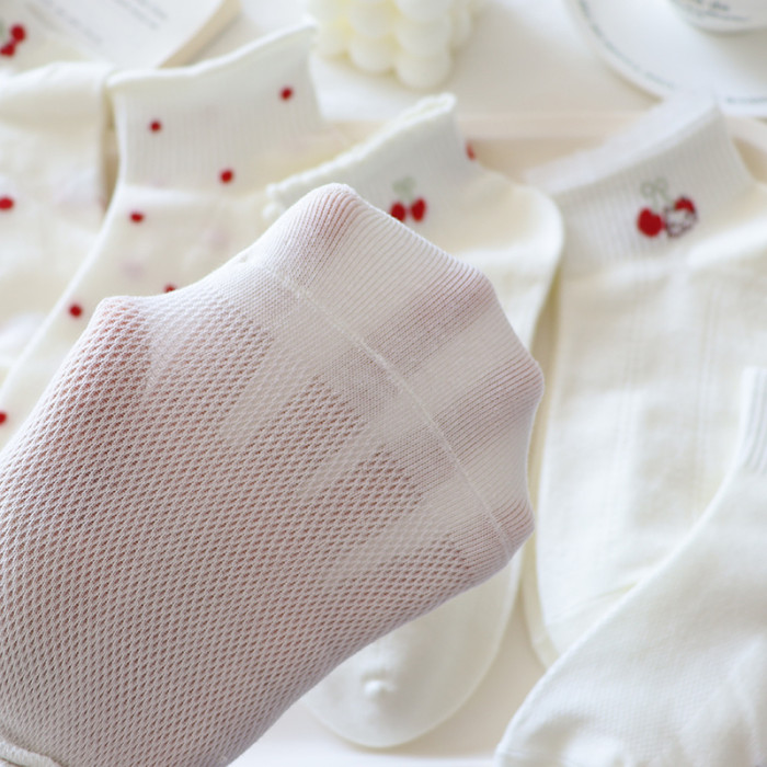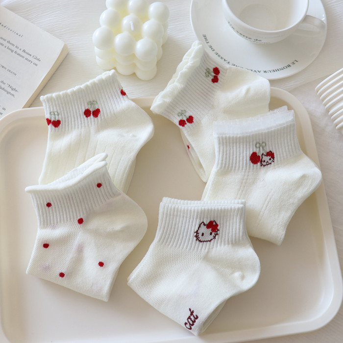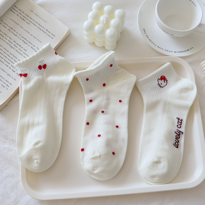 夏季奶白色襪子女短襪薄款純棉卡通kt貓低幫蕾絲花邊淺口船襪網眼