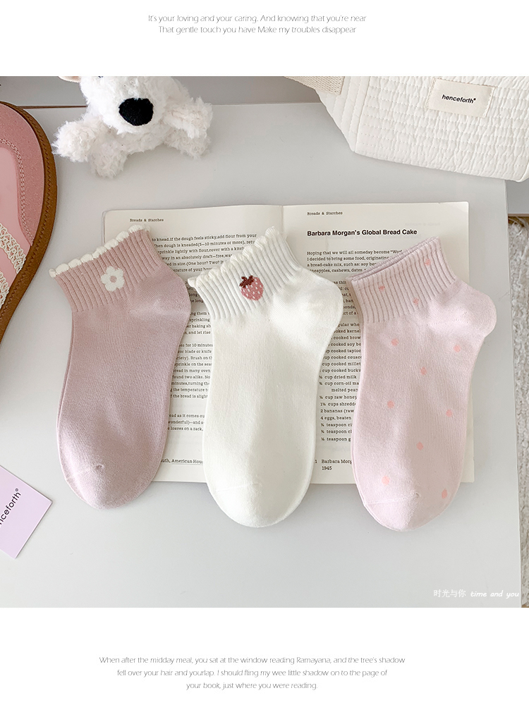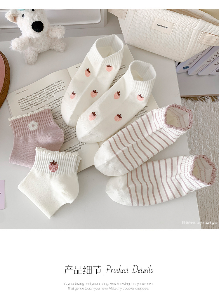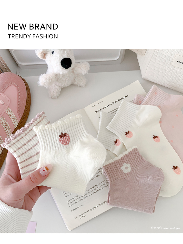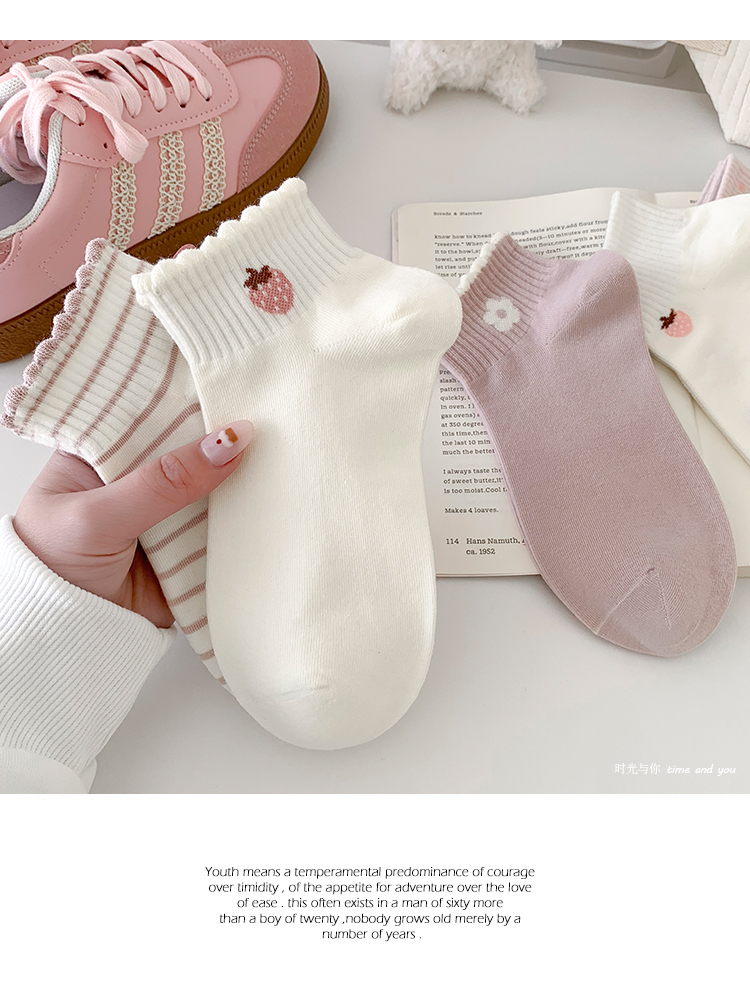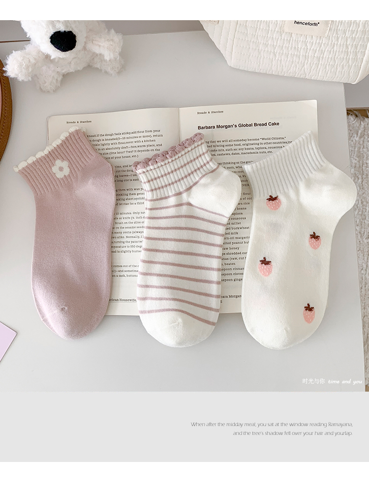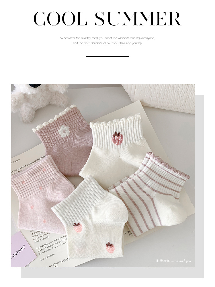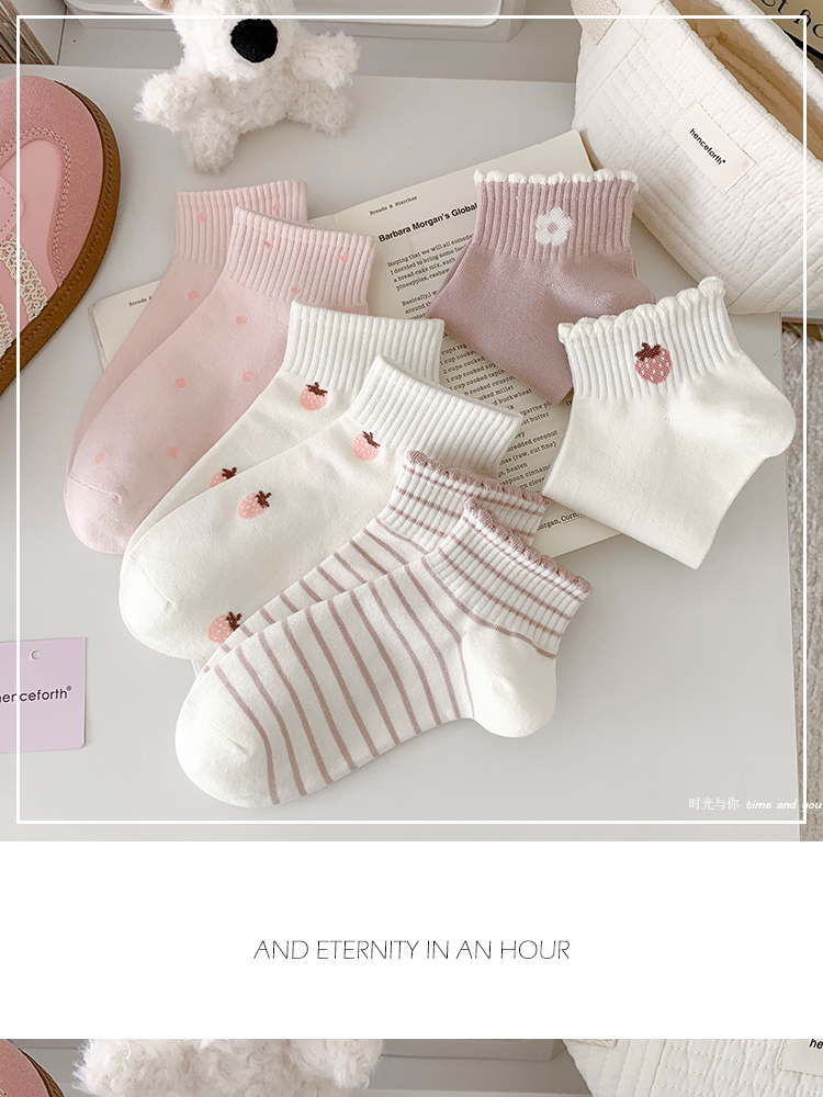 粉白草莓春夏襪子女短襪純棉透氣花邊條紋韓版甜美可愛ins潮運動