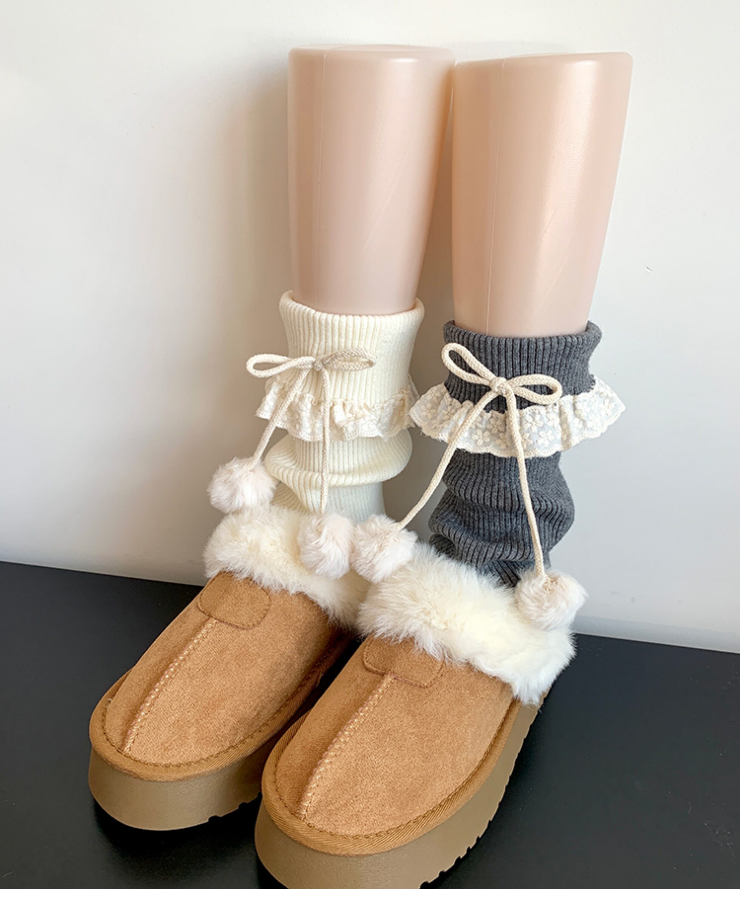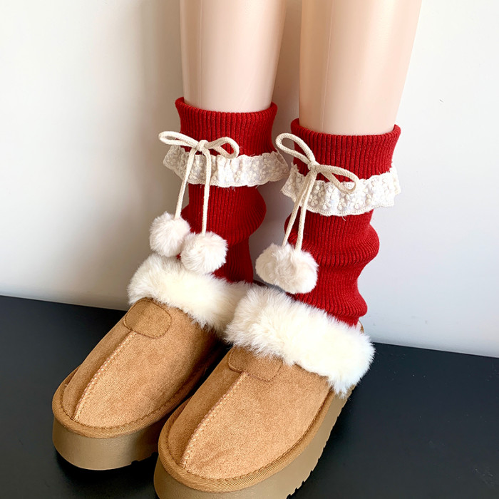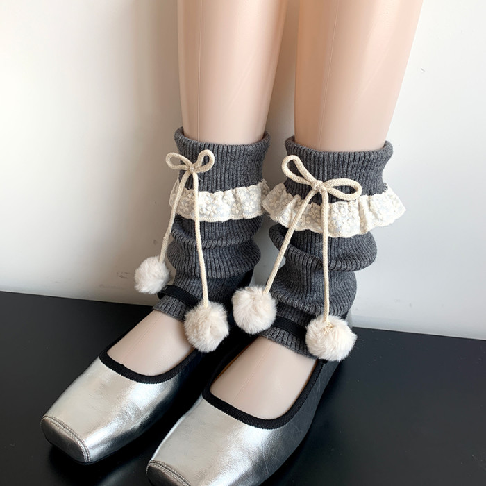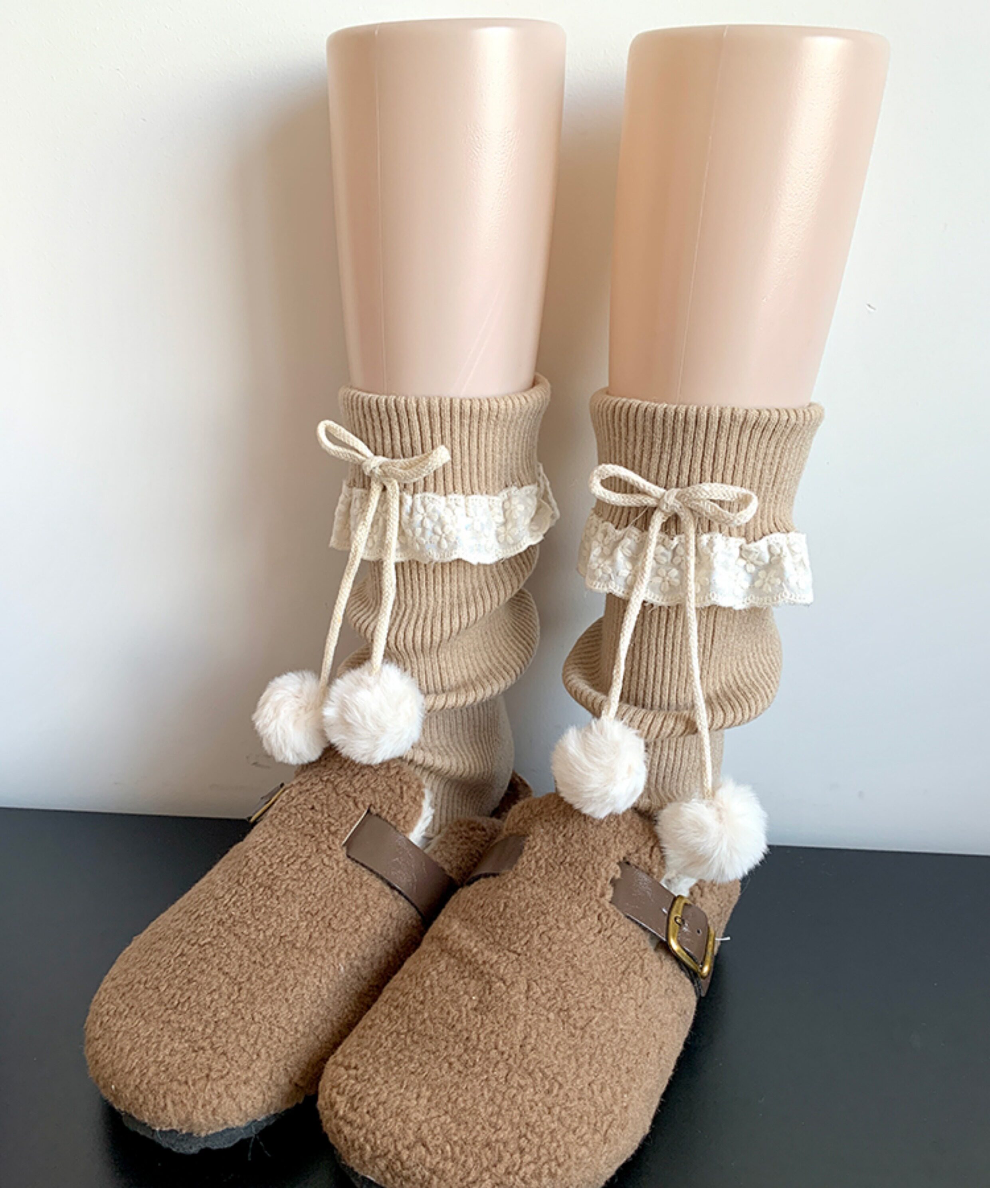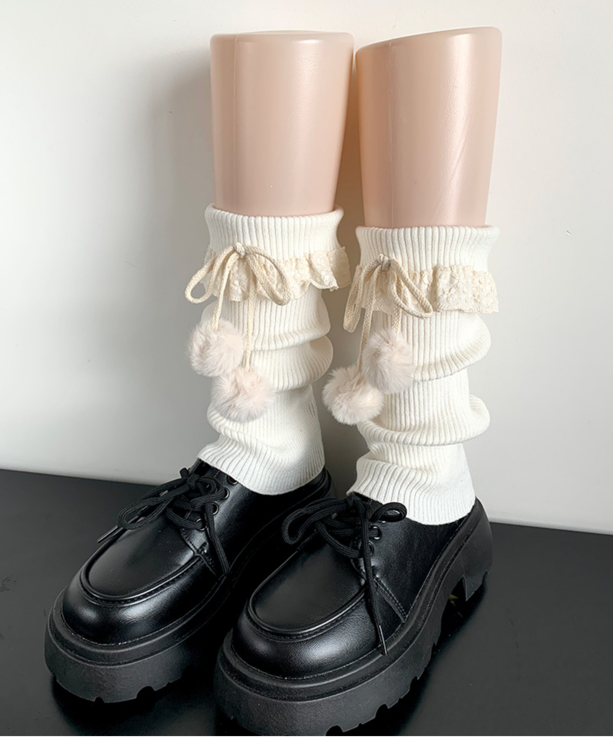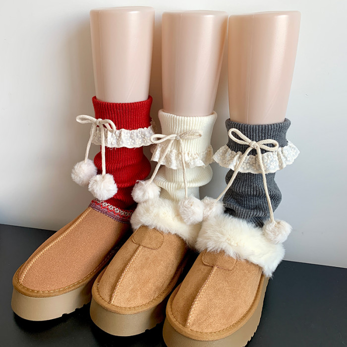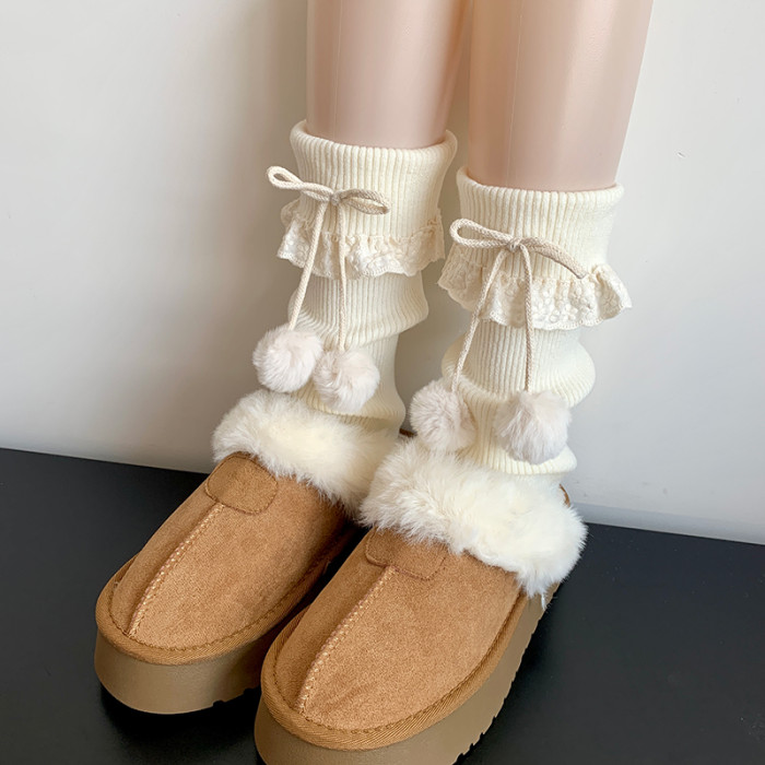 jk白色蕾絲花邊堆堆襪女中筒日系甜美毛球小腿套秋冬季雪地靴襪套