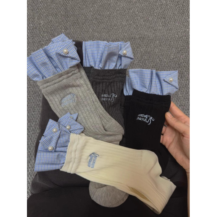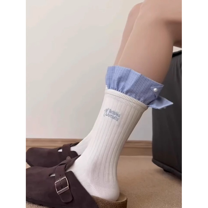miu系襪子女中筒春季龐克芭蕾風蝴蝶結珍珠堆堆襪飾品藍格子花邊