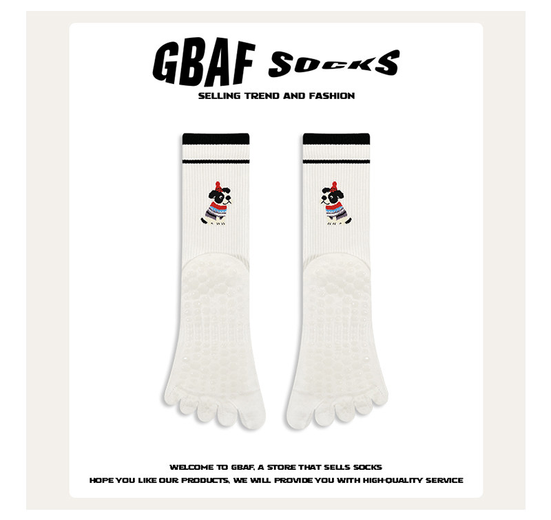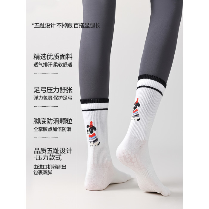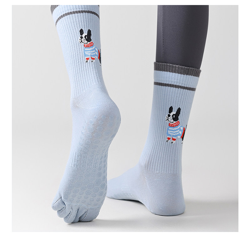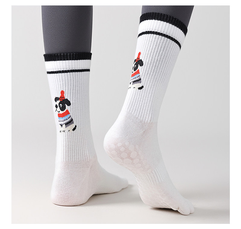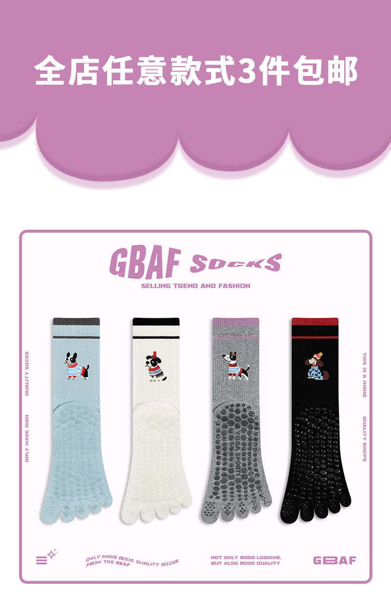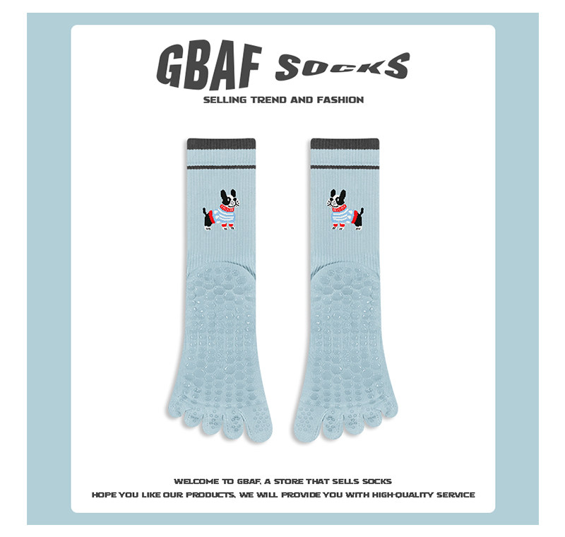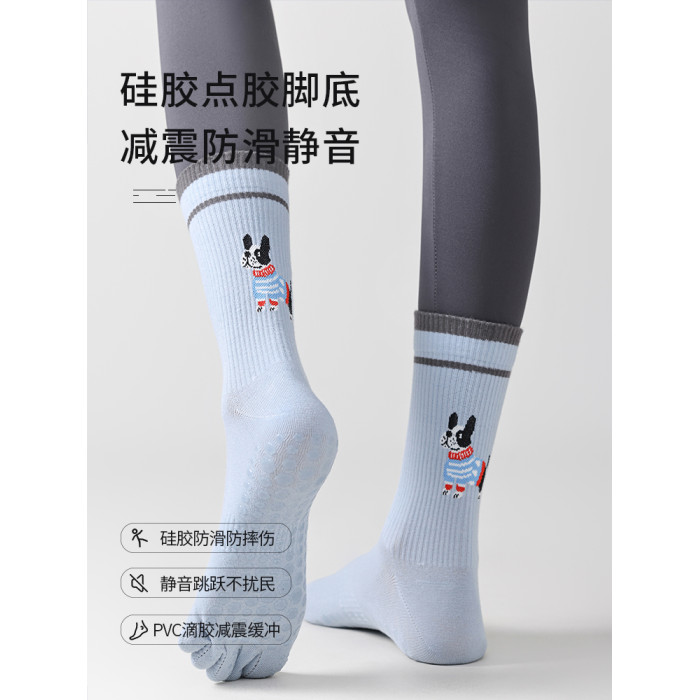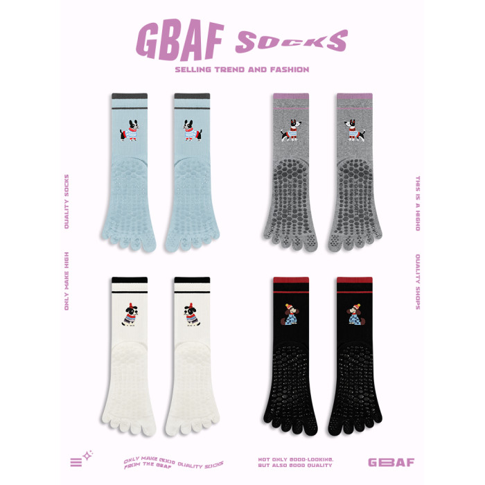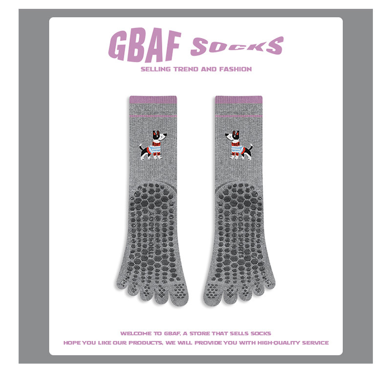 "GBAF"可愛後跟小狗防滑瑜珈襪條紋運動健身專用普拉提五指中筒襪