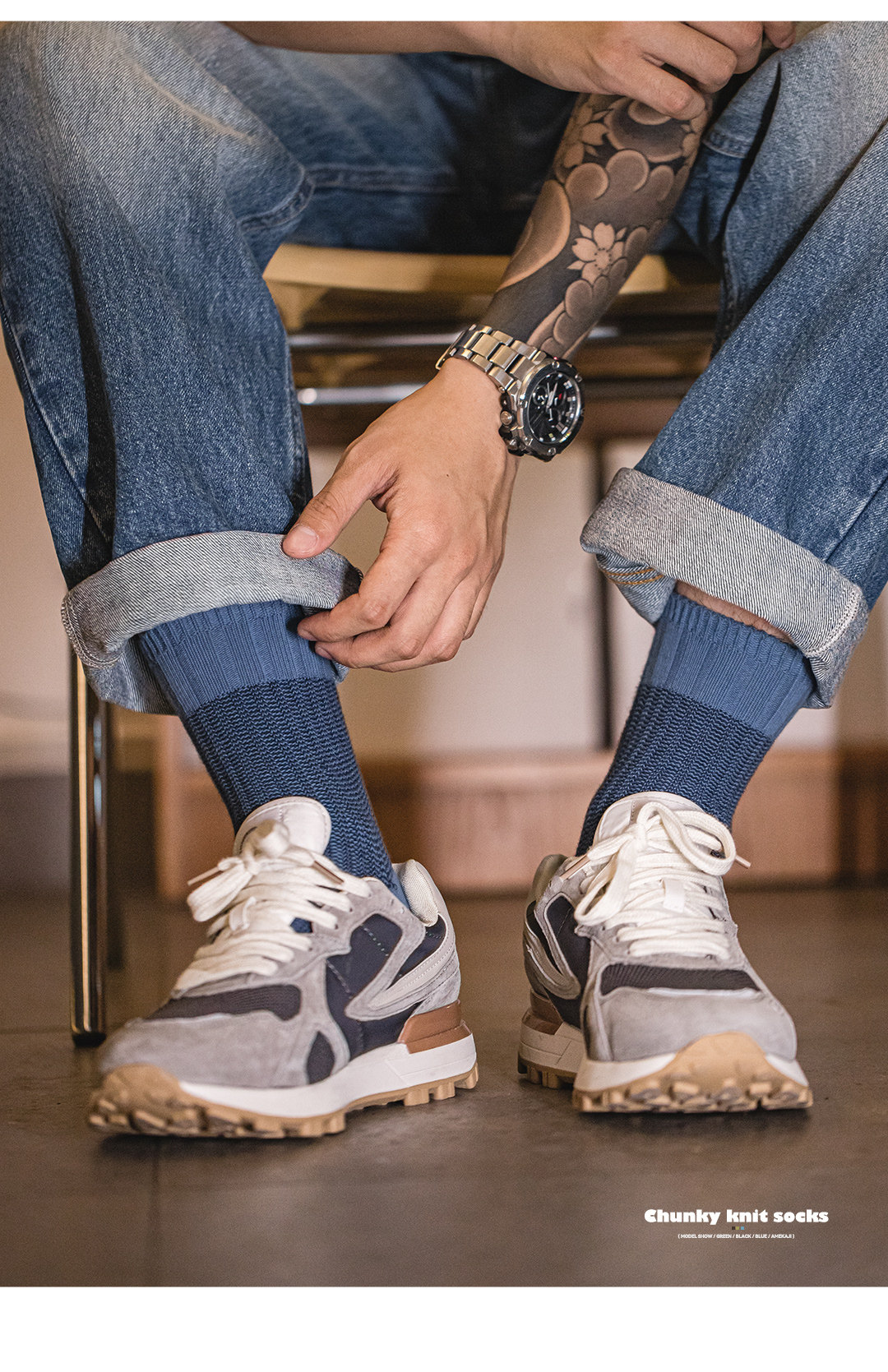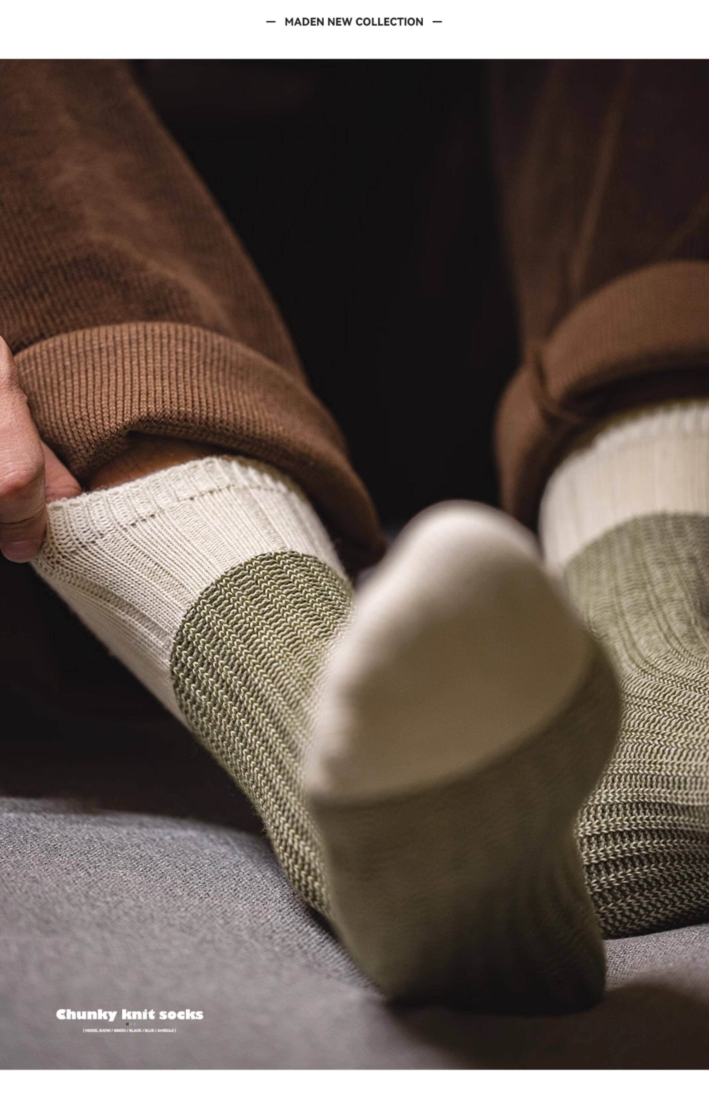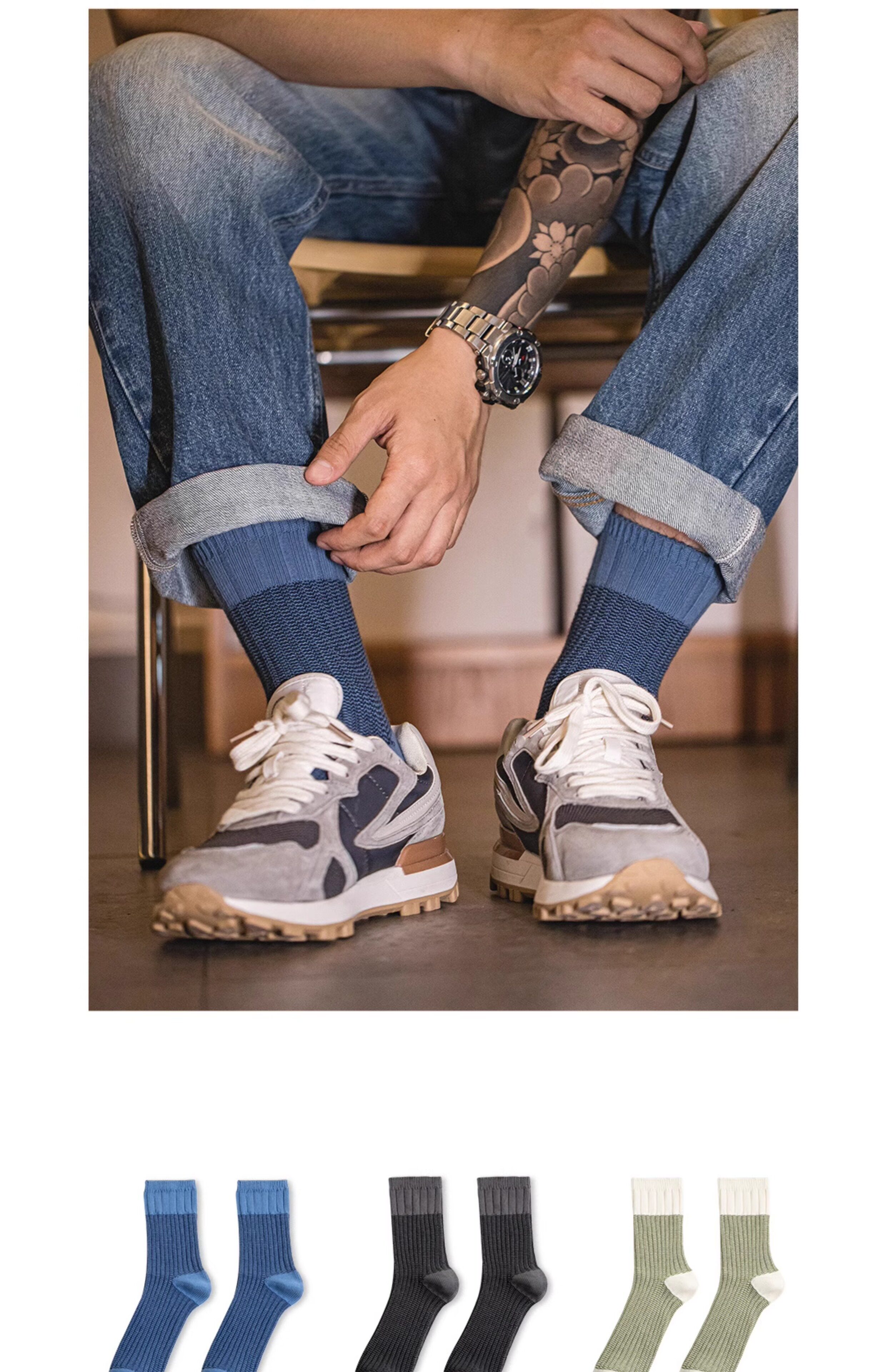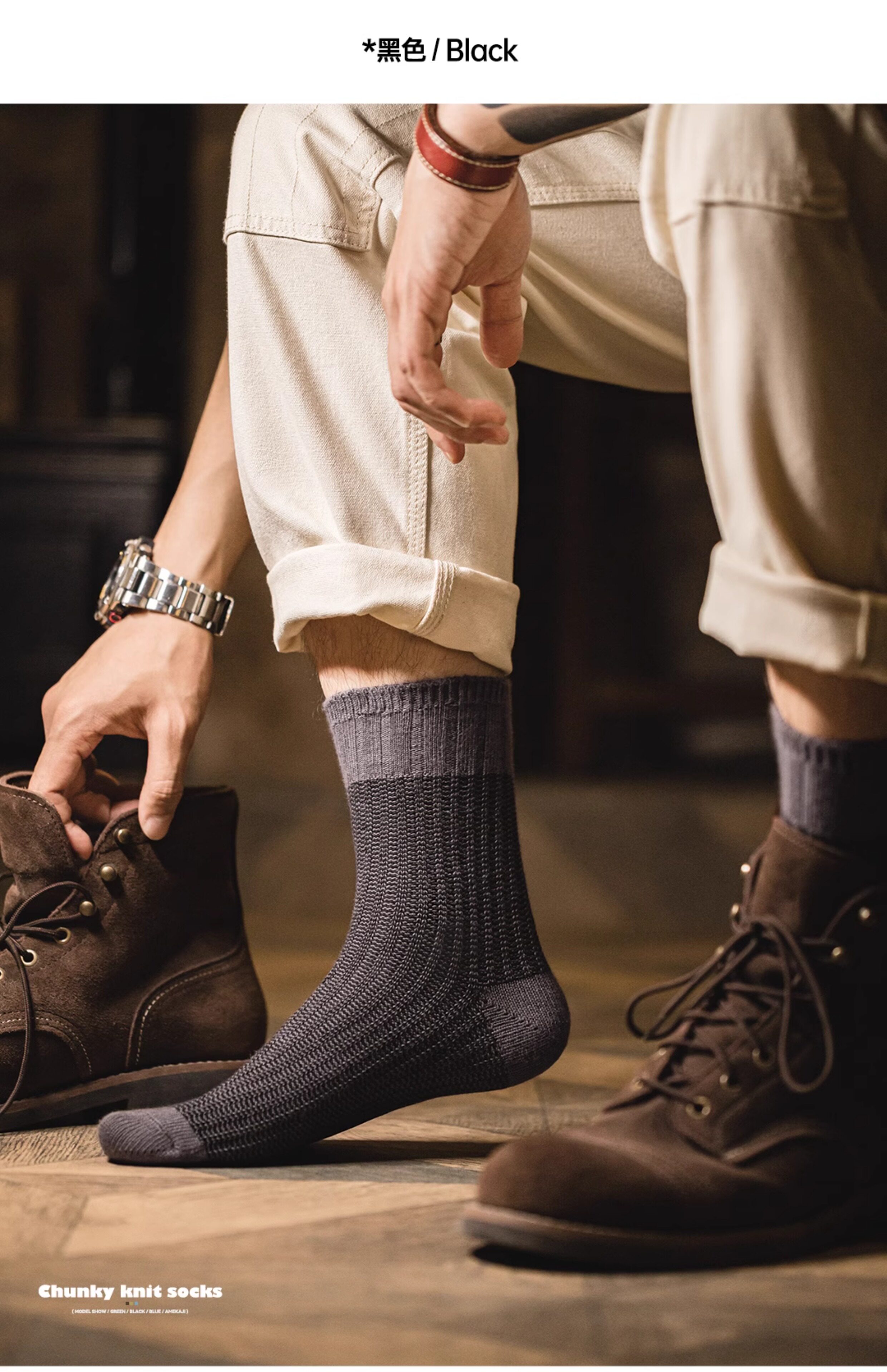 馬登工裝美式復古撞色針織中筒襪透氣粗線拼接小衆雙針長襪子男秋