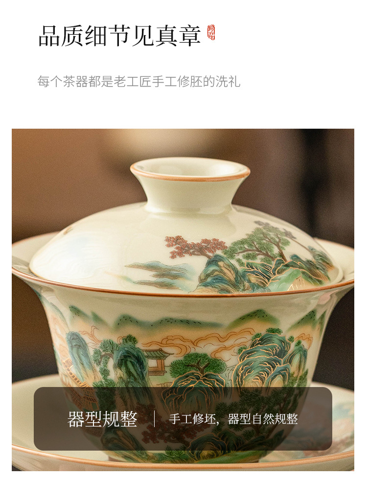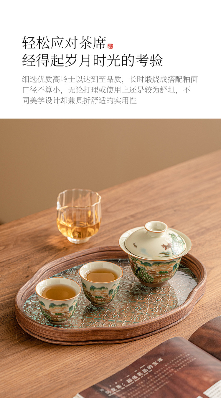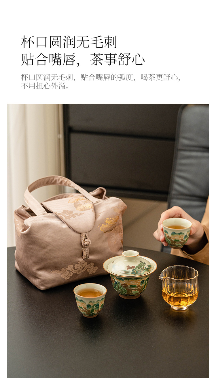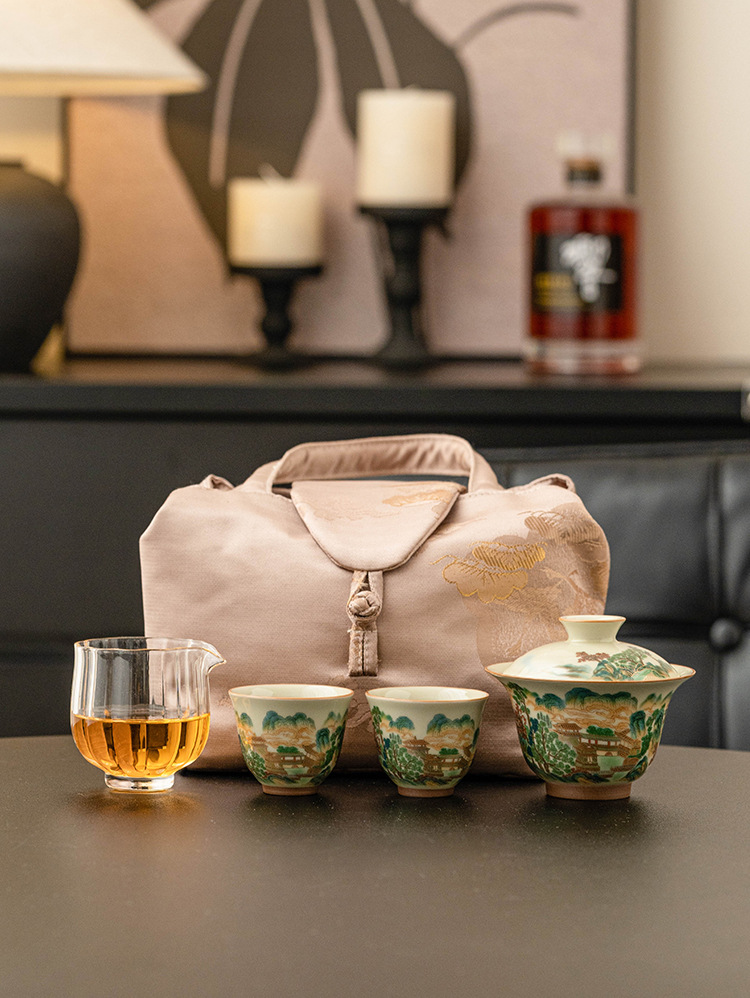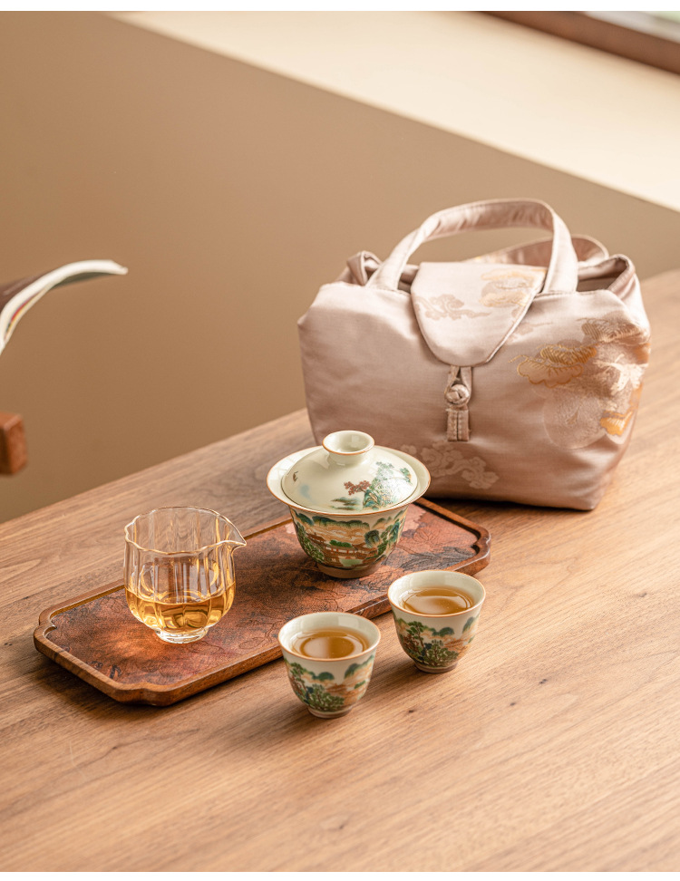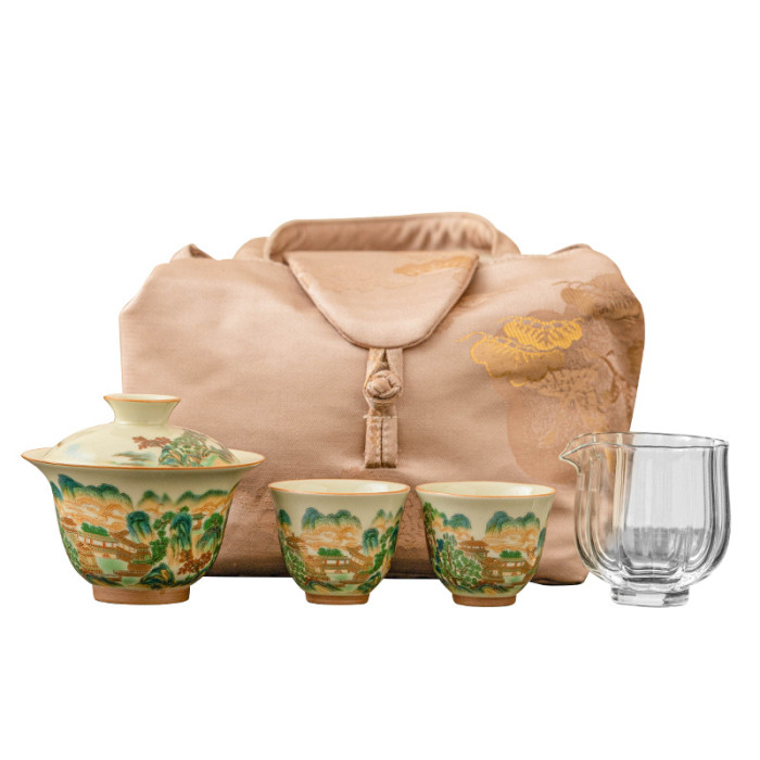 五彩山水玲瓏三才蓋碗旅行功夫茶具一壺兩杯戶外可攜式泡茶杯
