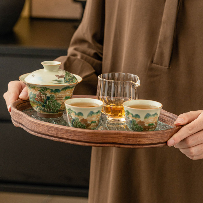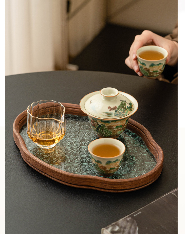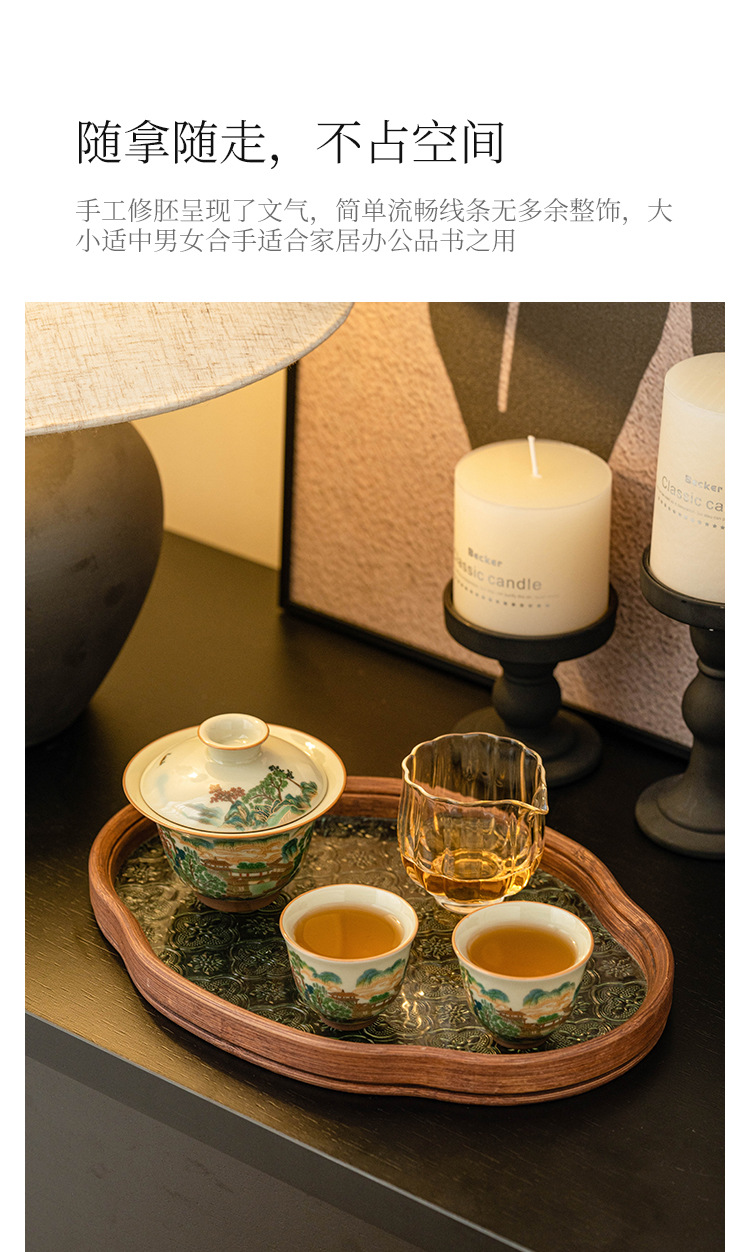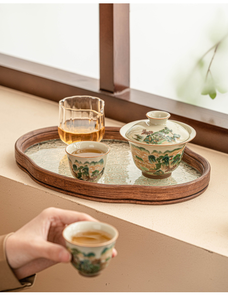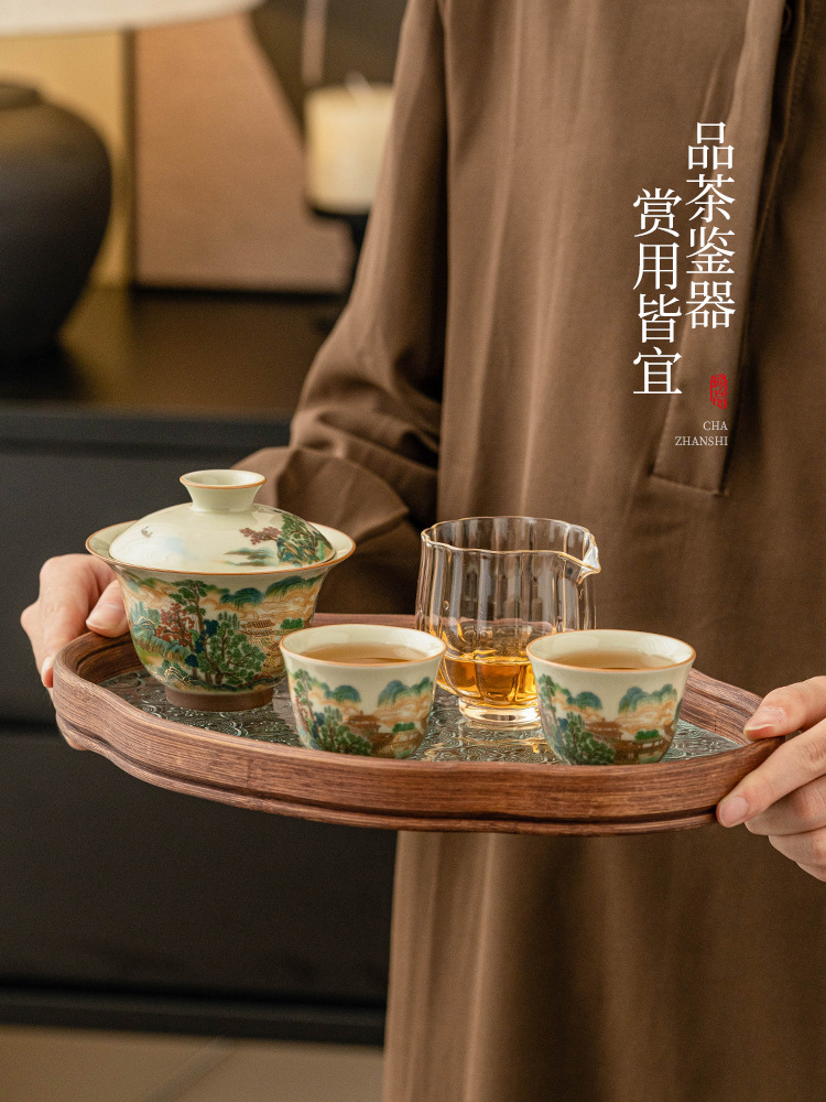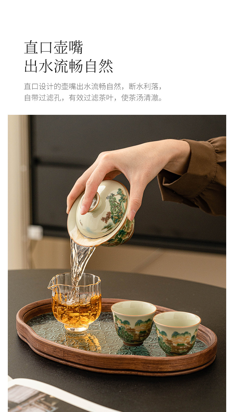 五彩山水玲瓏三才蓋碗旅行功夫茶具一壺兩杯戶外可攜式泡茶杯