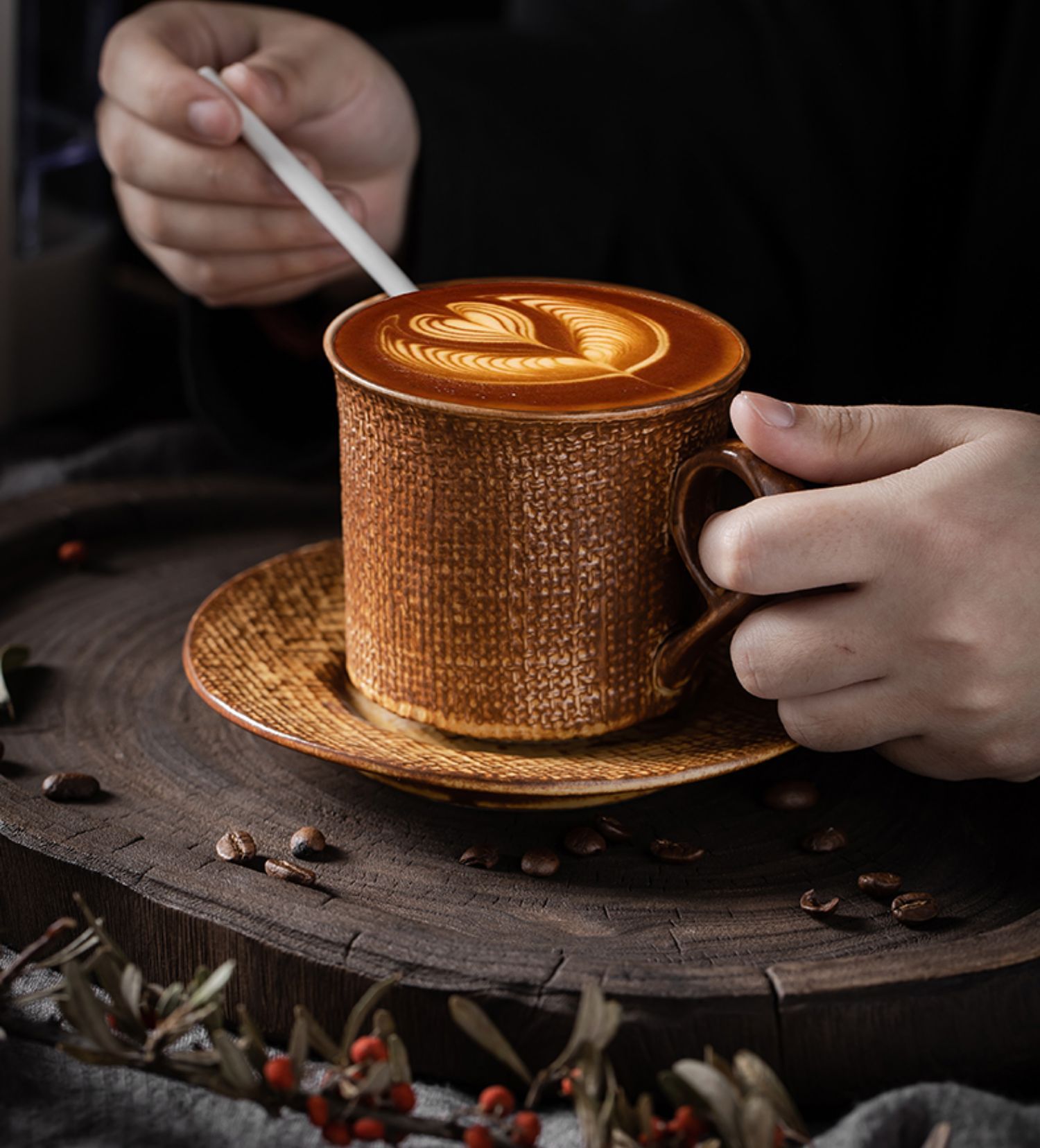日本瀨戶燒古樸手作粗陶麻紋咖啡杯杯子點心碟下午茶杯日式馬克杯