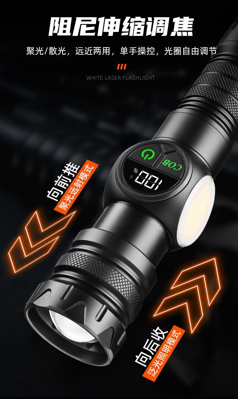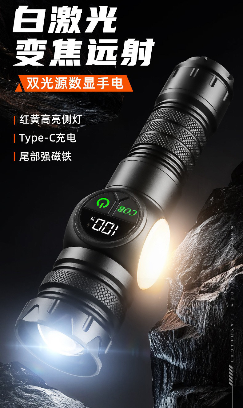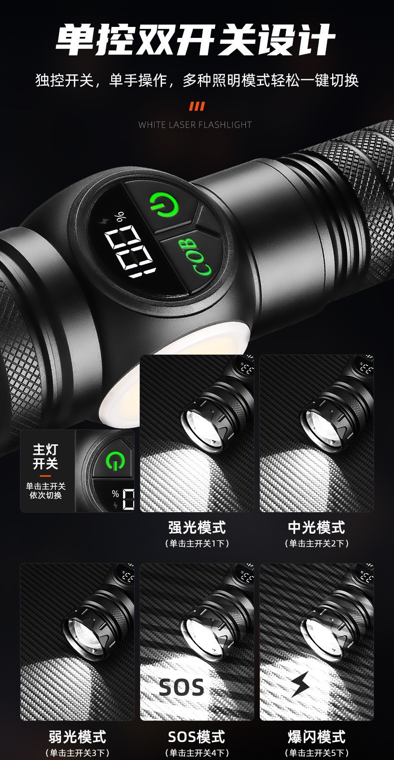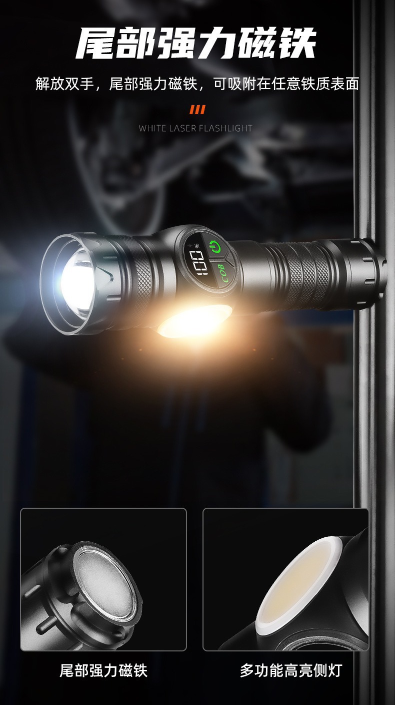 新款雙開關白雷射強光手電筒雙光源側燈數字屏顯強磁強光手電