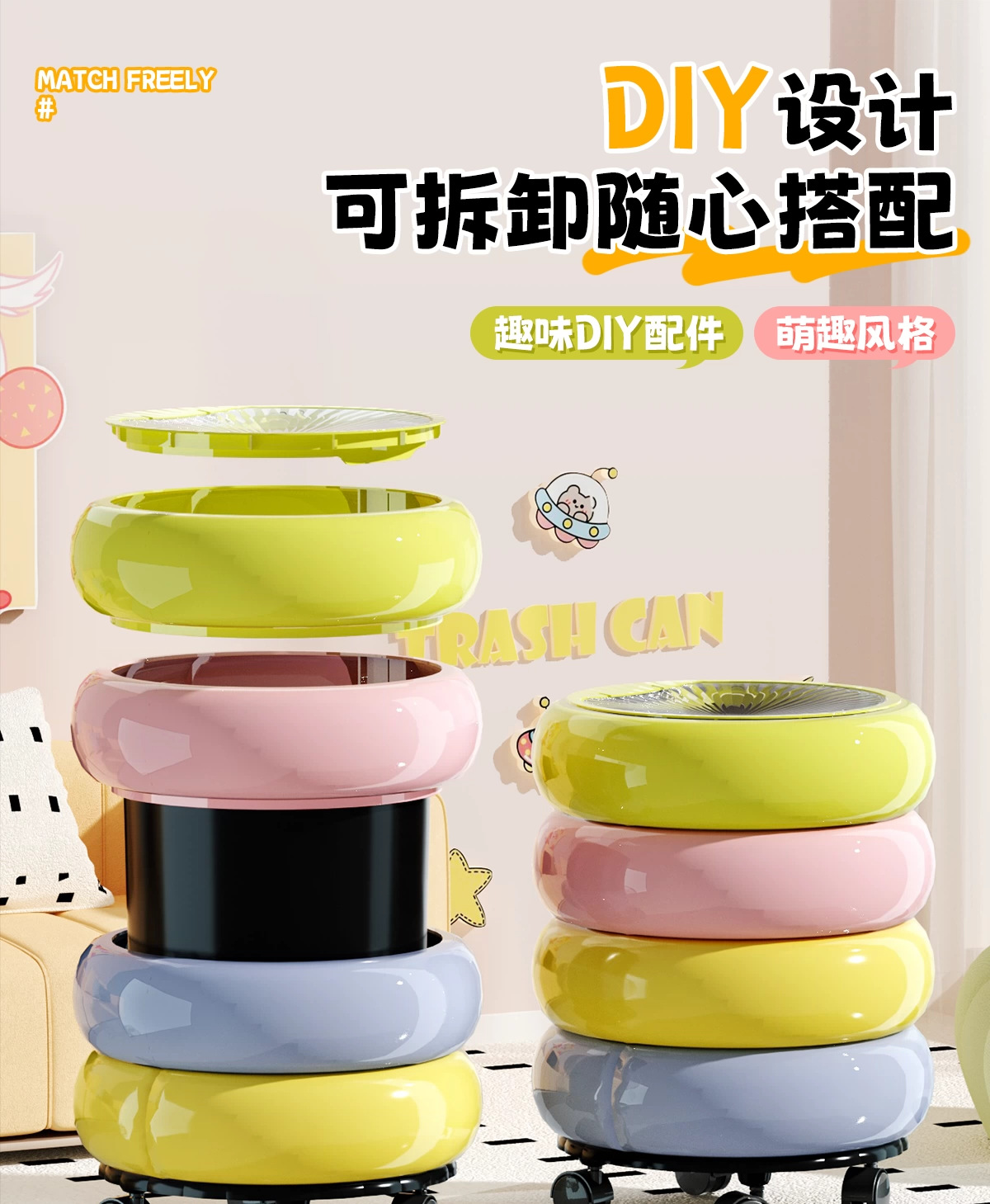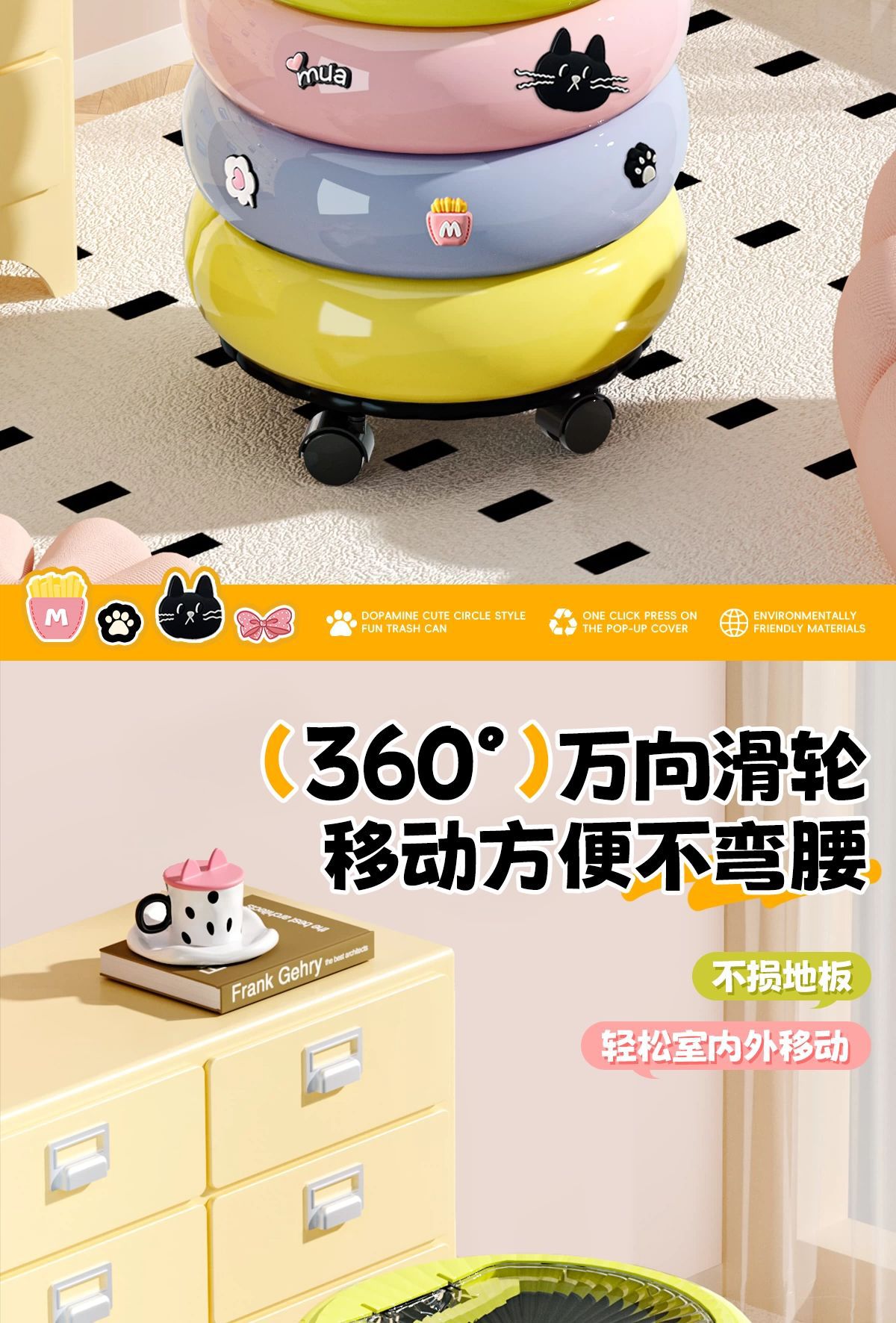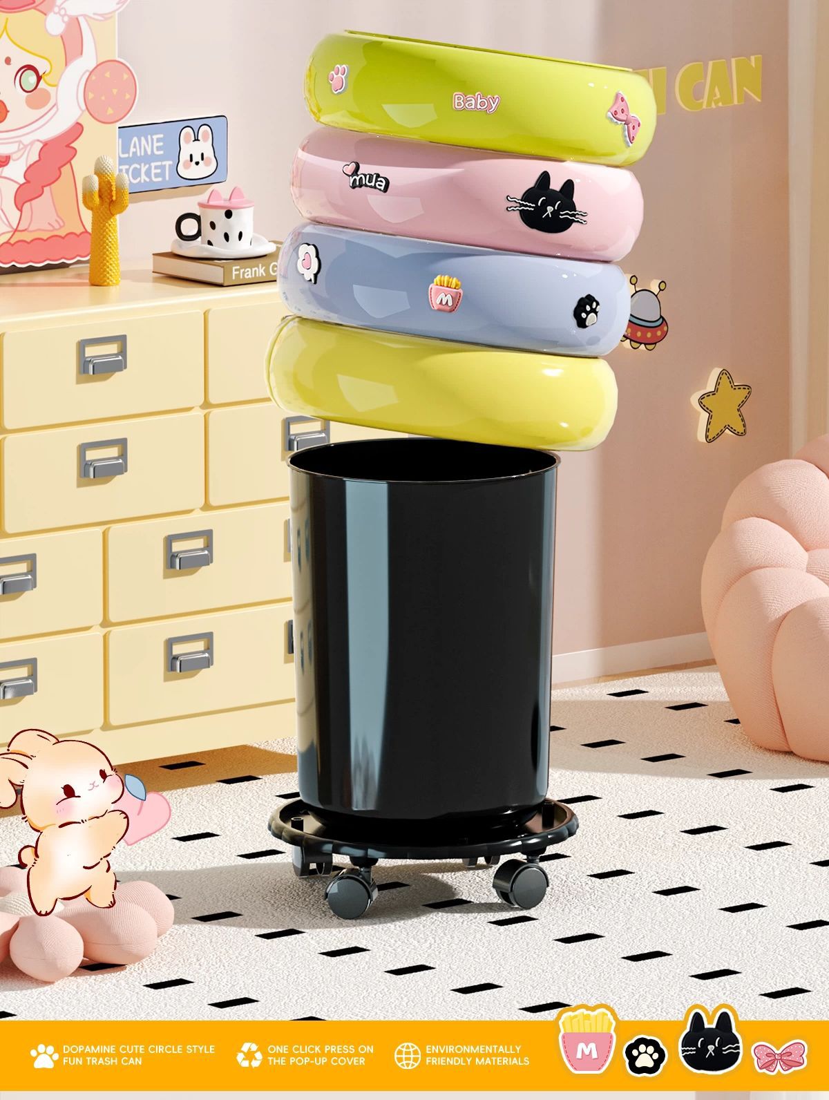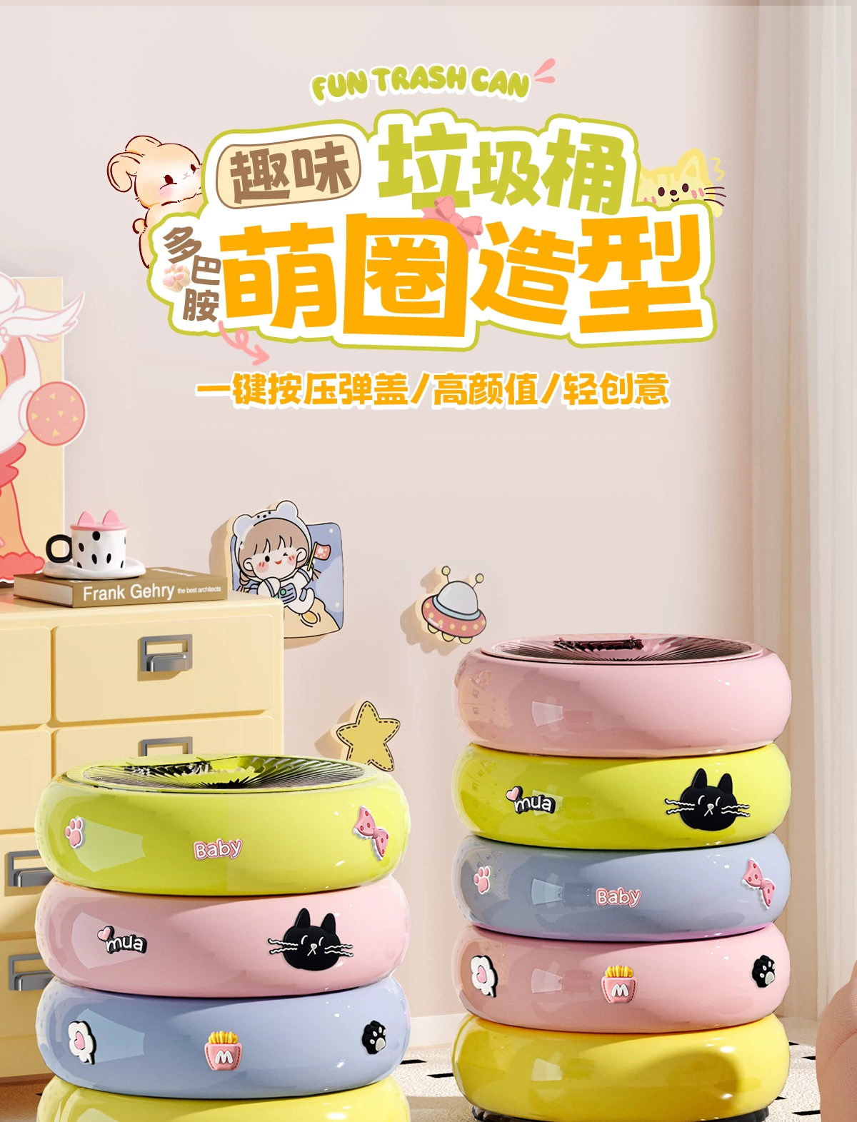垃圾桶家用客廳廚房輕奢高檔帶蓋甜甜圈收納桶卡通可愛可移動紙簍