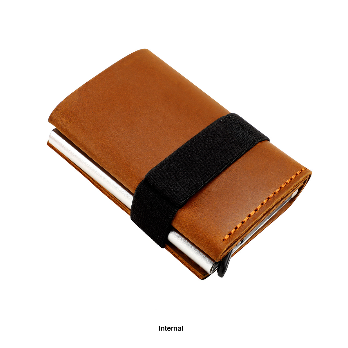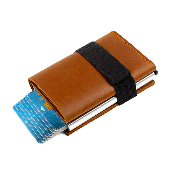 瘋馬皮防盜刷三折鋁盒卡包松緊帶搭釦錢包手動彈出卡夾卡套美金包