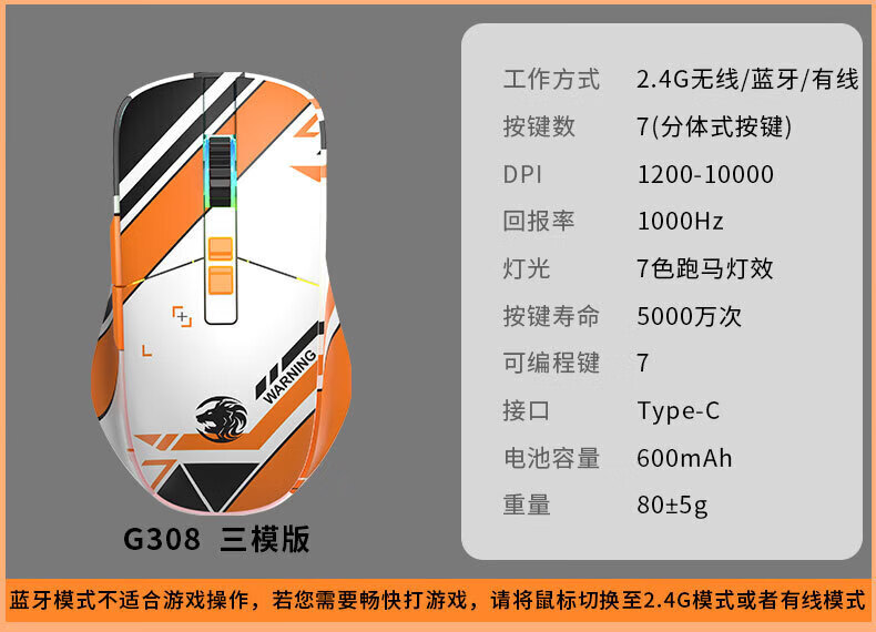 前行者G308無線藍牙遊戯滑鼠 電腦靜音無線藍牙三模可充電式滑鼠