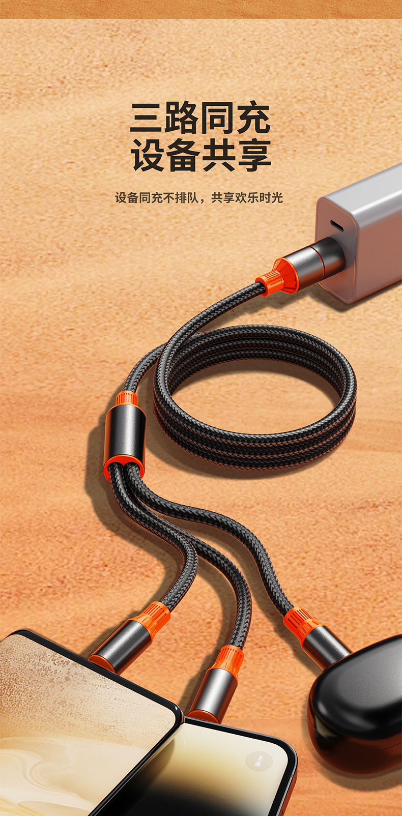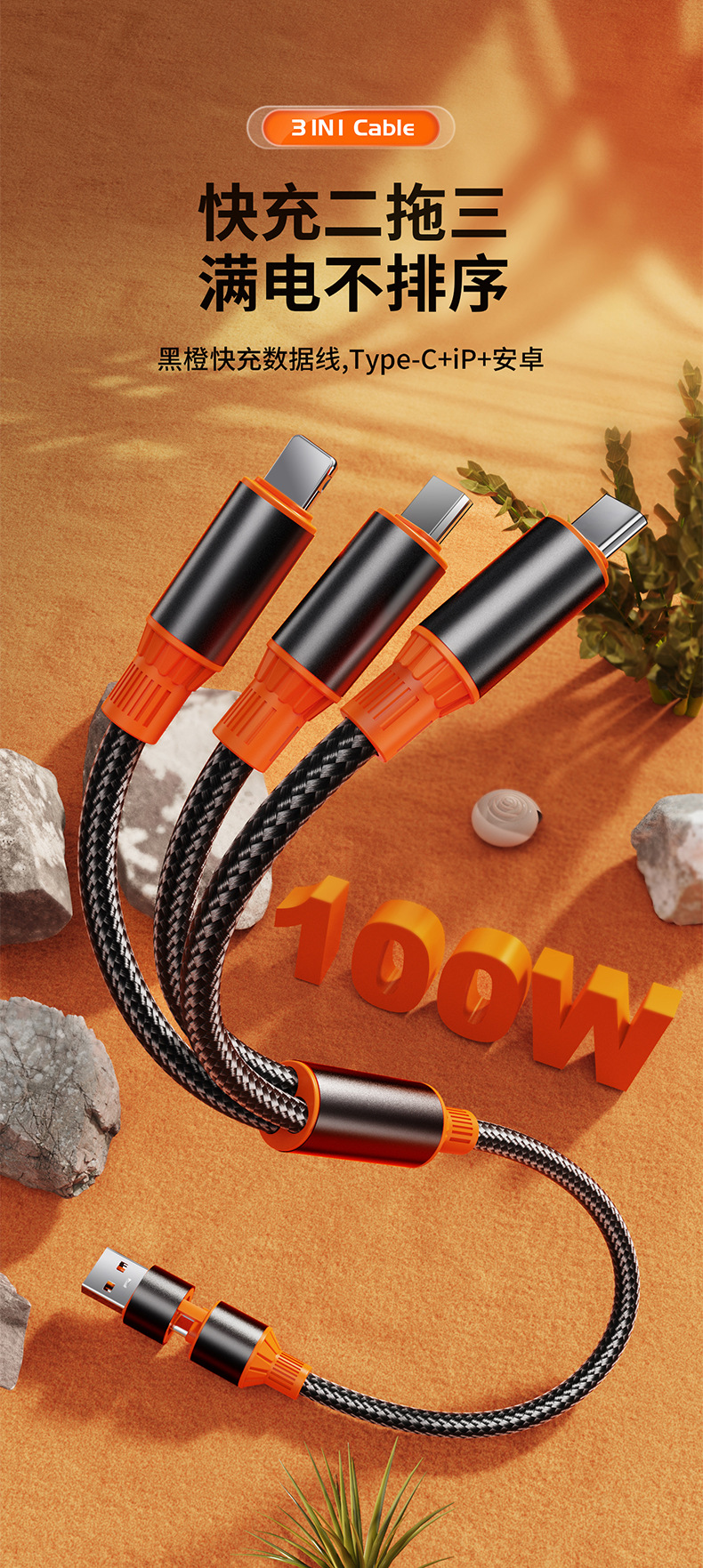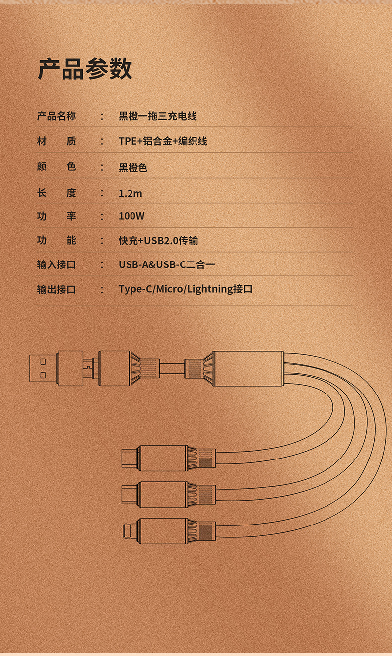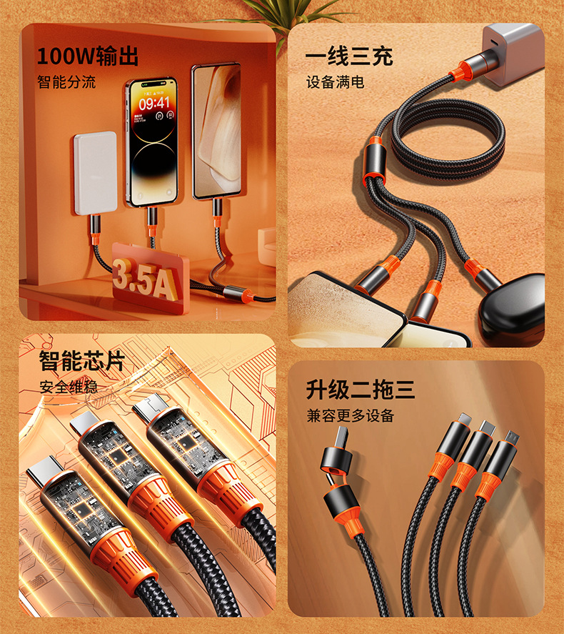 | 型號 | 黑金橙【USB+Type-C口二拖三】100W超級快充 |