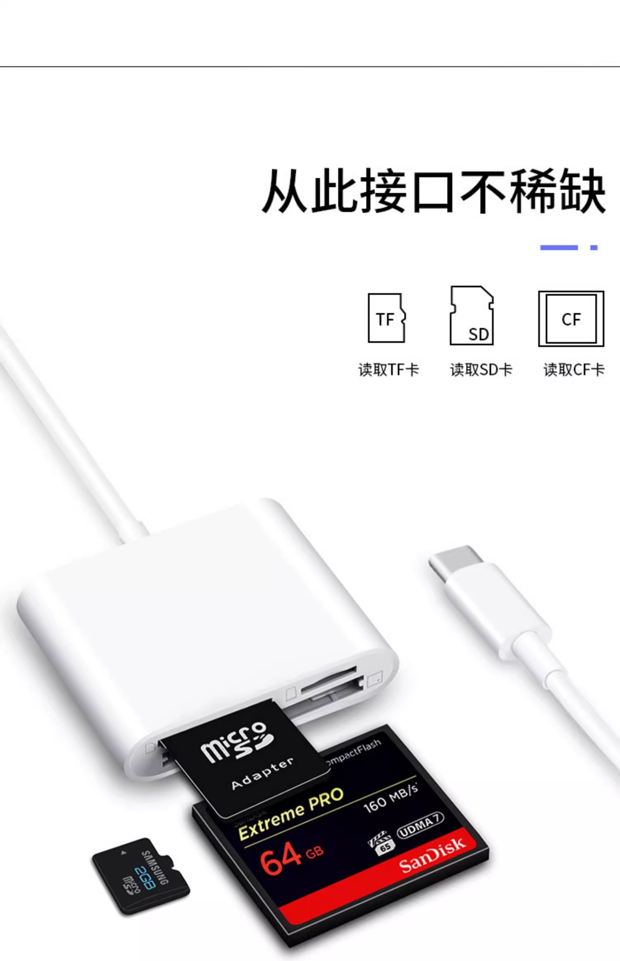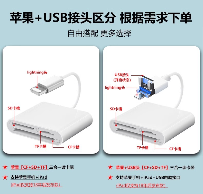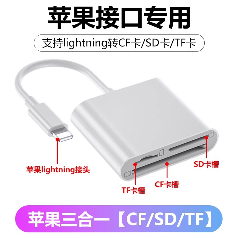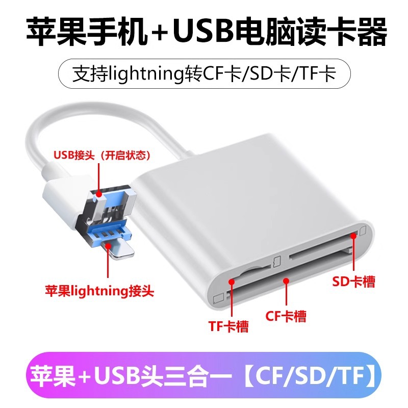 | 顔色 | 適用蘋果+TypeC+USB掛繩款【雙頭CF-3合1】讀卡器【CF卡/TF卡/SD卡】手機*電腦兩用 |