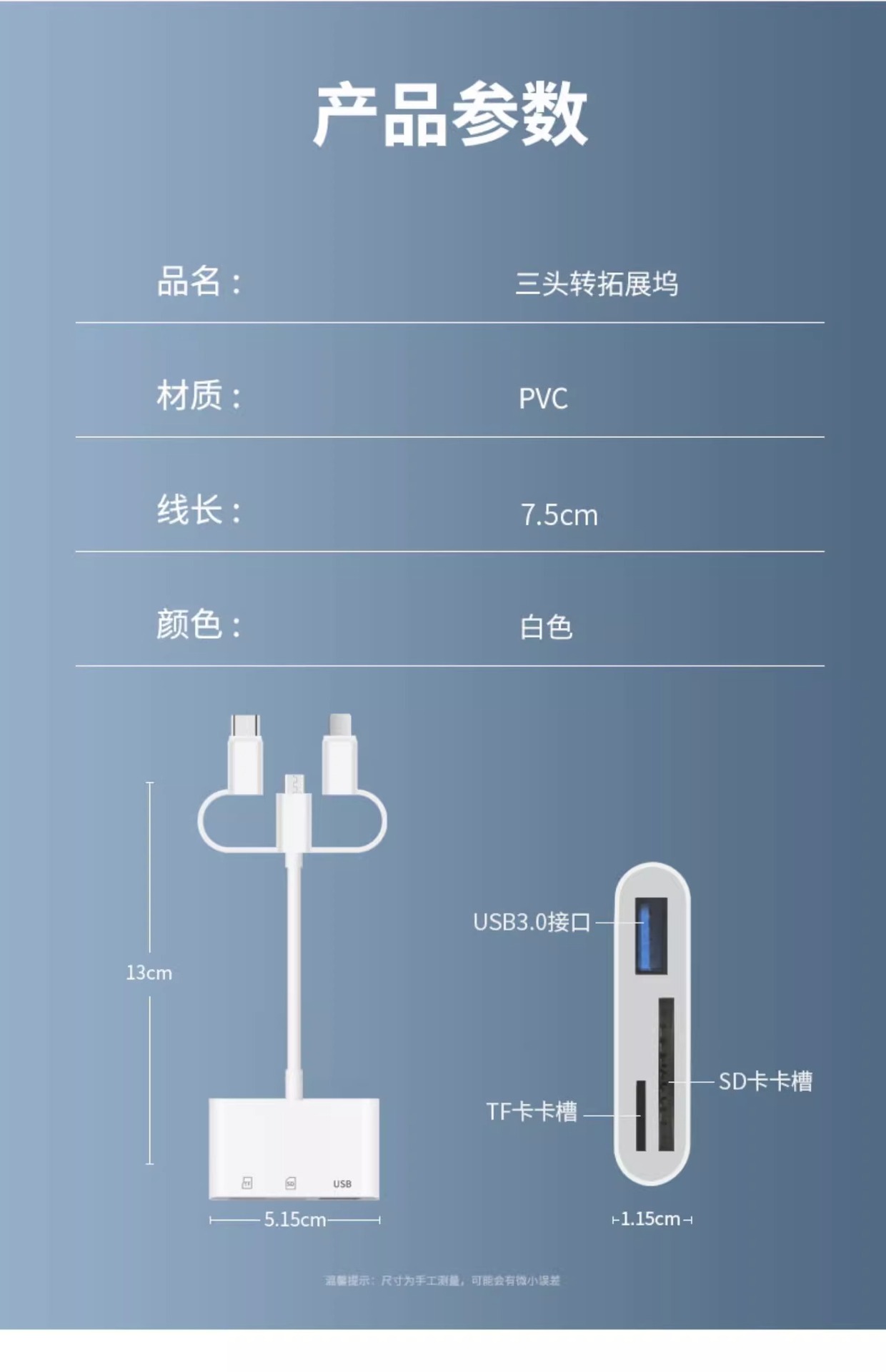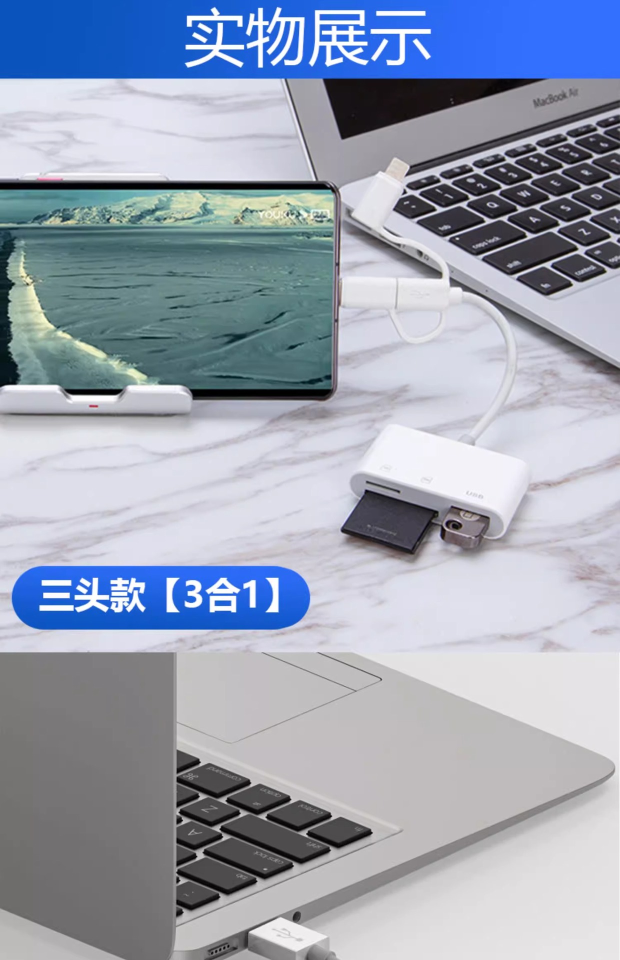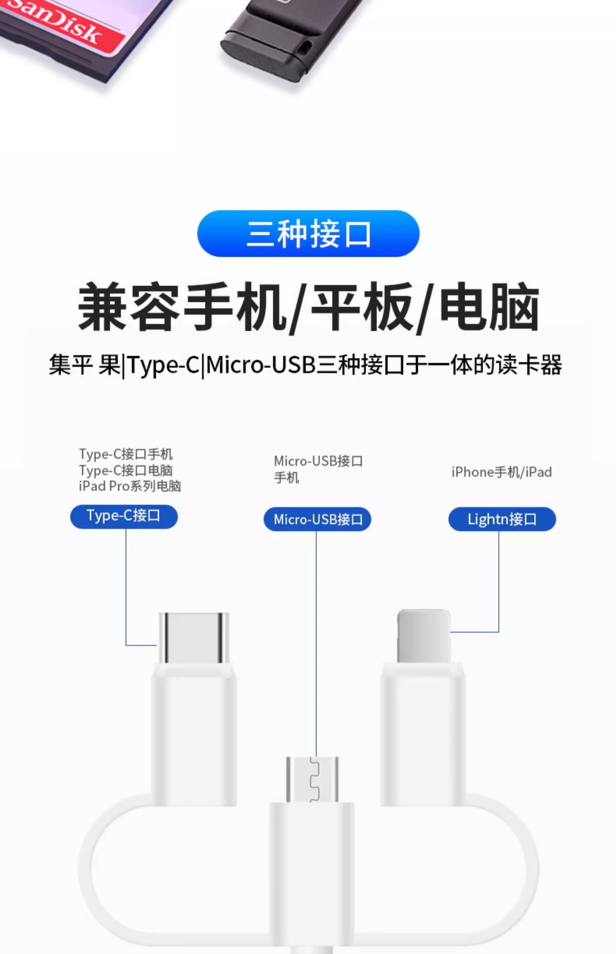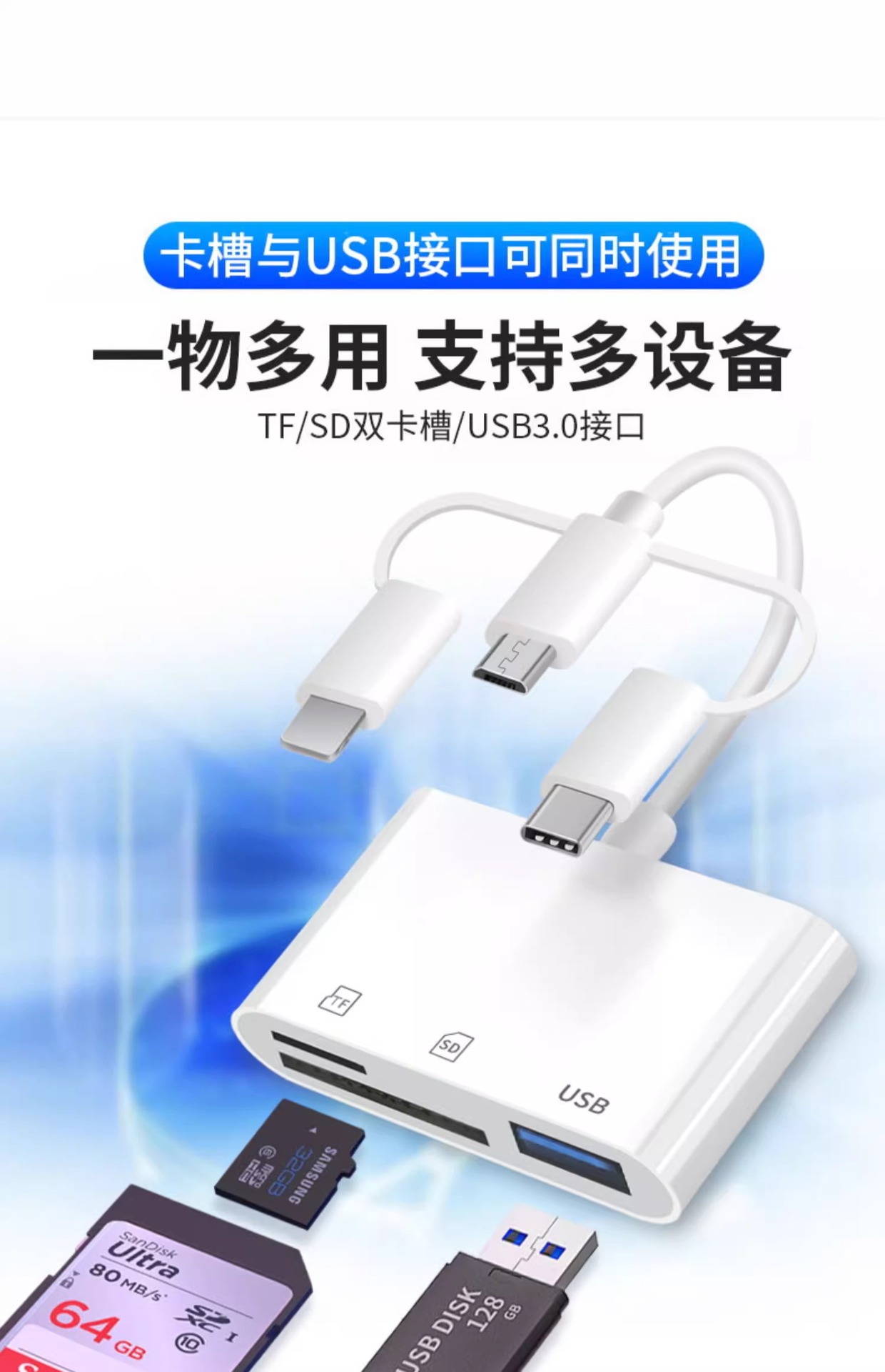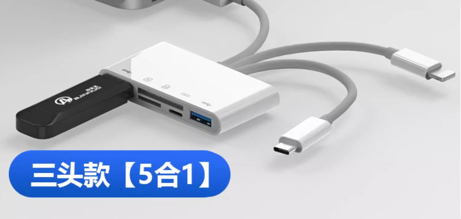 | 顔色 | 三頭5合1讀卡器【SD/TF卡/充電/2*USB】手機/電腦兩用 |