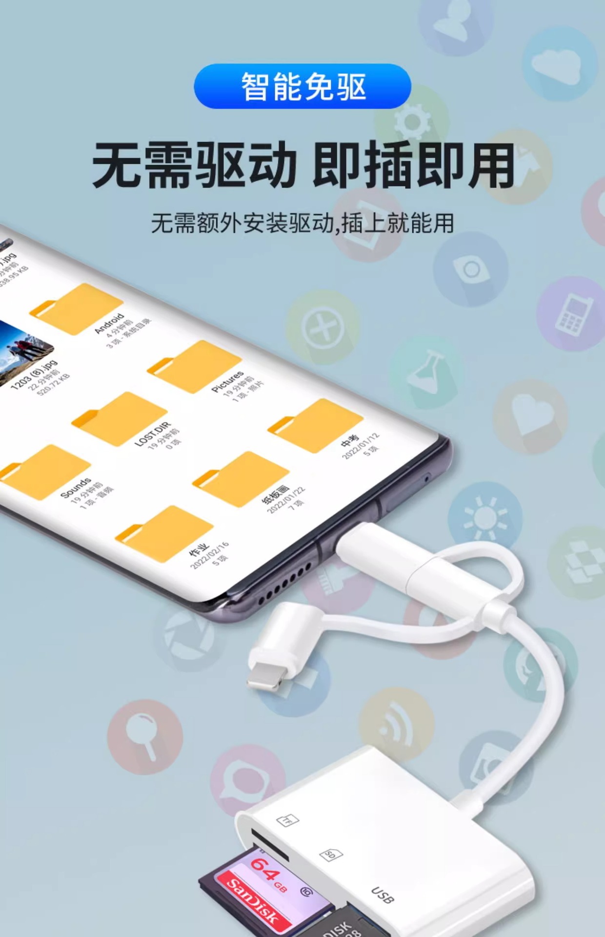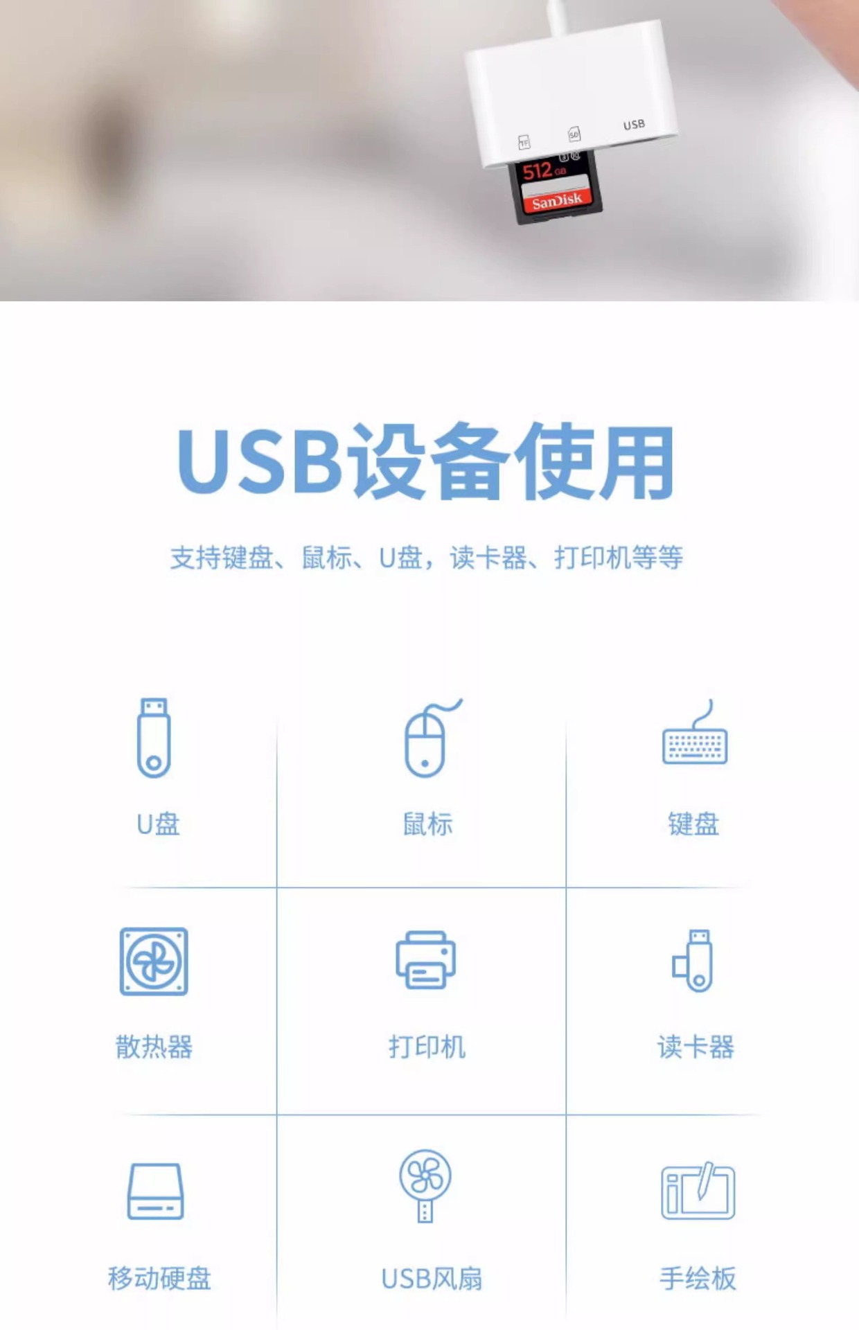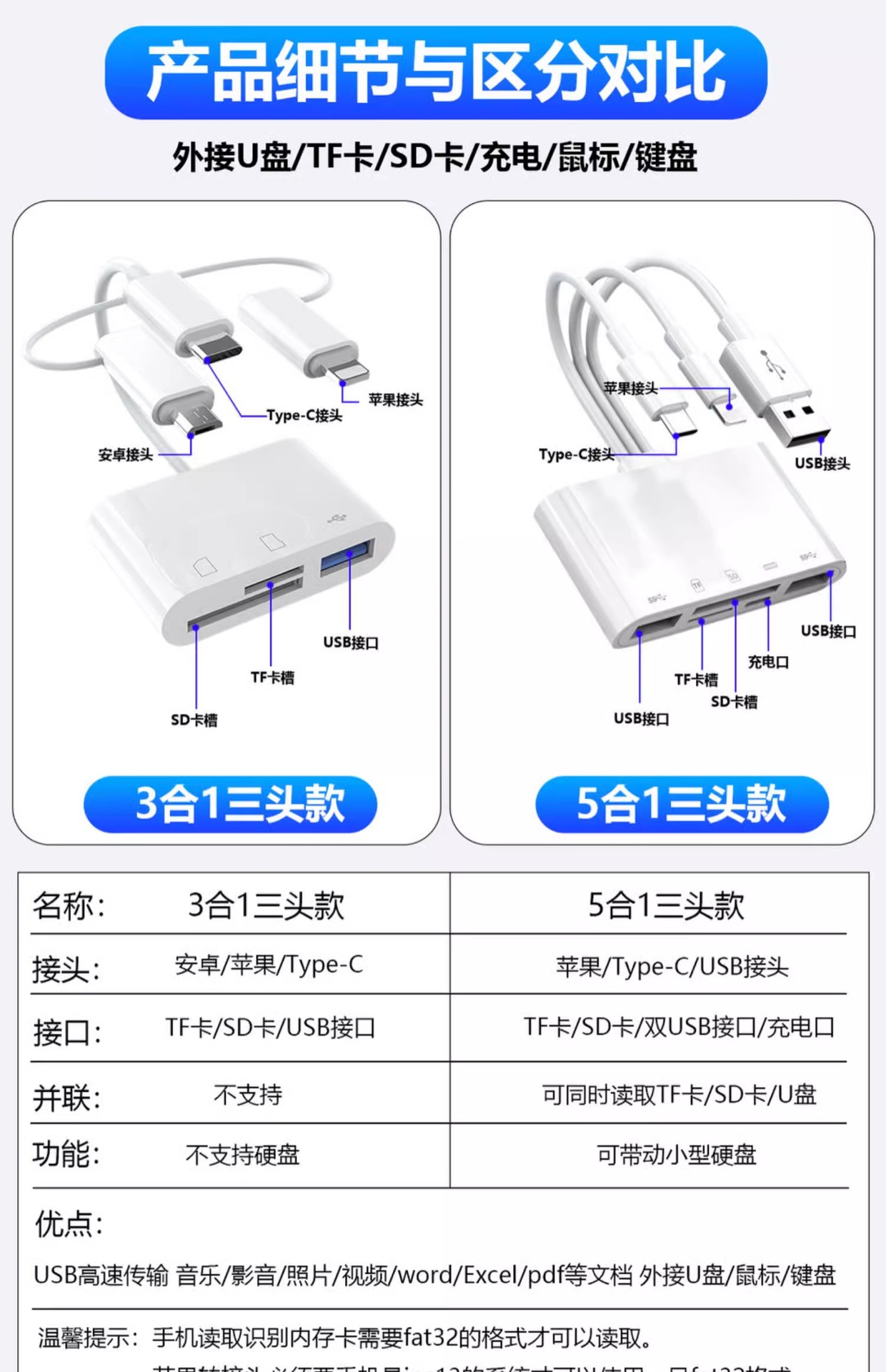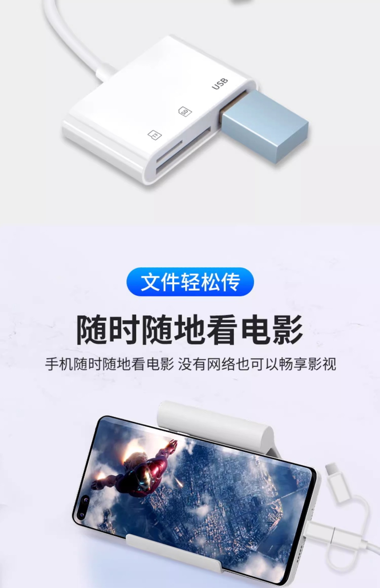 | 顔色 | 三頭5合1讀卡器【SD/TF卡/充電/2*USB】手機/電腦兩用 |
