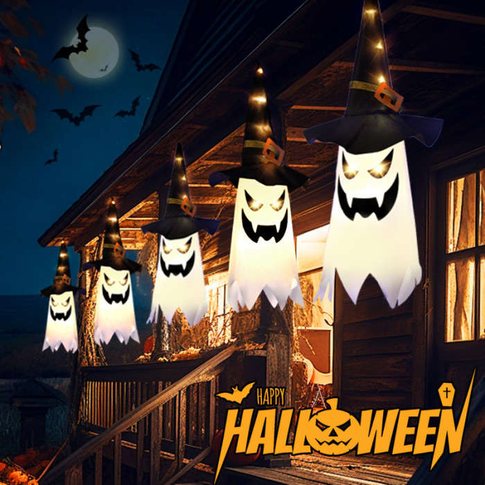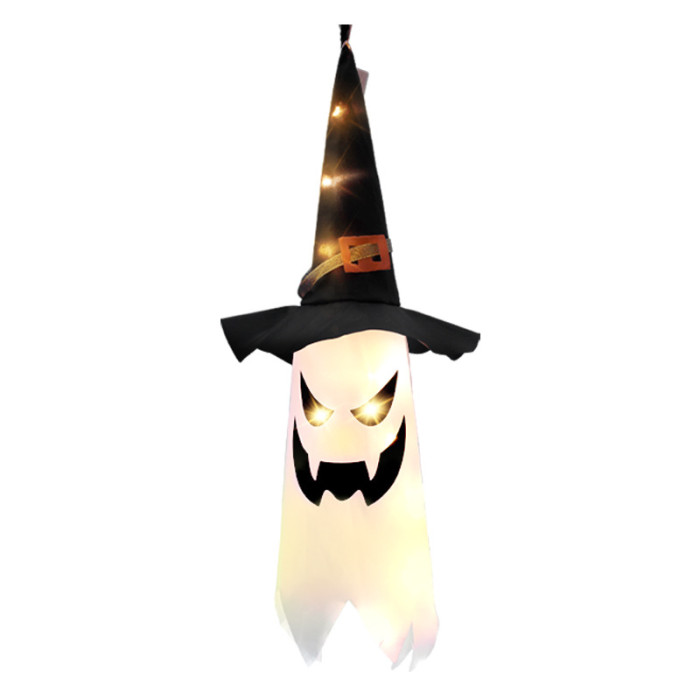 萬聖節裝飾布藝巫師帽幽靈掛飾led彩燈鬼節氛圍發光室內布置道具