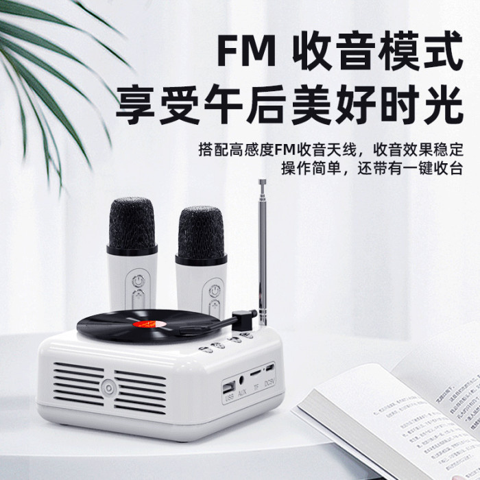 原子黑膠唱片機k歌藍牙音箱雙麥克風創意復古畱聲音響收音機話筒