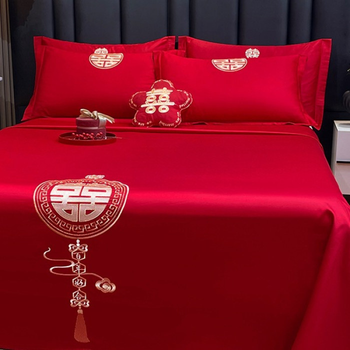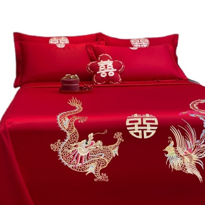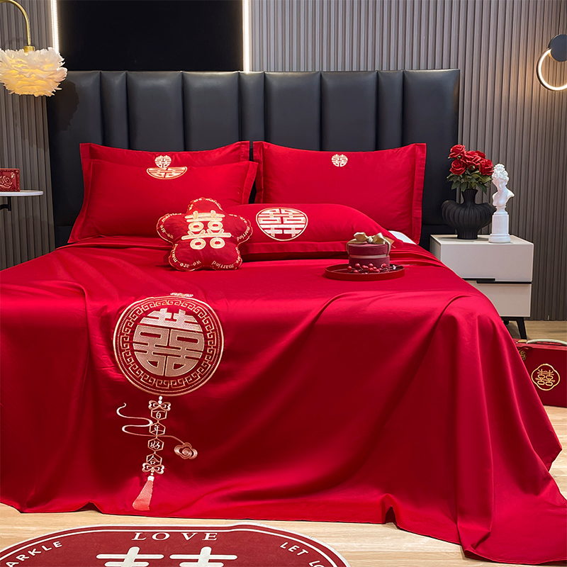 大紅色婚慶床單單件結婚用喜慶龍鳳枕套三件套喜字刺綉酒店新婚嫁
