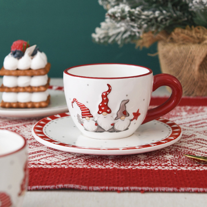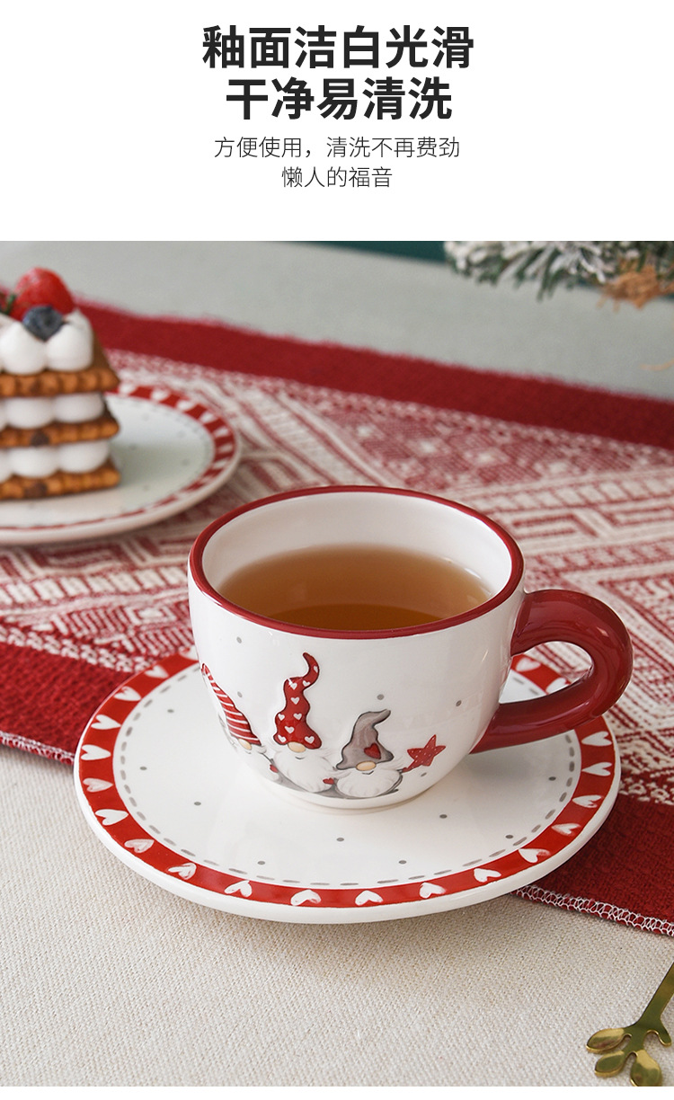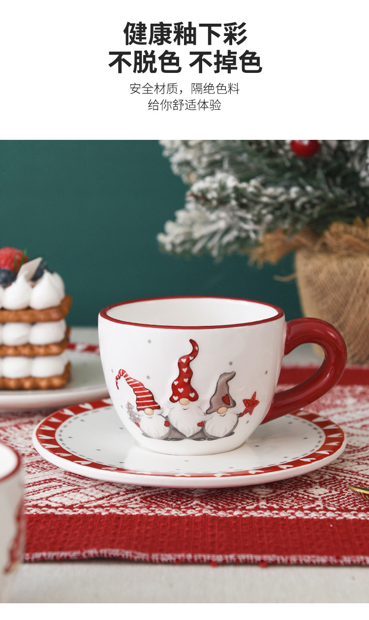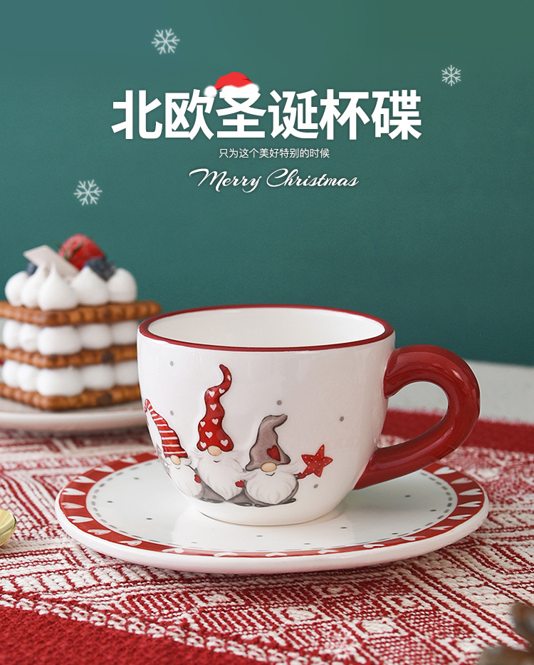 北歐聖誕老人陶瓷杯碟西式咖啡杯碟高顔值下午茶杯子浮雕杯加碟