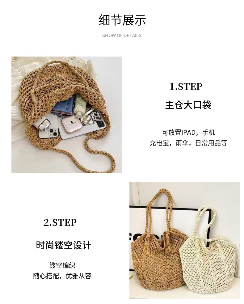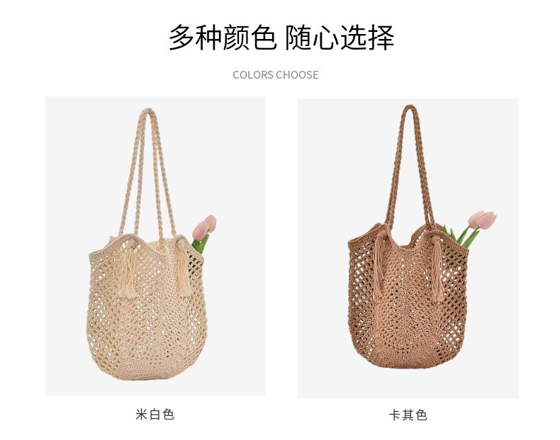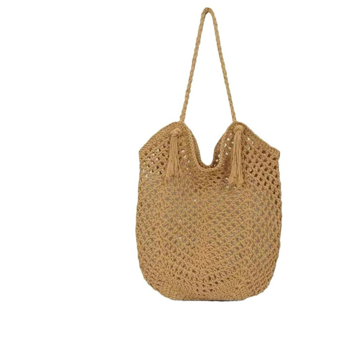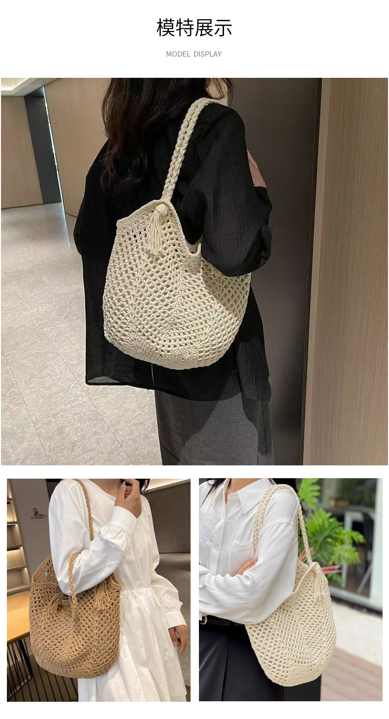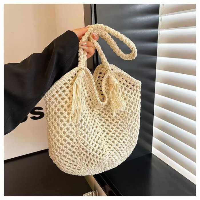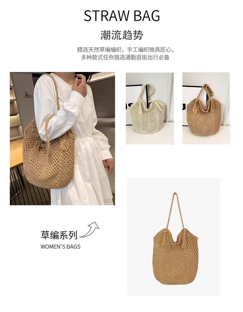 新款棉線草編包女包流蘇手工編織包包大容量托特包度假沙灘包女