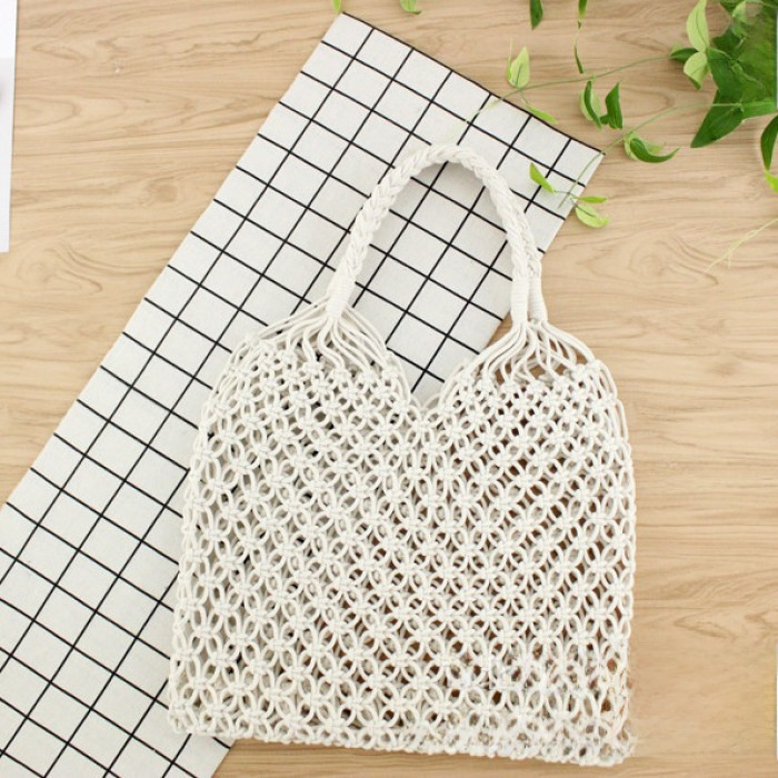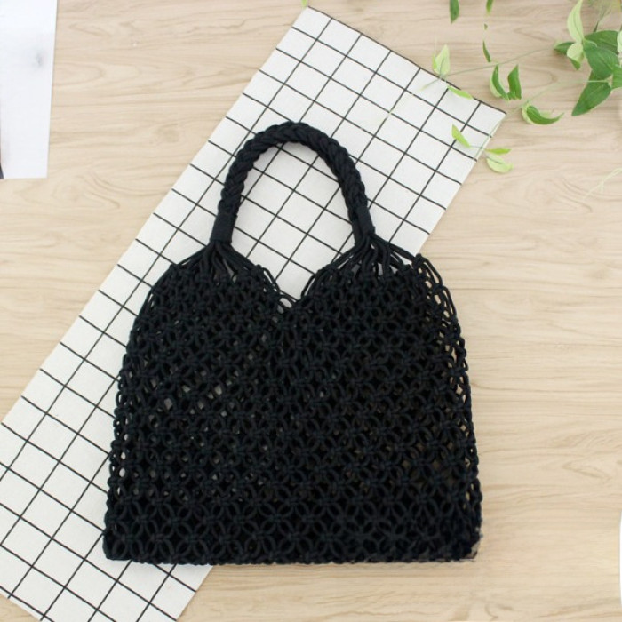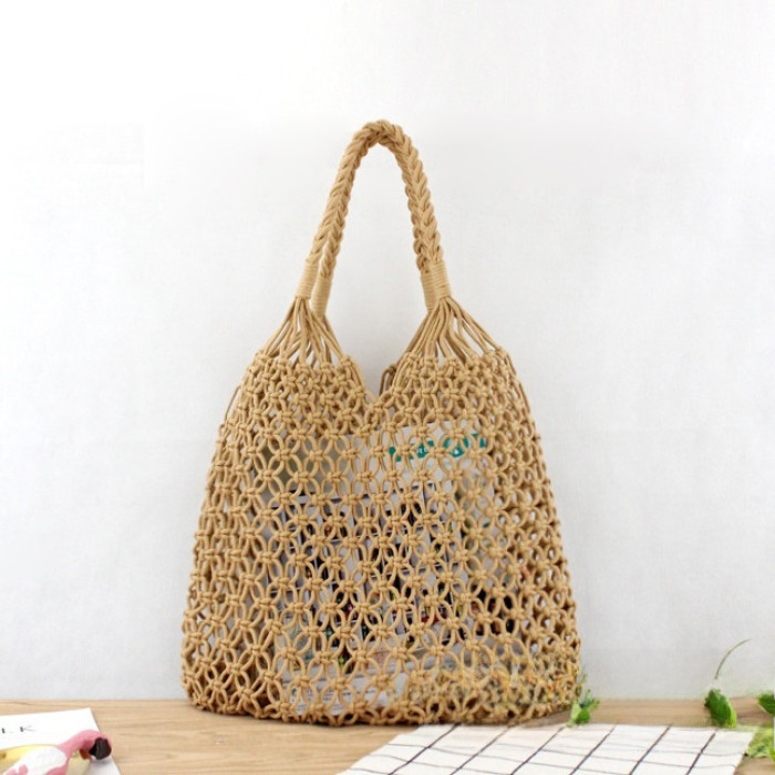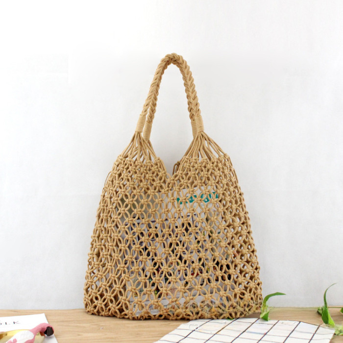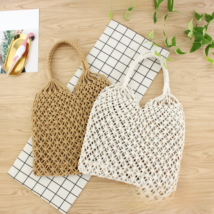 銅錢釦手工棉線包手系網格鏤空無內襯草編包休閒編織包