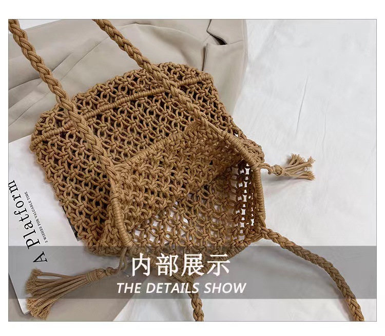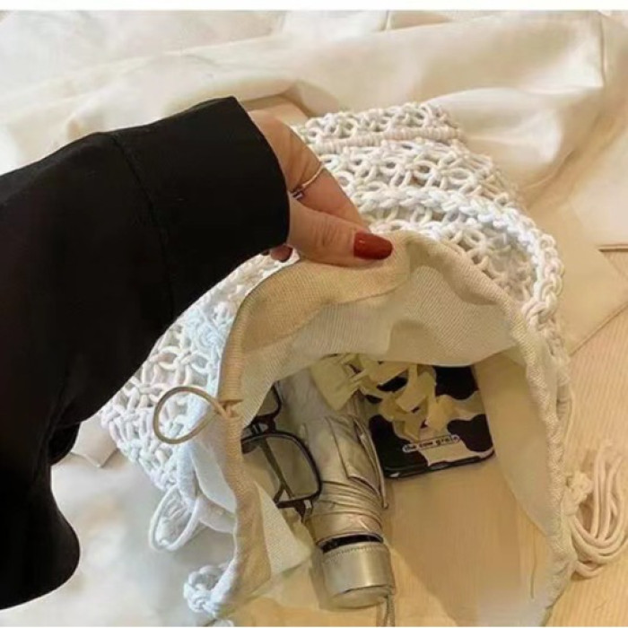 鏤空棉線編織包新款單肩流蘇草編包度假風沙灘包百搭女包